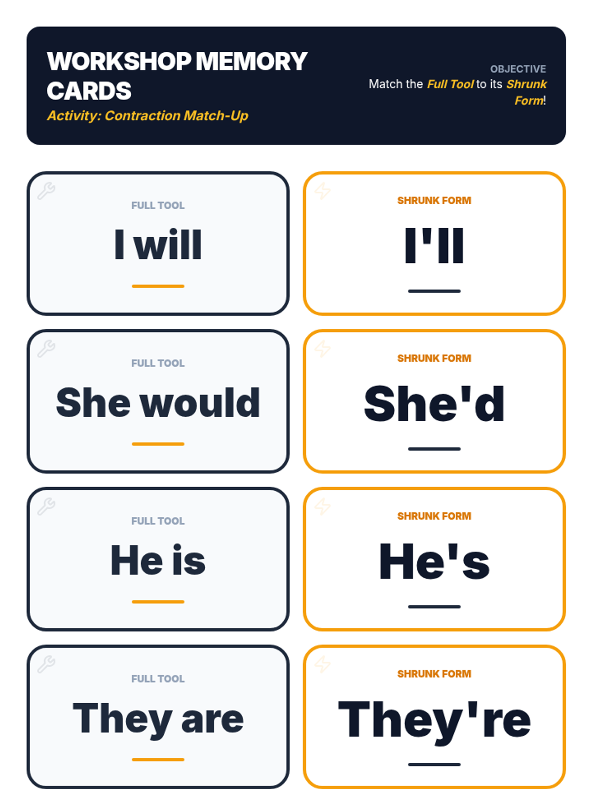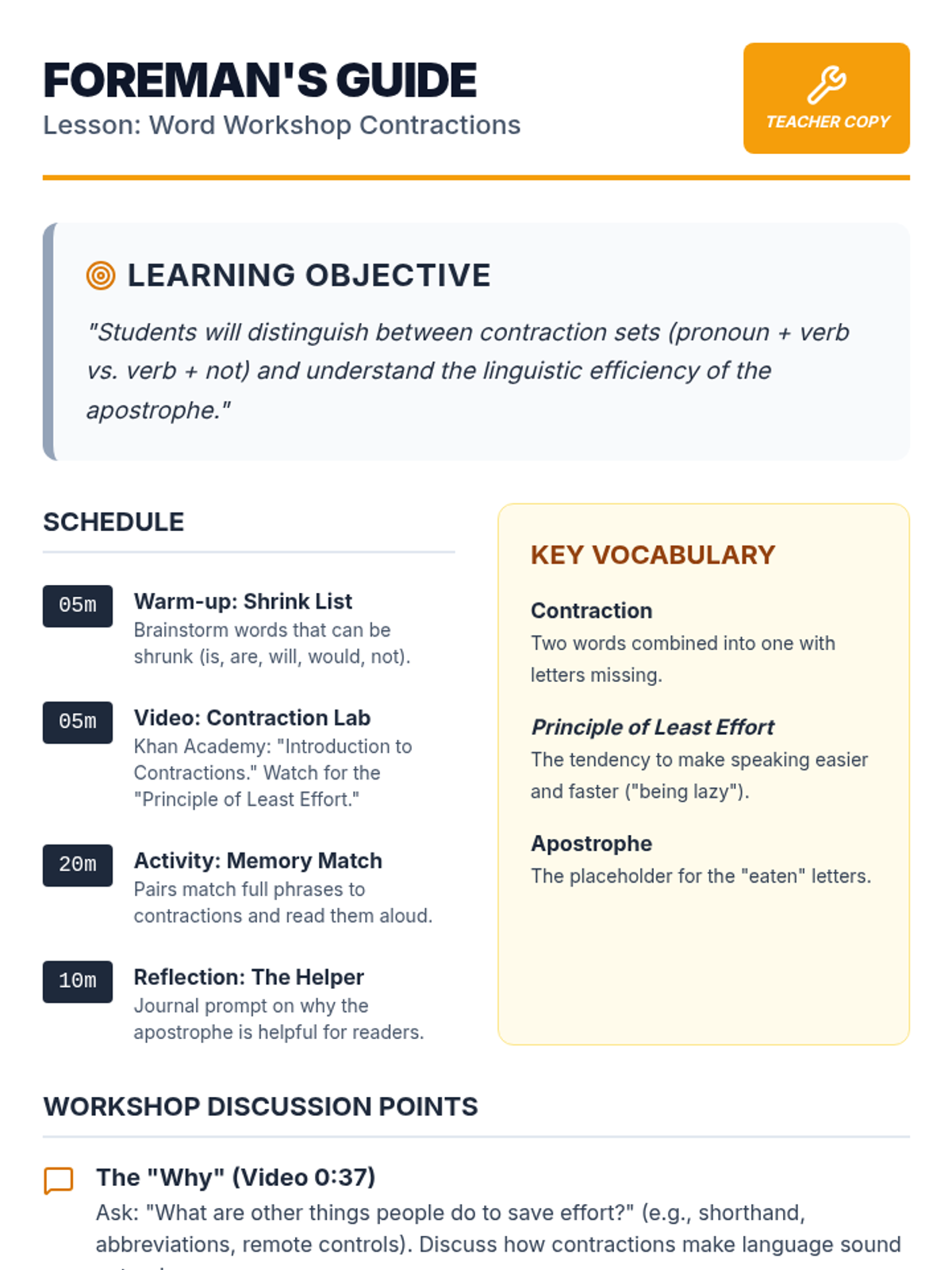 Students explore the linguistic 'Principle of Least Effort' to understand why we use contractions, specifically distinguishing between pronoun-verb and verb-not combinations. The lesson includes a video-guided discussion, a collaborative memory game, and a reflective journaling session.