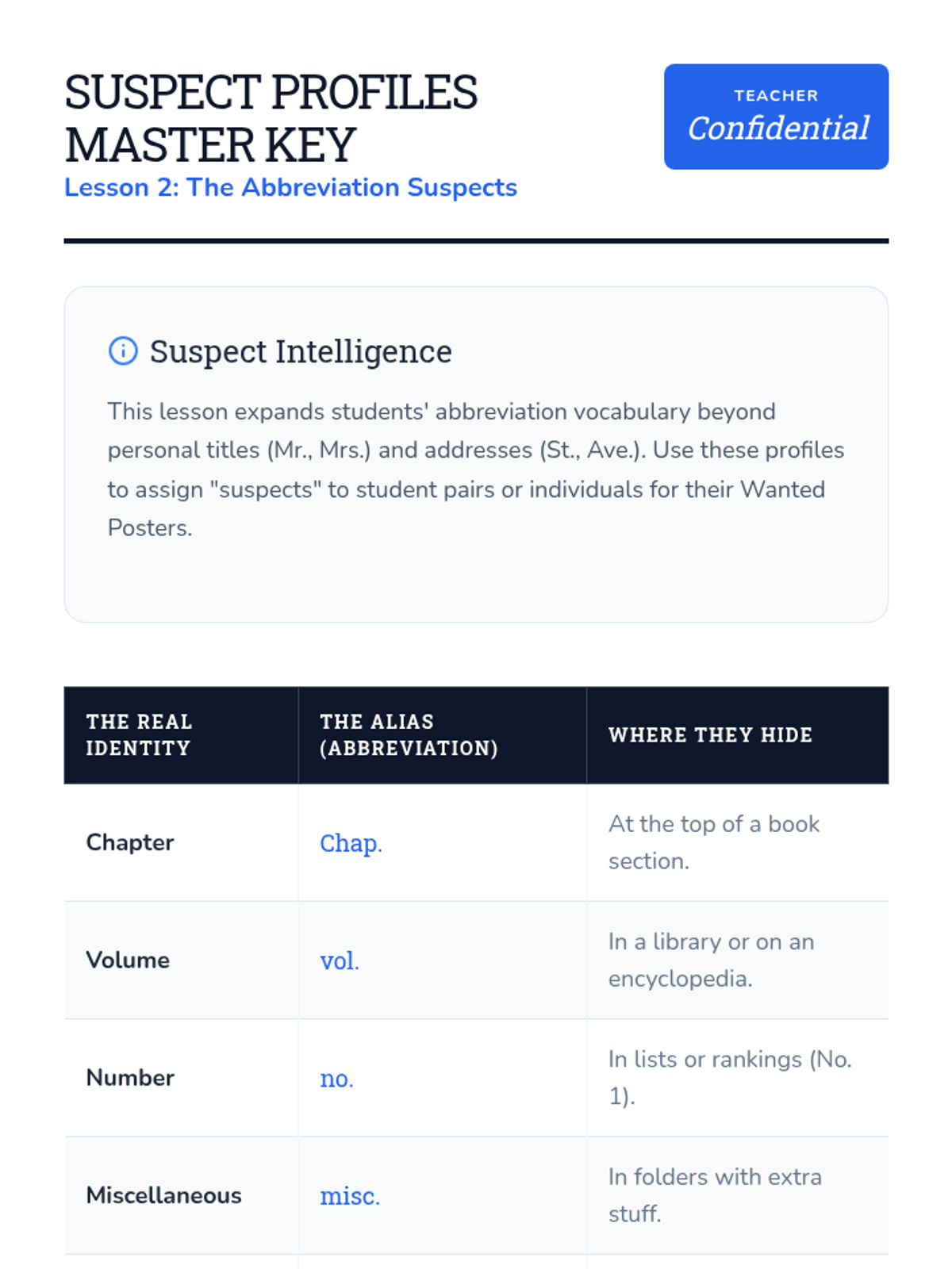 Students investigate common abbreviations (misc., vol., chap.) by creating wanted posters that link aliases (abbreviations) to their full names.