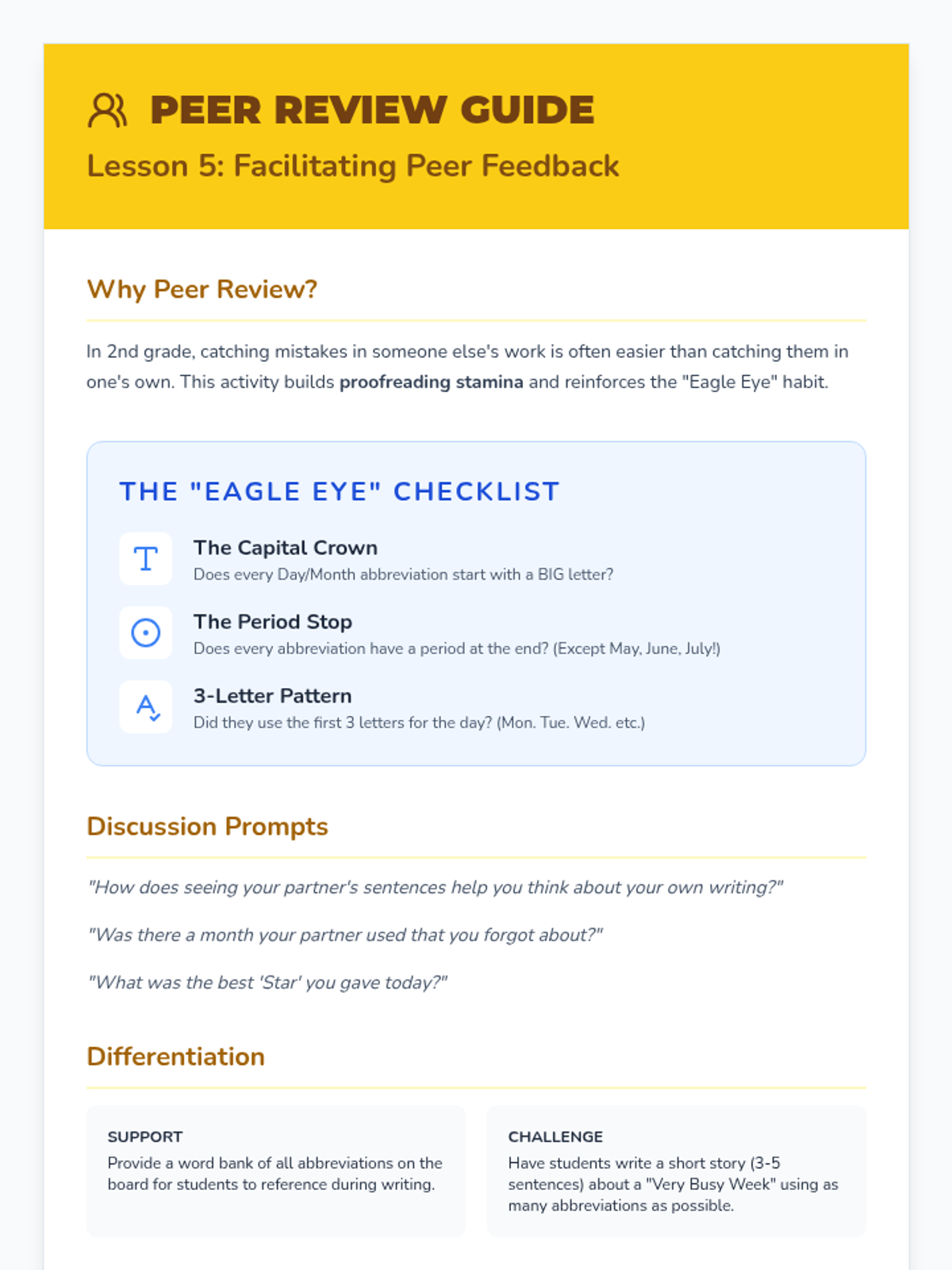 Students write sentences describing their weekly routine using abbreviations for days and months. Peer reviews focus on checking for the period at the end of the abbreviation.