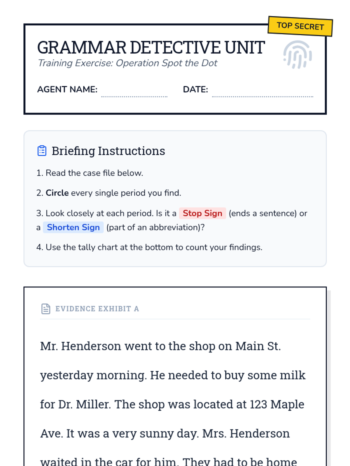 Students learn to distinguish between periods used as 'Stop Signs' (end of sentences) and 'Shorten Signs' (abbreviations) through a detective-themed investigation.