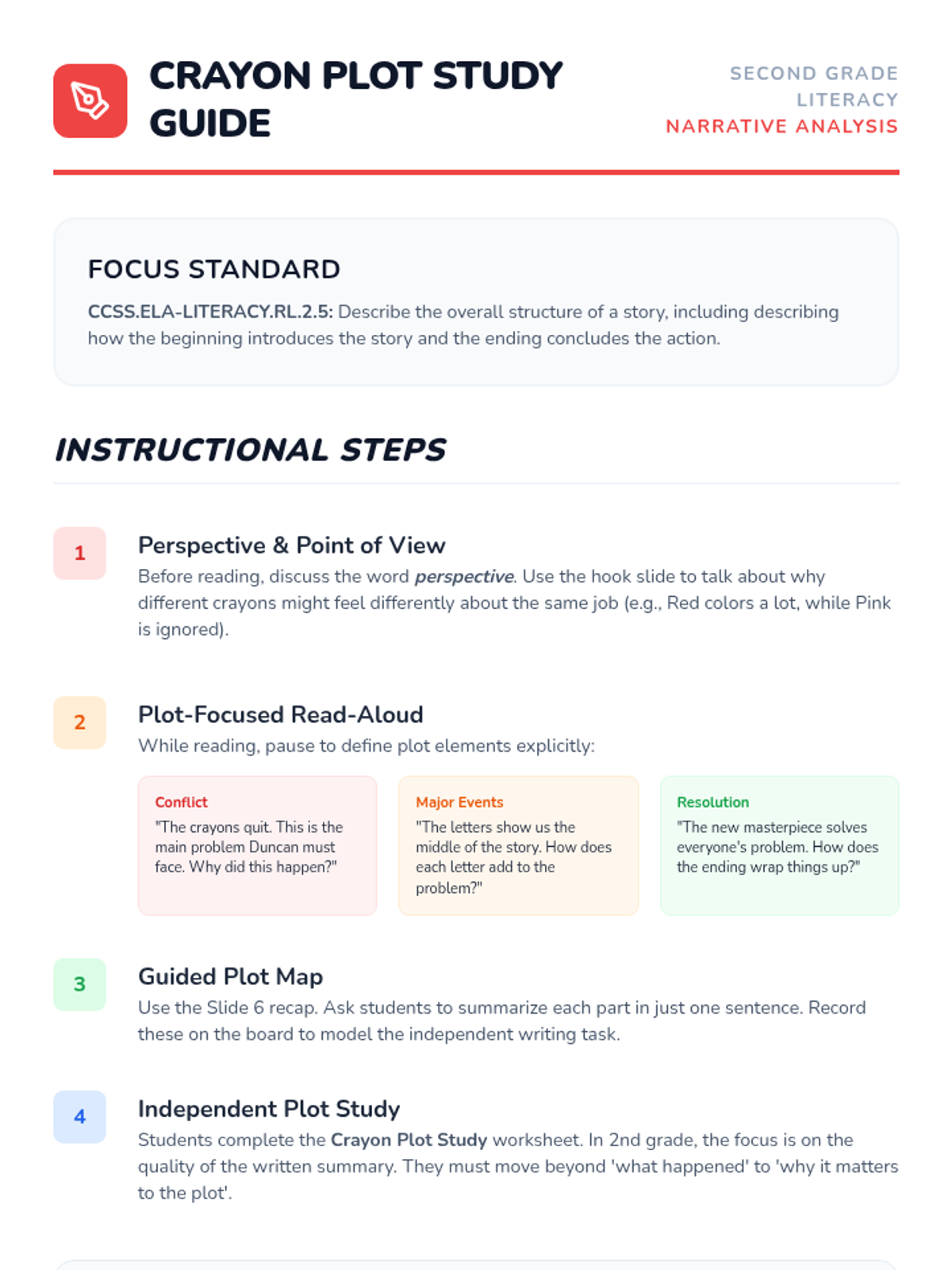 Students learn to identify key building blocks in a text by looking for 'clues' that answer who, what, and where.