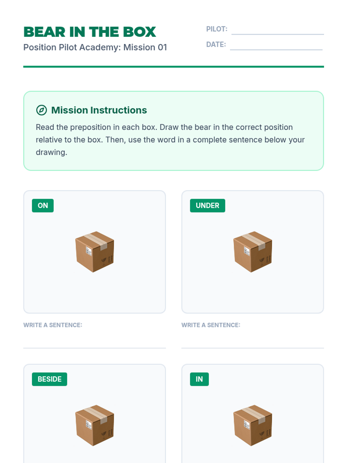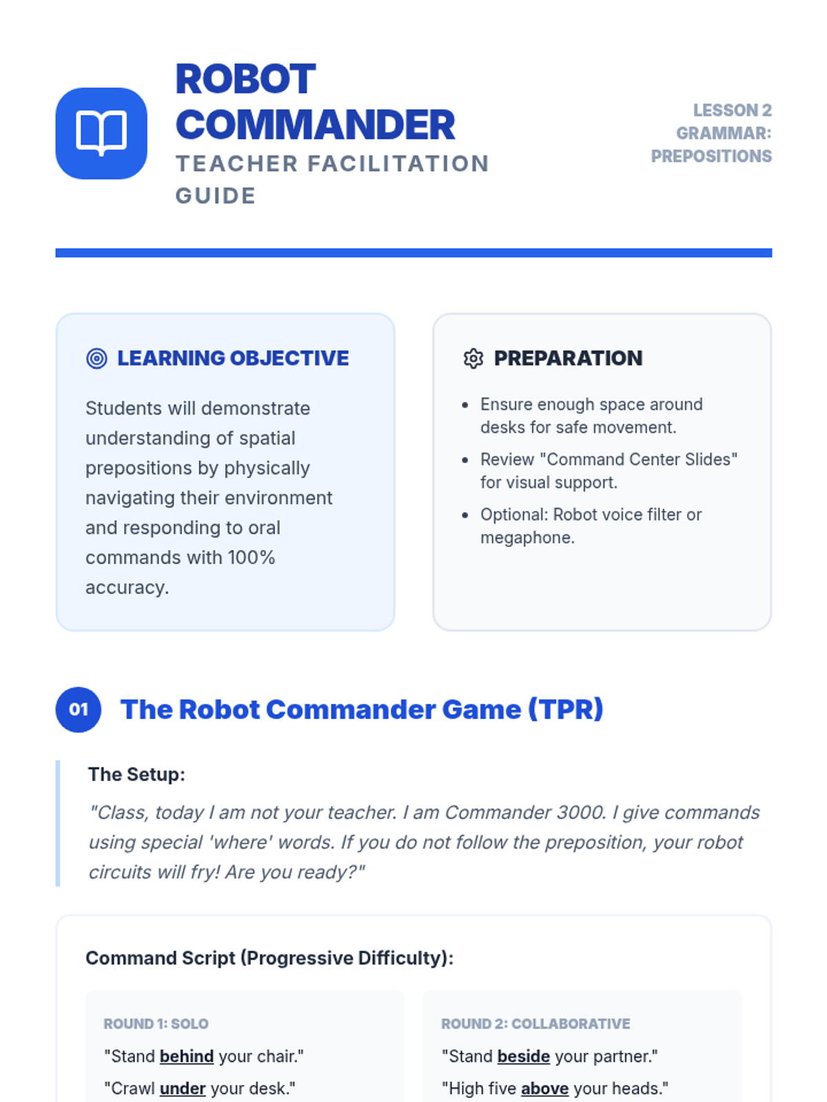 A kinesthetic approach to prepositions where students use their bodies to demonstrate and follow spatial directions.