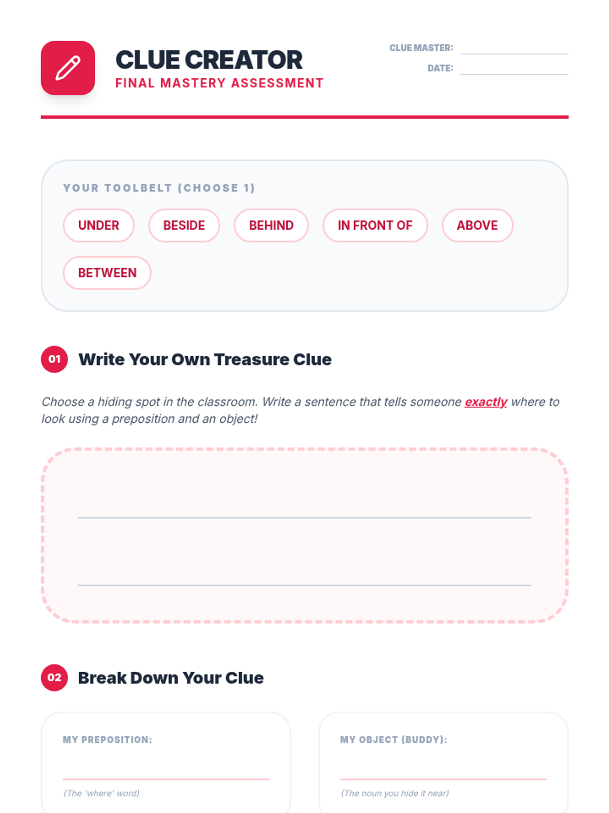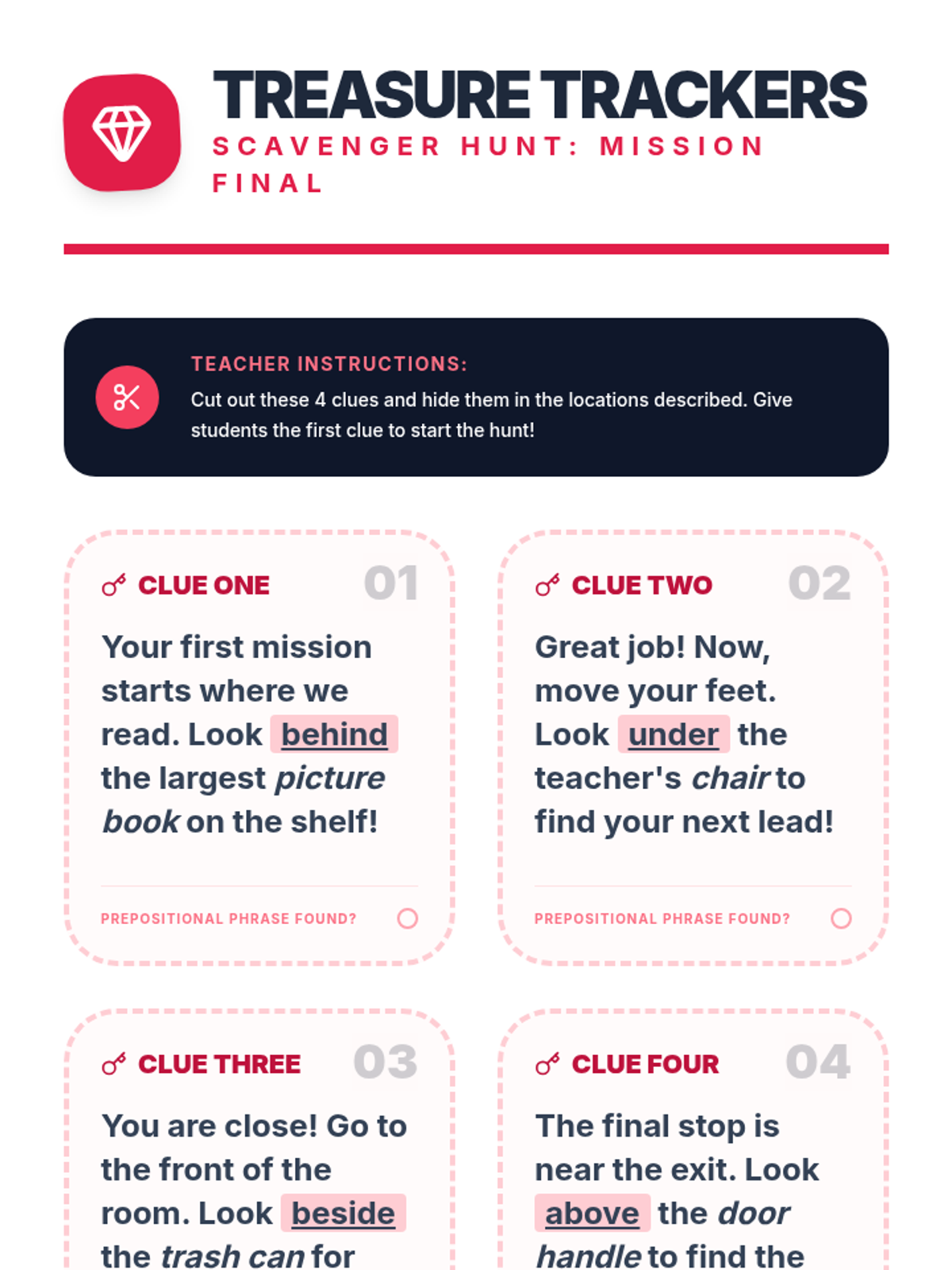 A cumulative scavenger hunt where students read and write complex spatial clues to solve a classroom mystery.
