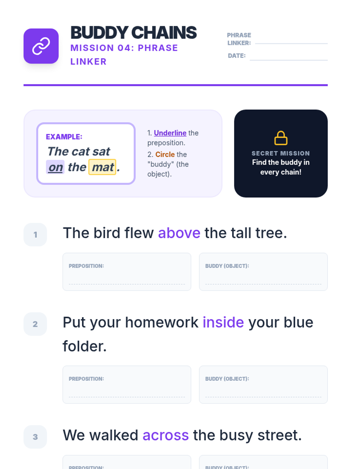 An analysis of the relationship between prepositions and nouns, identifying the 'buddy' or object that completes the phrase.
