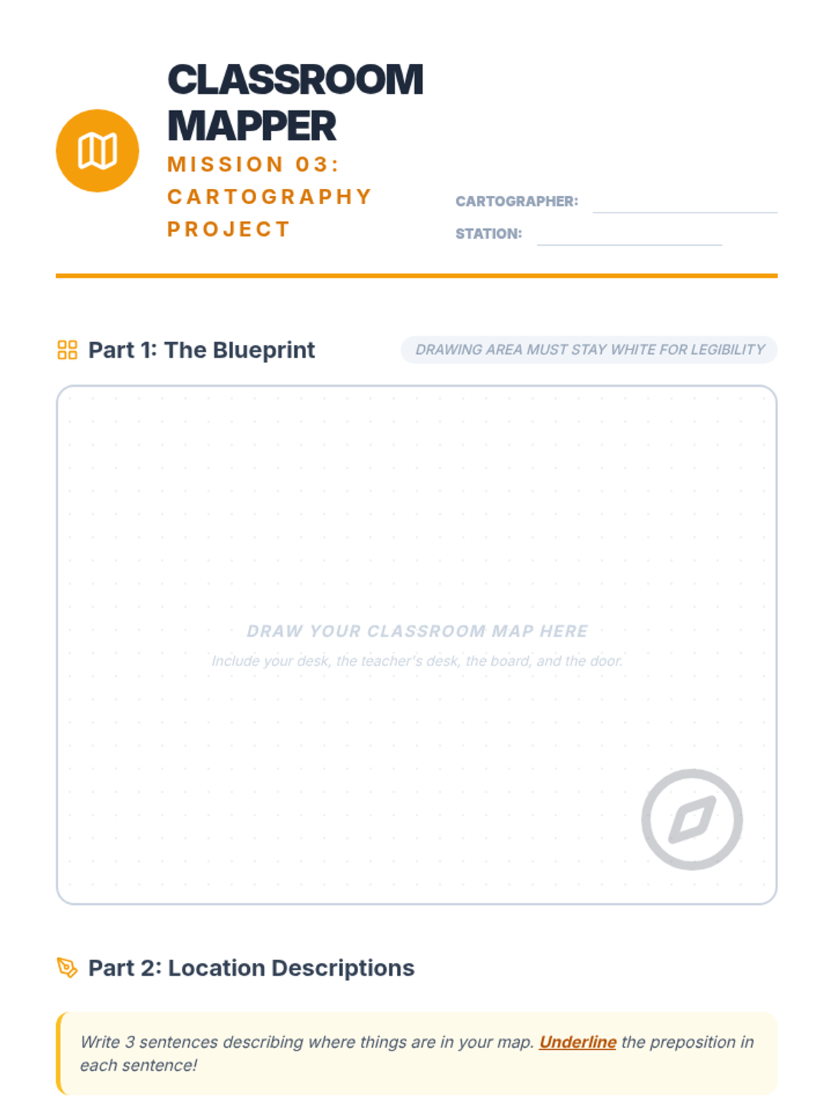 Applying prepositional knowledge to a classroom mapping project, bridging oral language and descriptive writing.