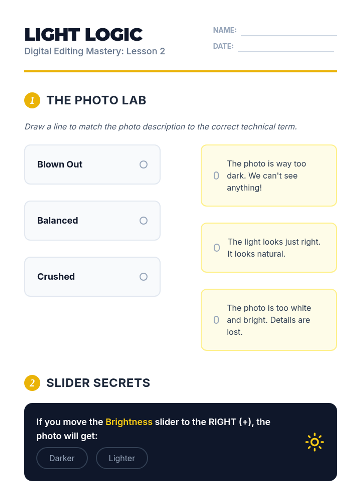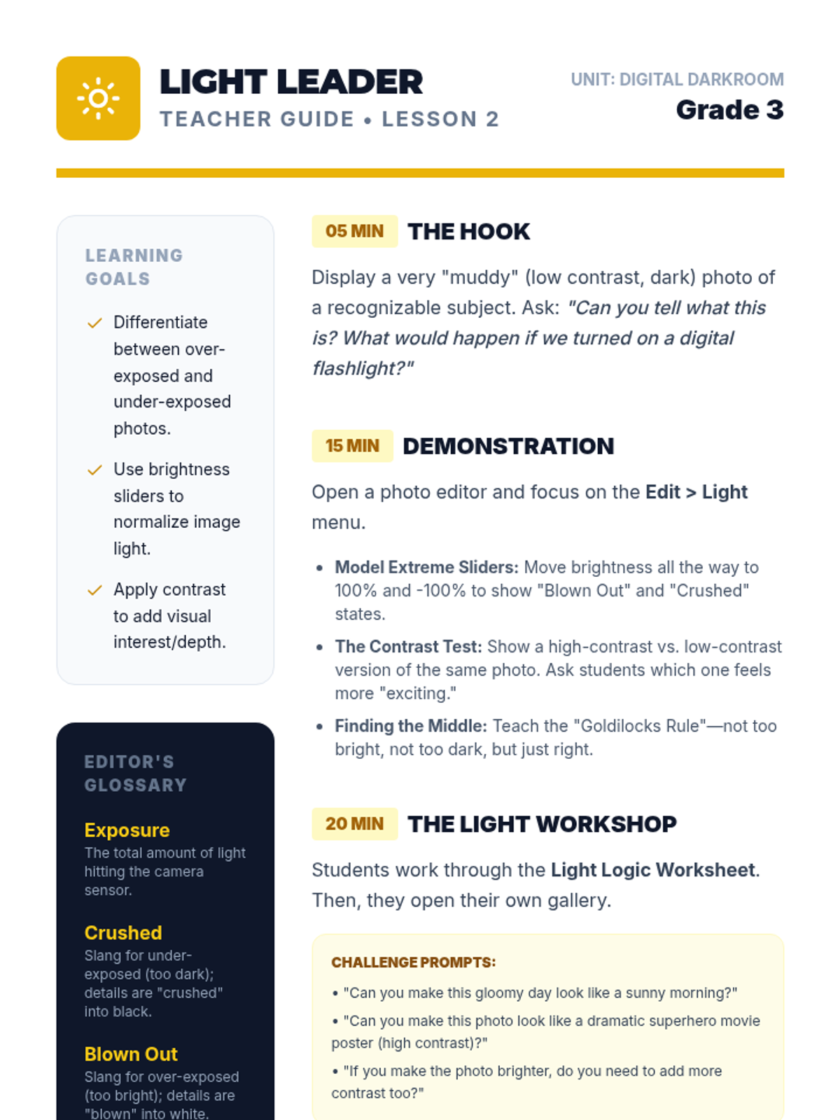 Using simple sliders, students adjust brightness and contrast to balance exposure, learning to identify 'blown out' or 'crushed' images.