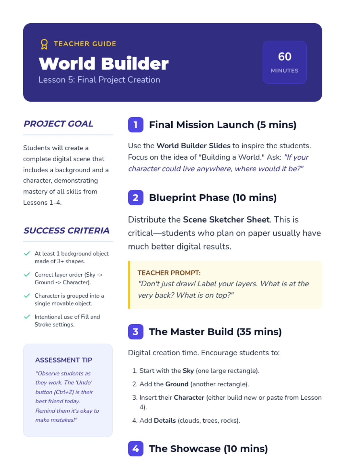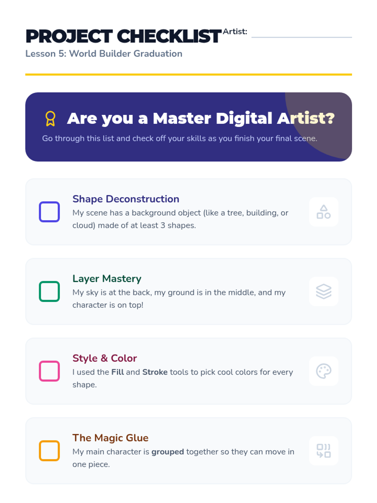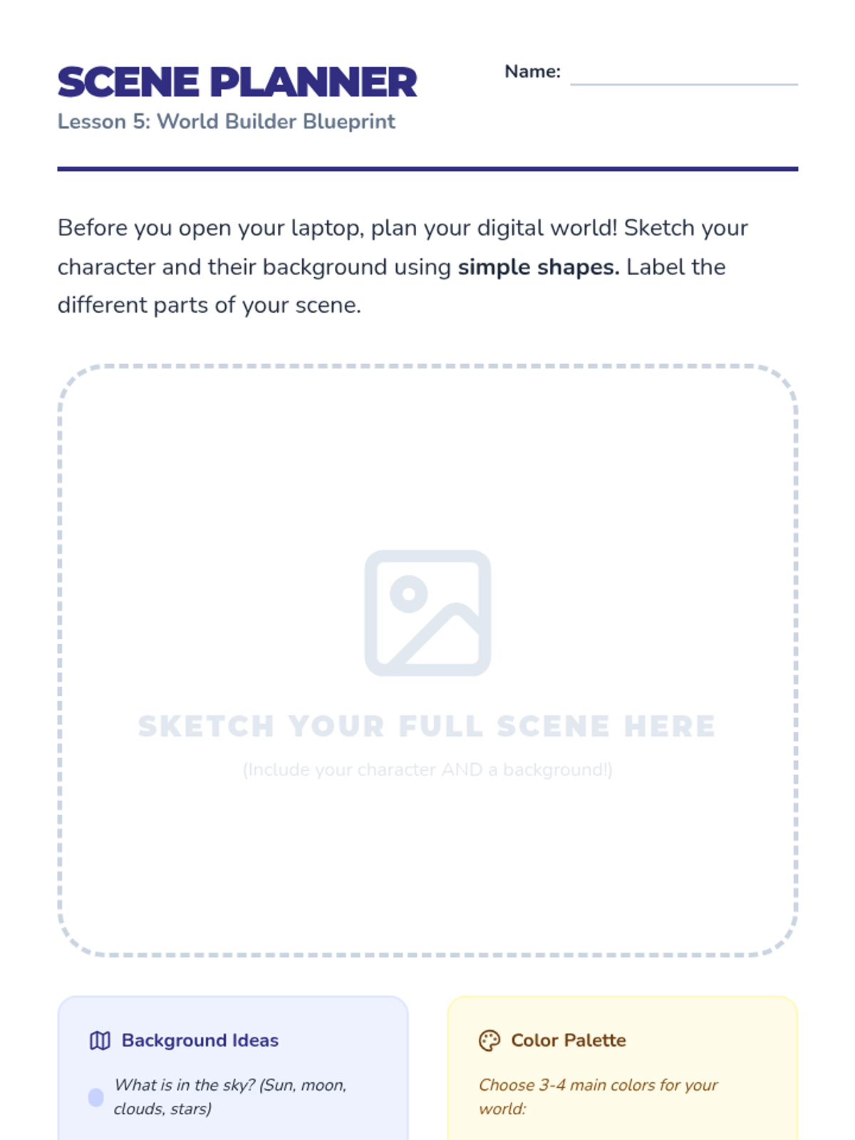 Students apply all learned skills to create a final digital scene featuring their character in a detailed environment.
