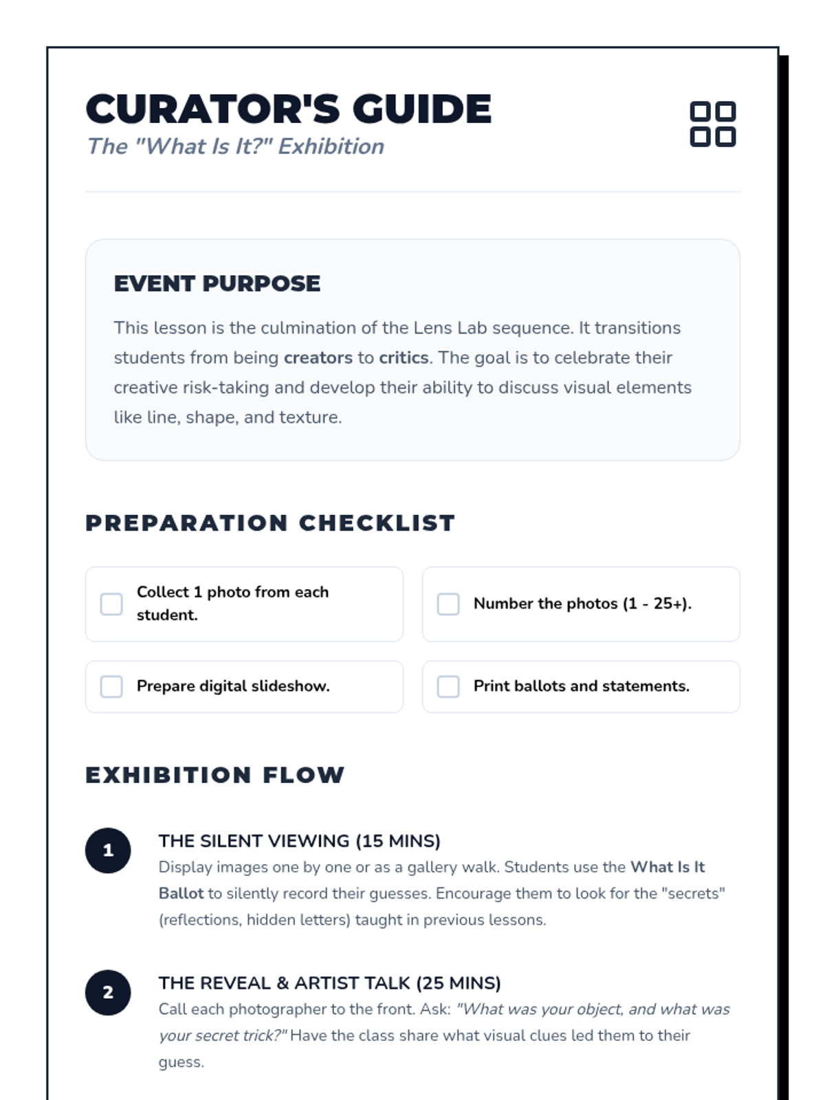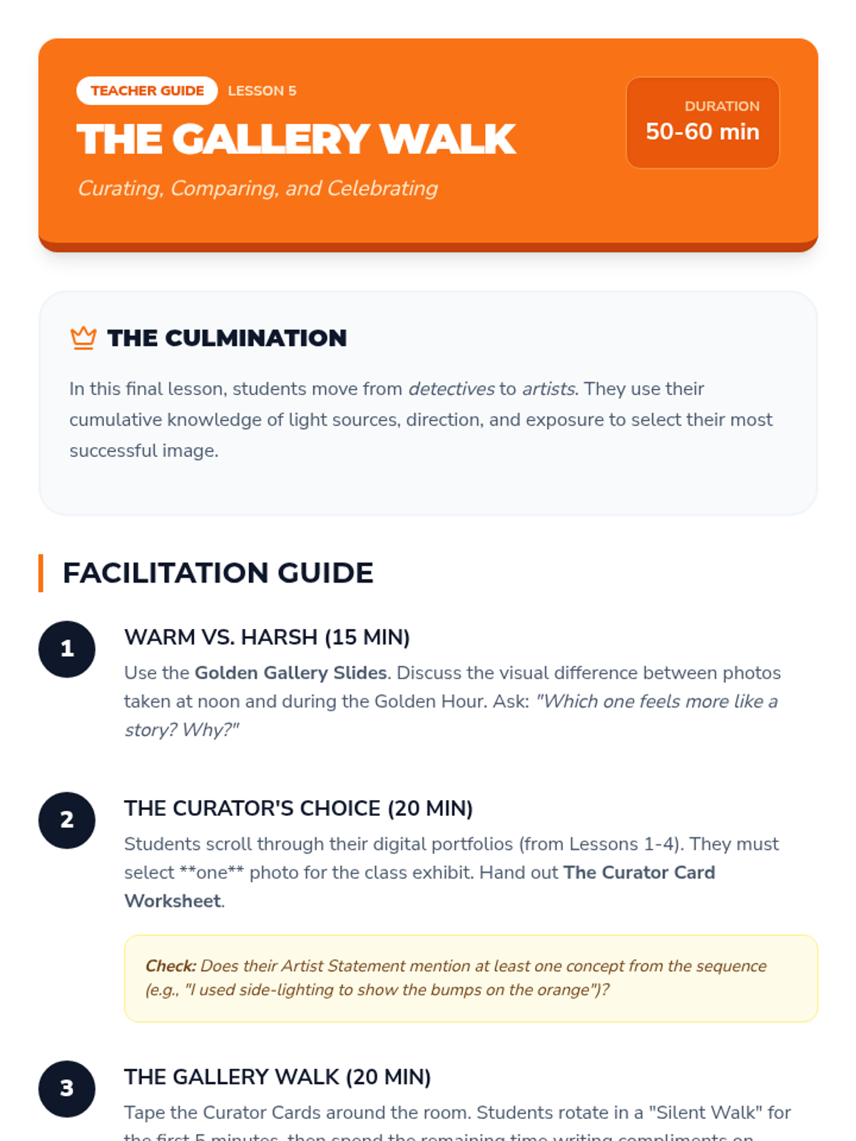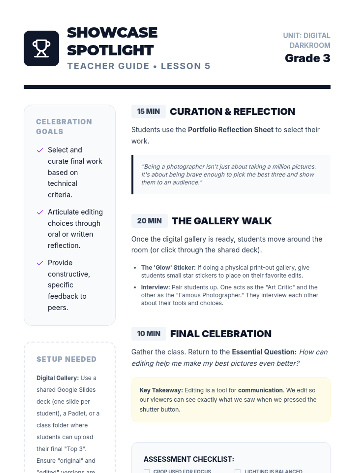Students select their best work, perform basic digital edits like cropping, and present their photo essays in a final gallery walk.