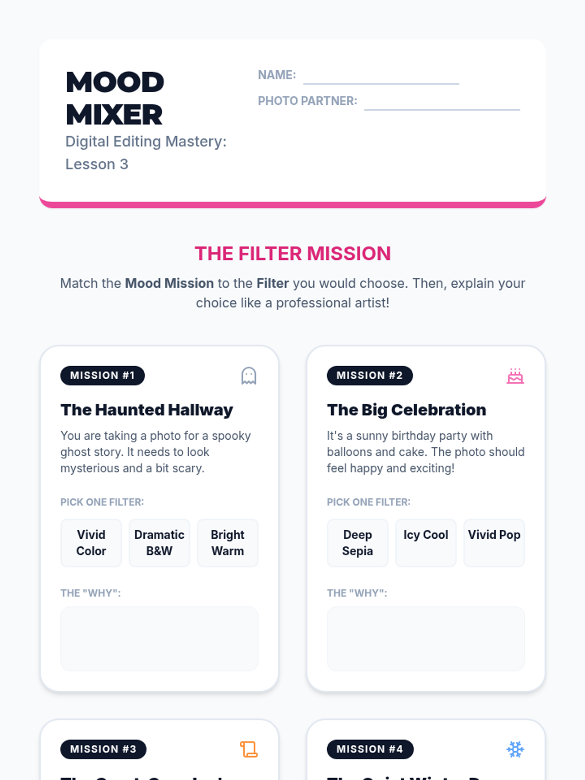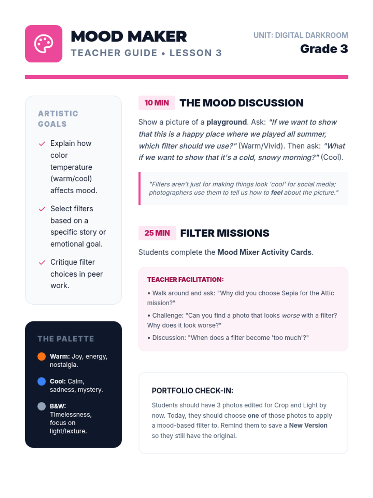 Students explore how color filters (B&W, sepia, cool/warm tones) change the feeling of a photo and discuss the artistic choices behind them.