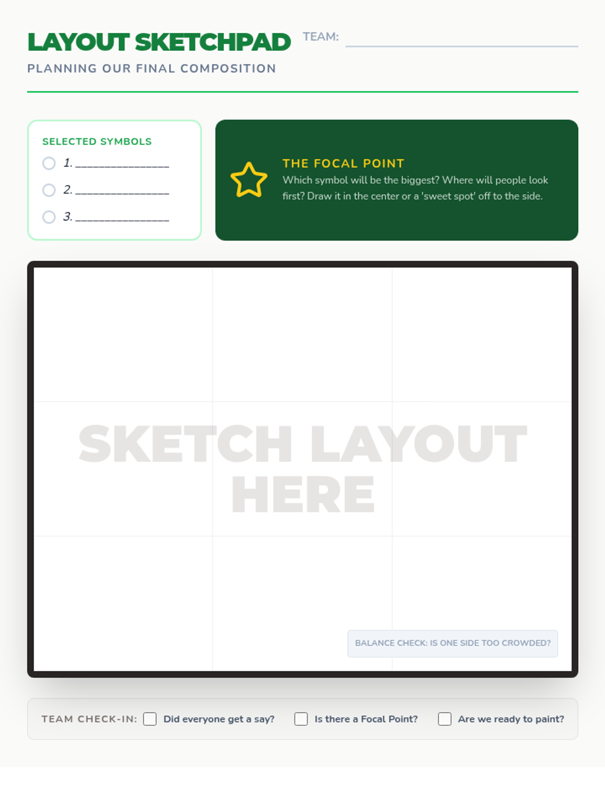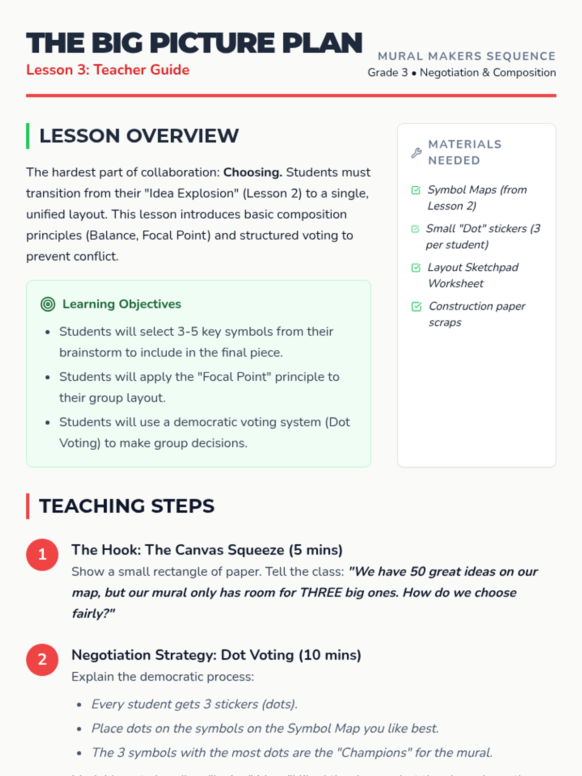 Students learn to negotiate and compromise as they select the best ideas from their brainstorming session to create a unified composition layout.