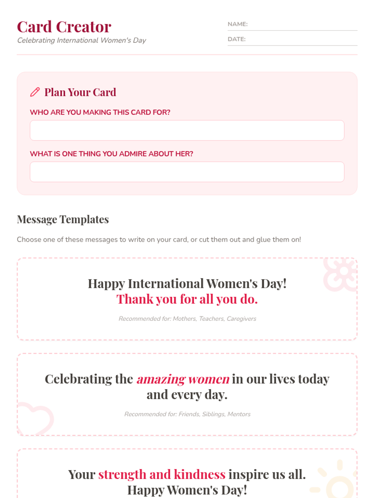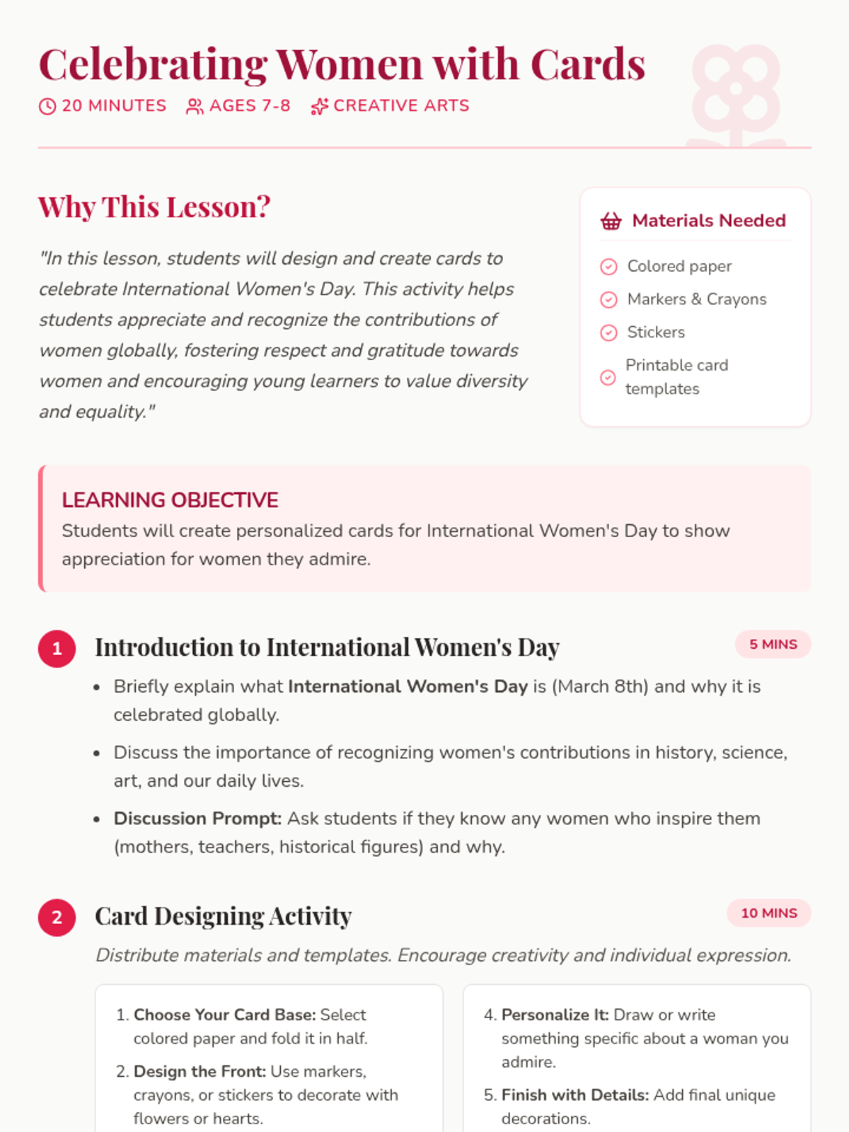 A lesson where students design and create cards to celebrate International Women's Day, fostering respect and gratitude towards women's contributions globally.