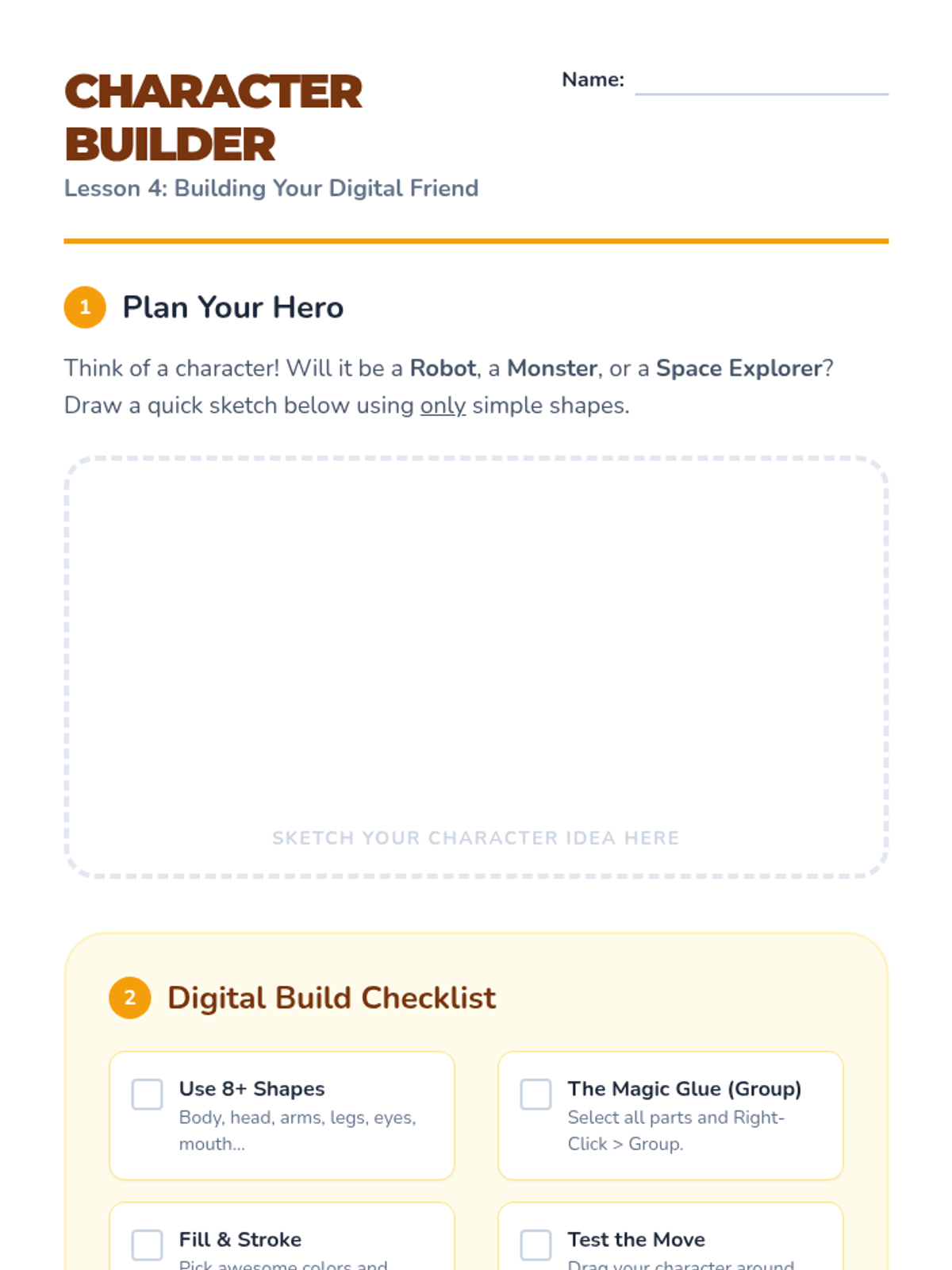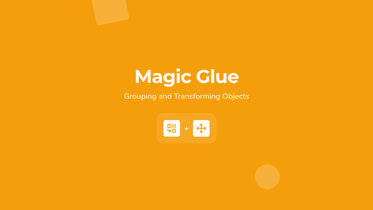 Students learn the 'group' function to combine shapes into a single movable character and practice resizing and rotating.