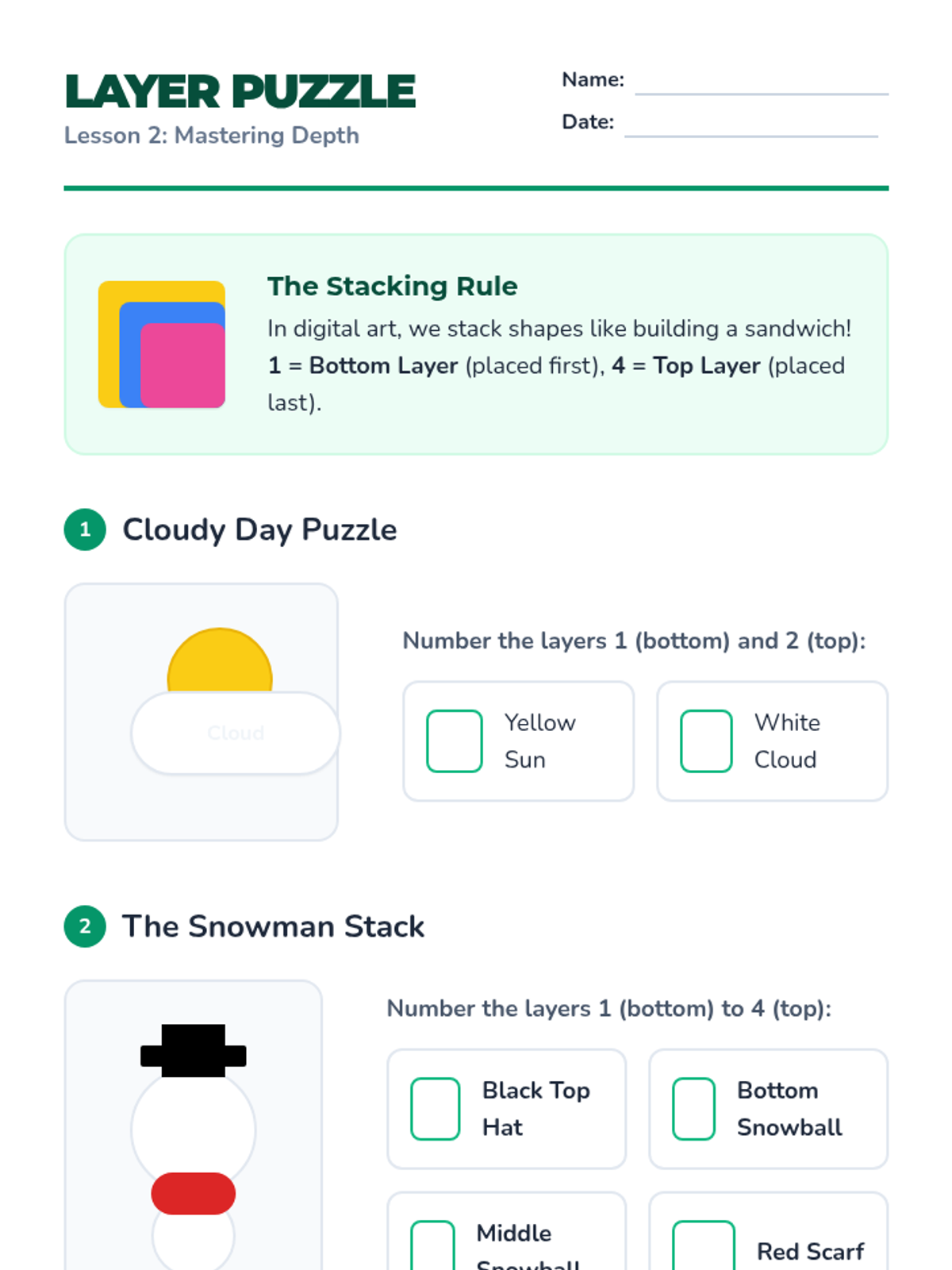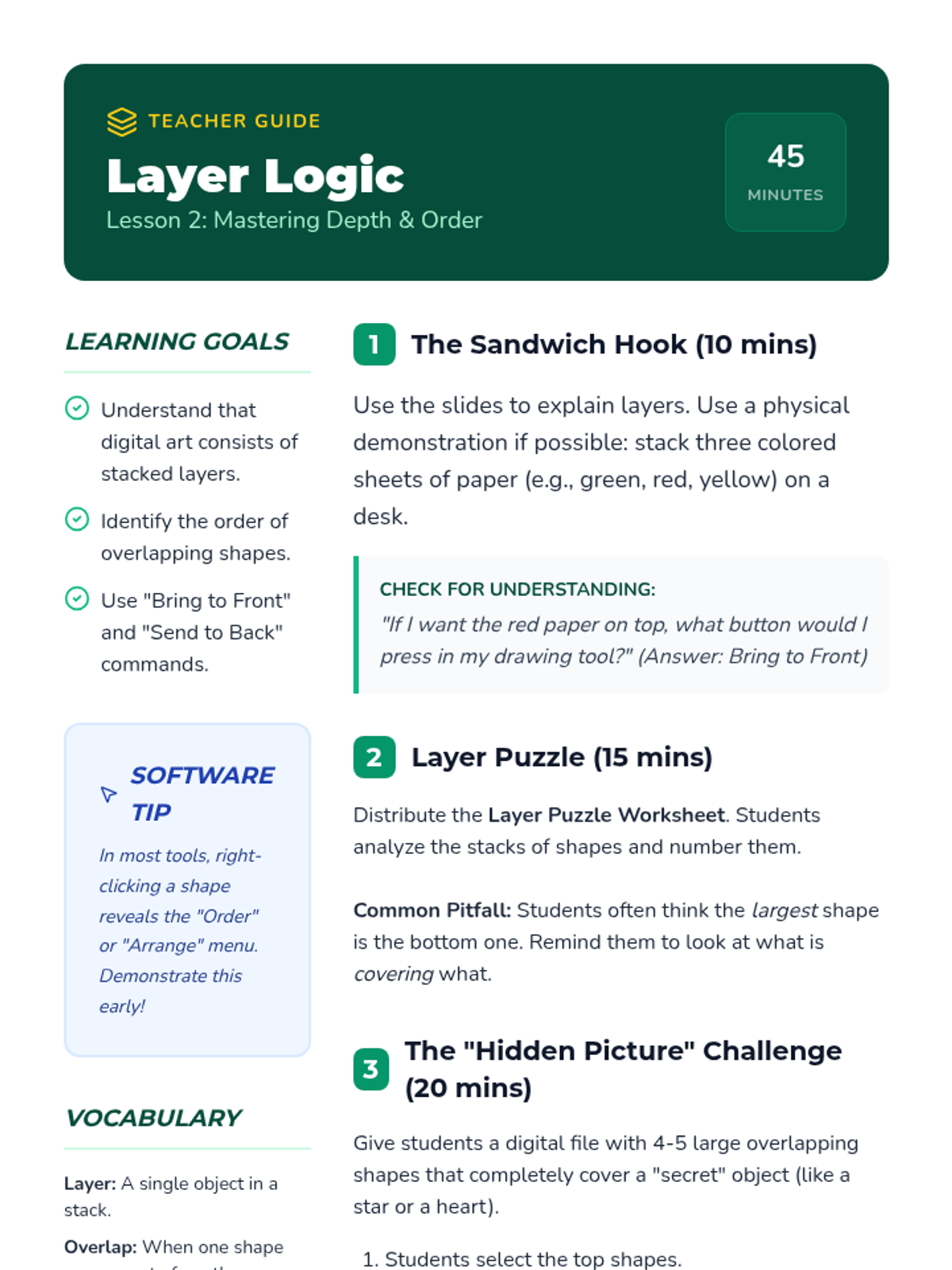Students explore digital depth by learning to order shapes with 'bring to front' and 'send to back' commands.