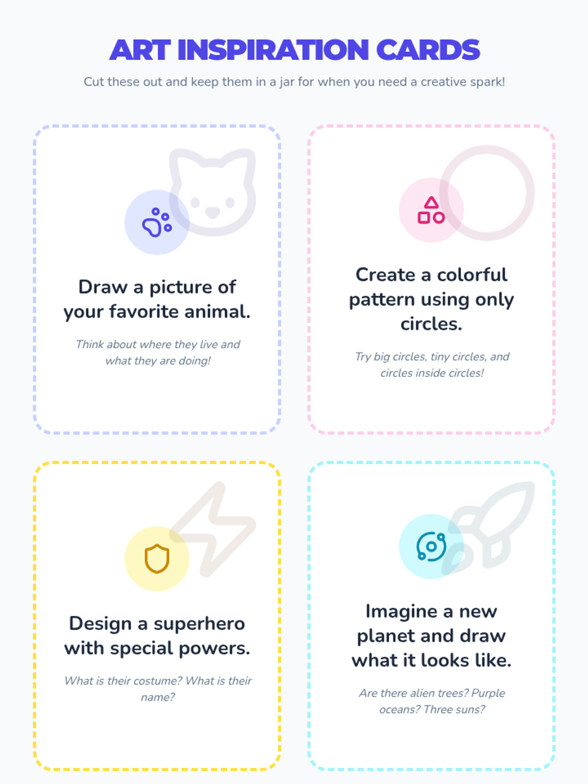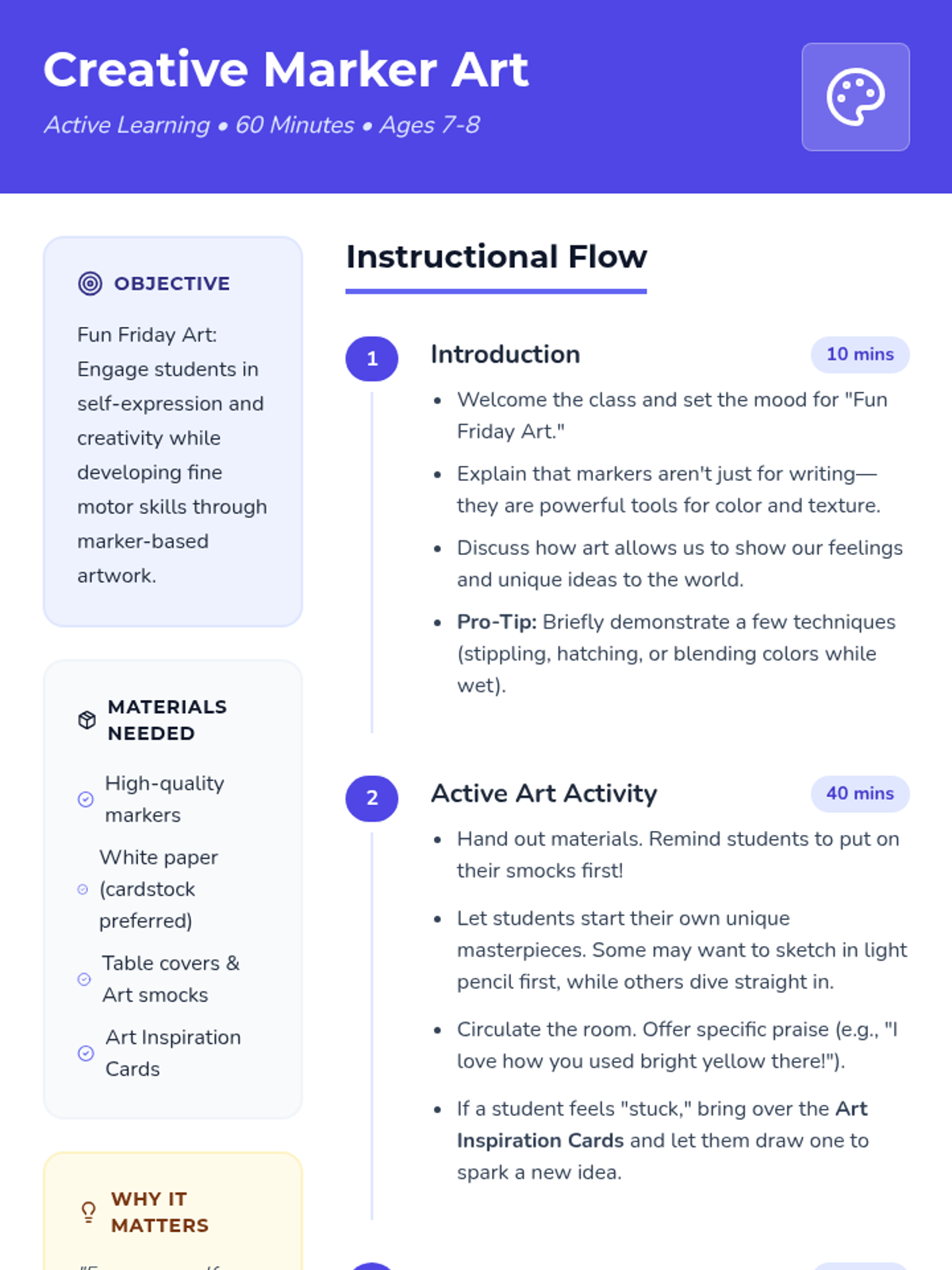 A vibrant 60-minute art lesson for 7-8 year olds focusing on self-expression and fine motor skills through marker art. Students explore creativity using inspiration cards and active guided practice.