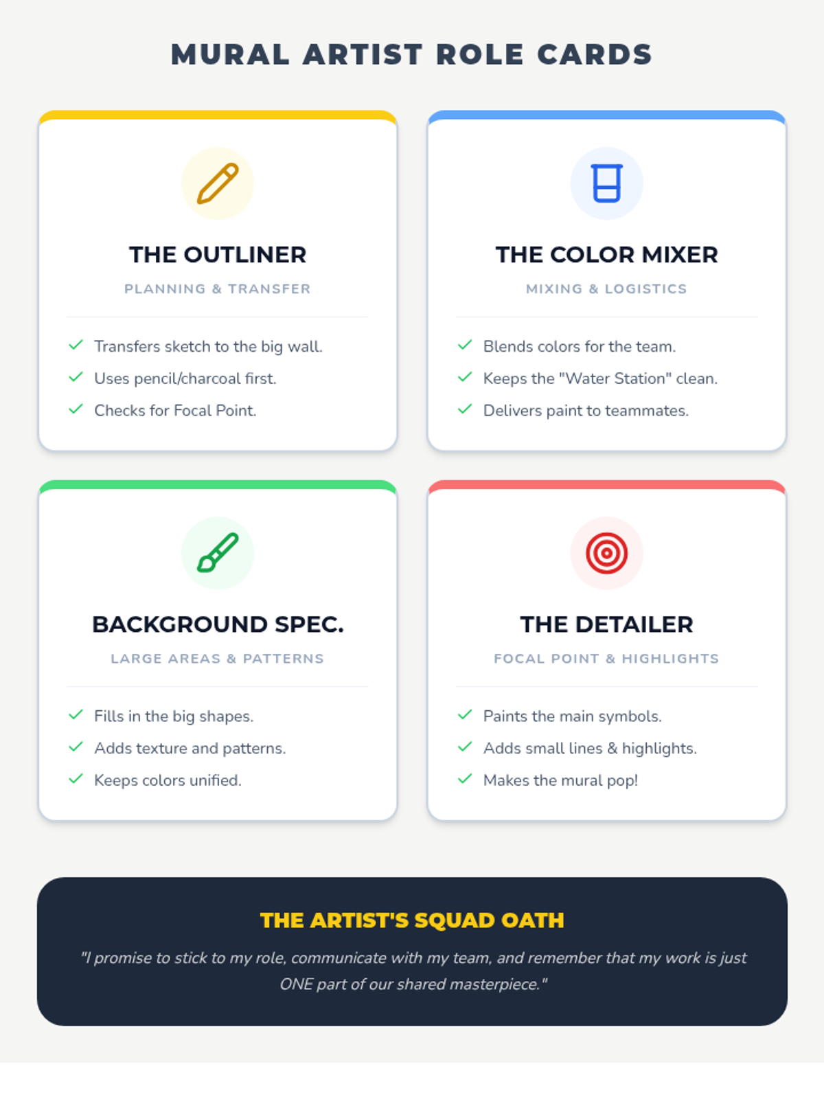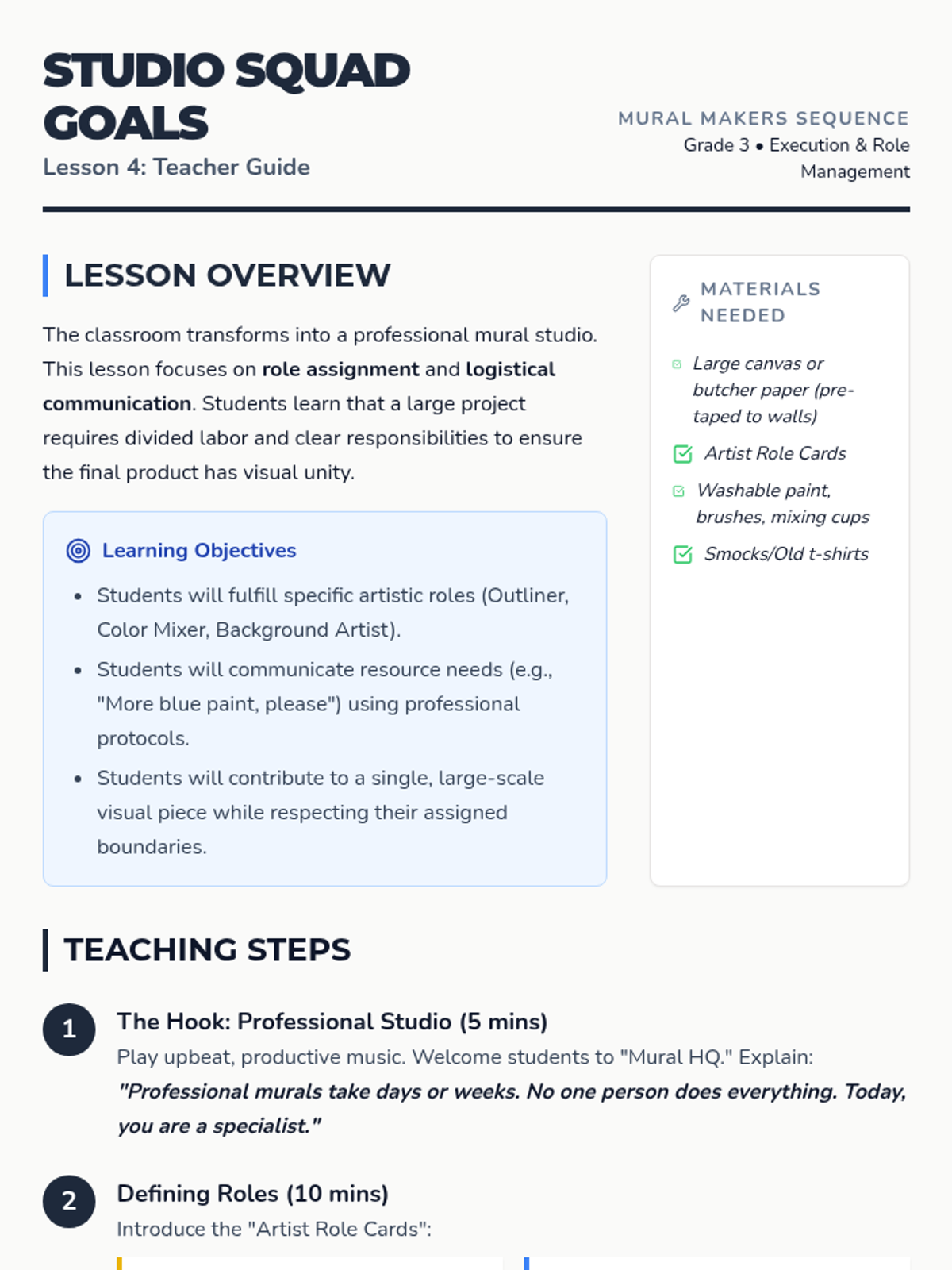 The classroom transforms into an art studio where students take on specific roles to execute their large-scale collaborative artwork.