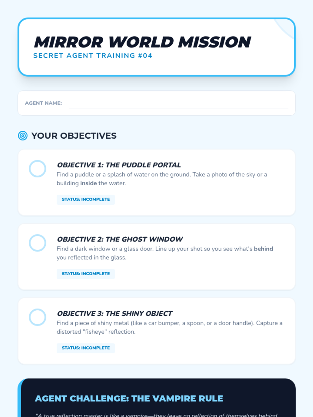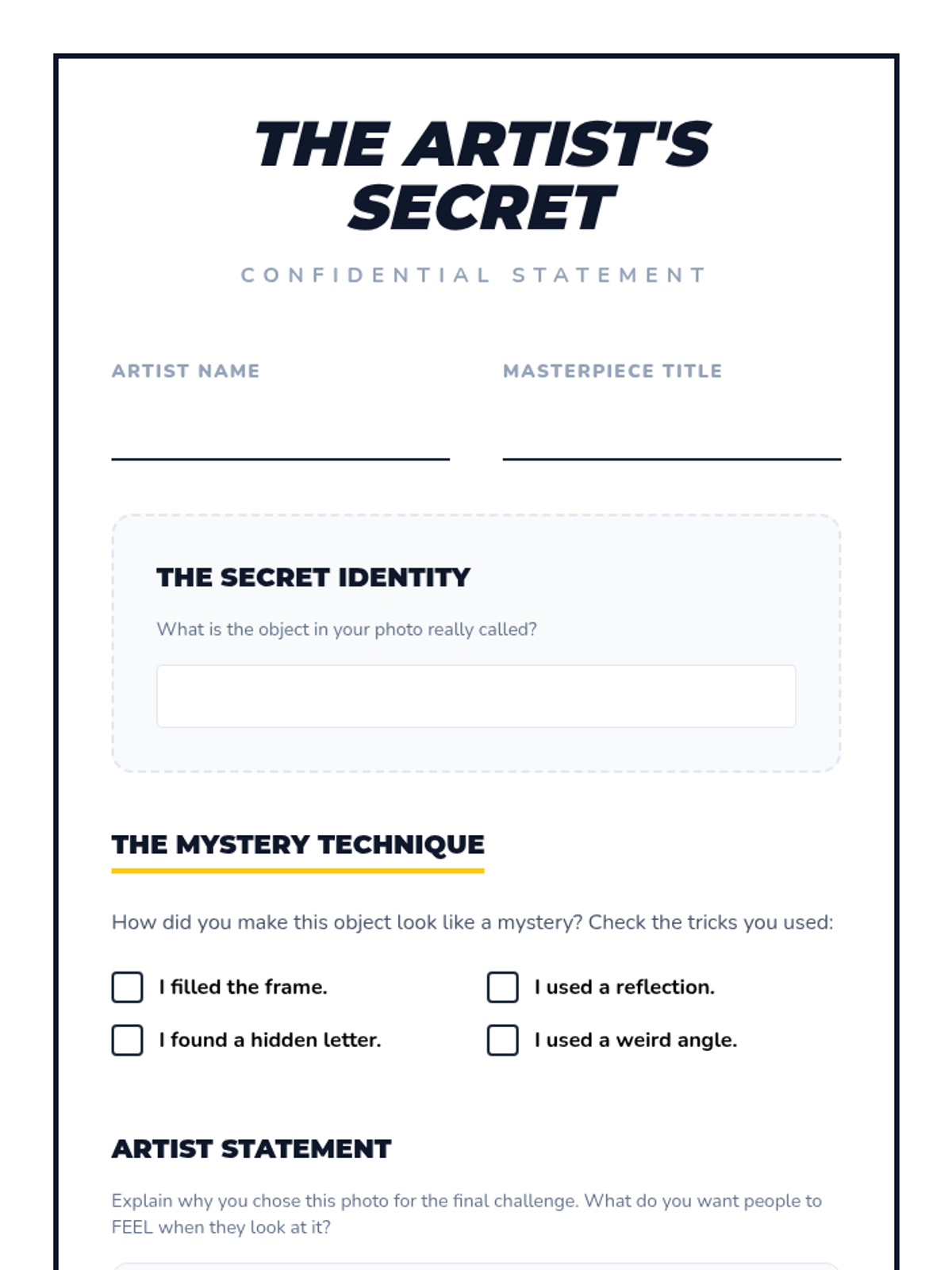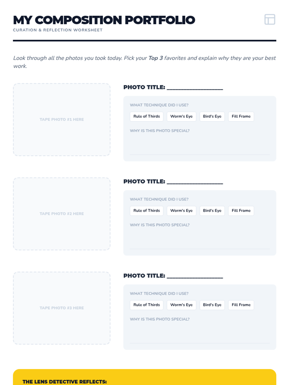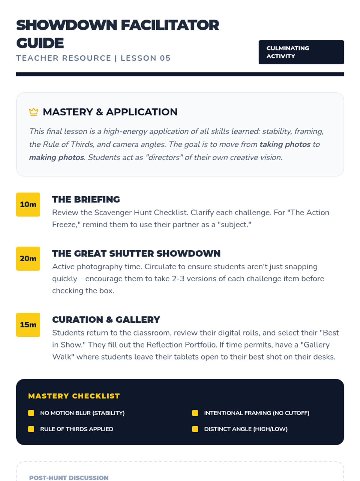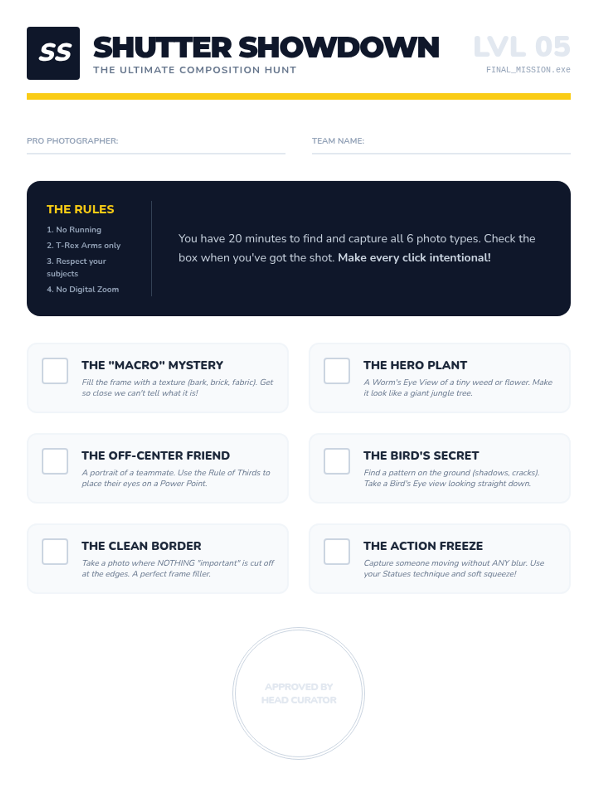 A culminating activity where students apply all learned composition techniques in a structured scavenger hunt and select their best work for a portfolio.
