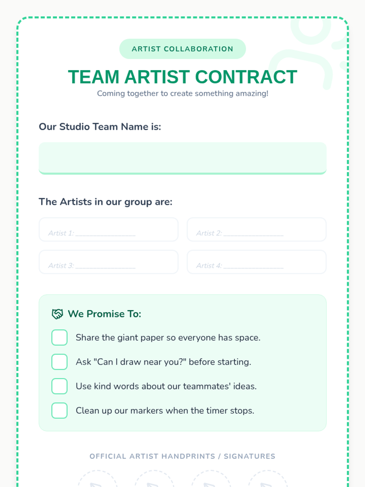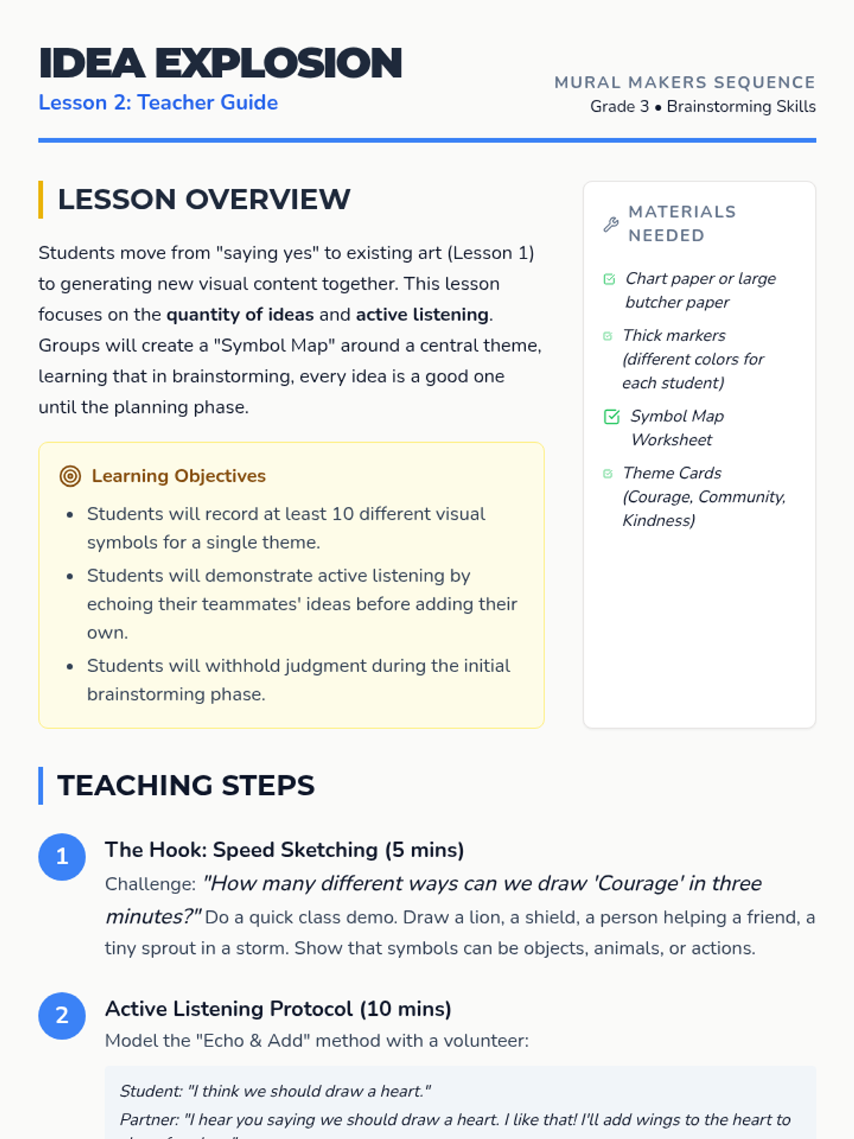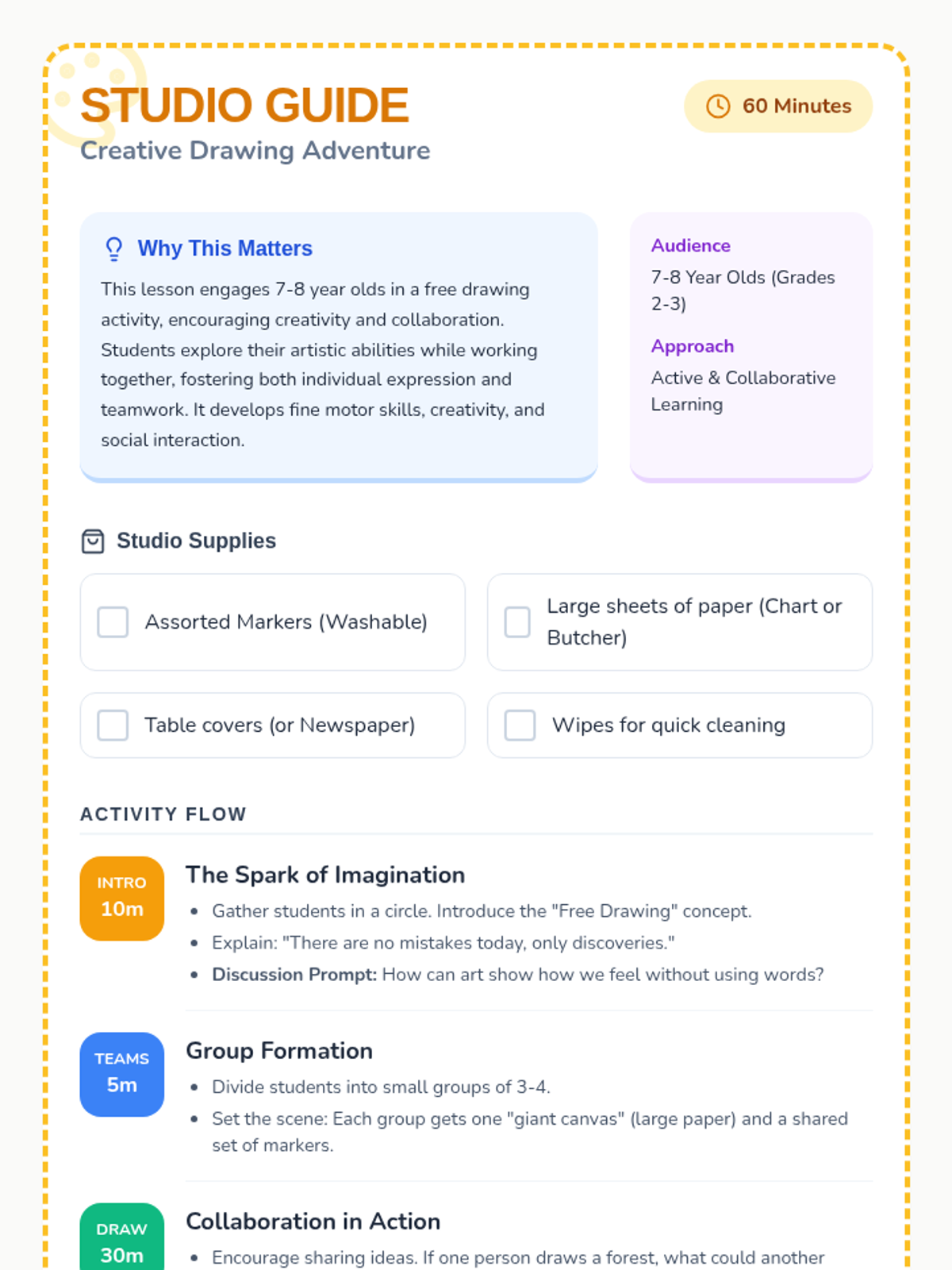 A 1-hour active learning lesson where 7-8 year olds engage in collaborative free drawing to boost creativity and teamwork skills. Students work in small groups on large-scale art, concluding with a gallery walk to share and appreciate each others' work.