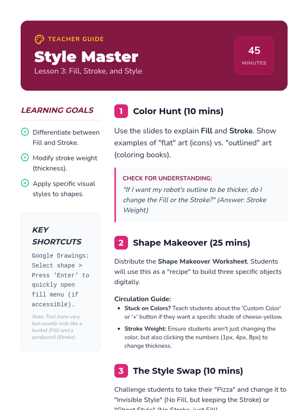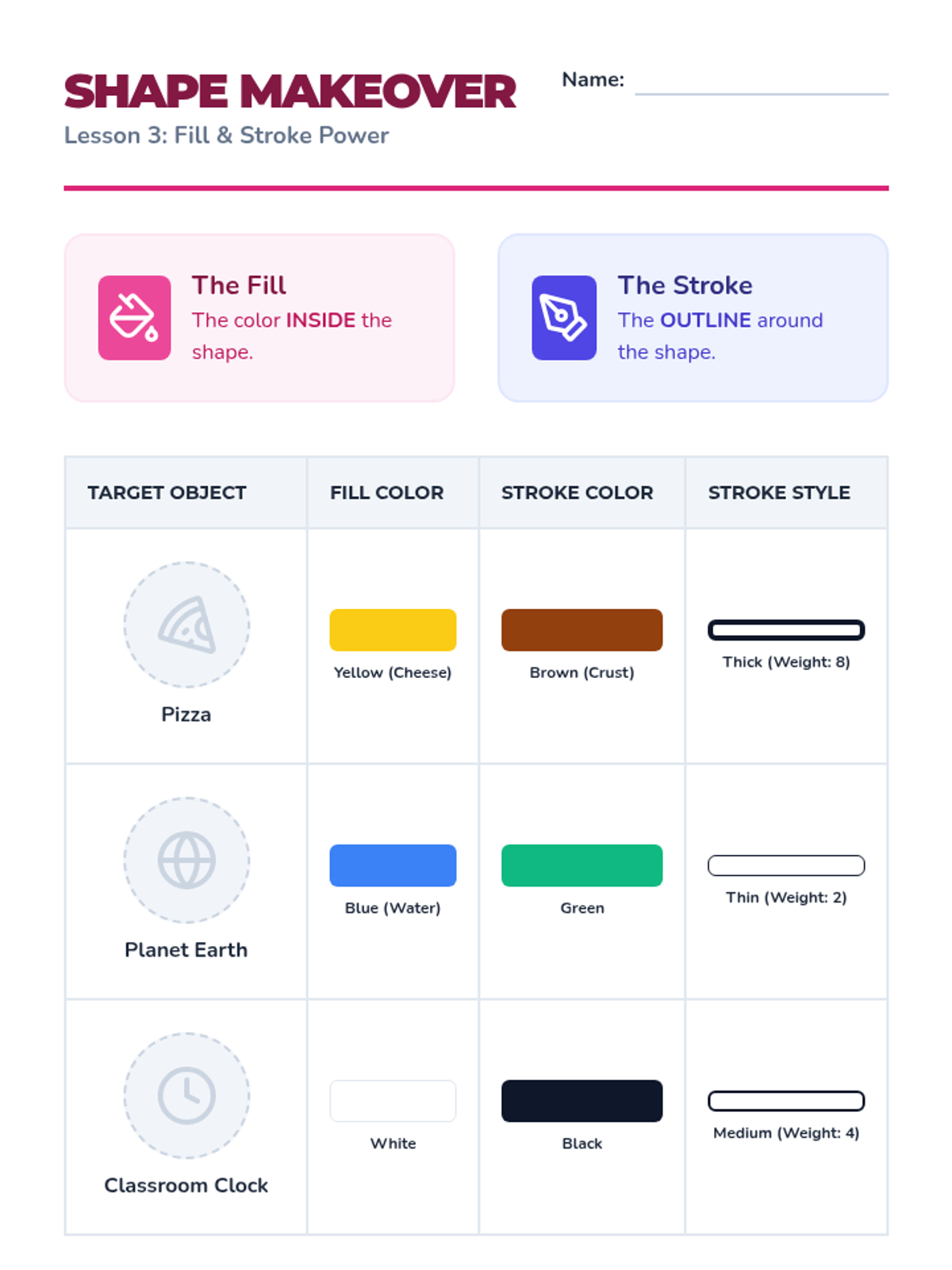 Students learn to customize shapes using fill (inside color) and stroke (outline) settings to create different styles.