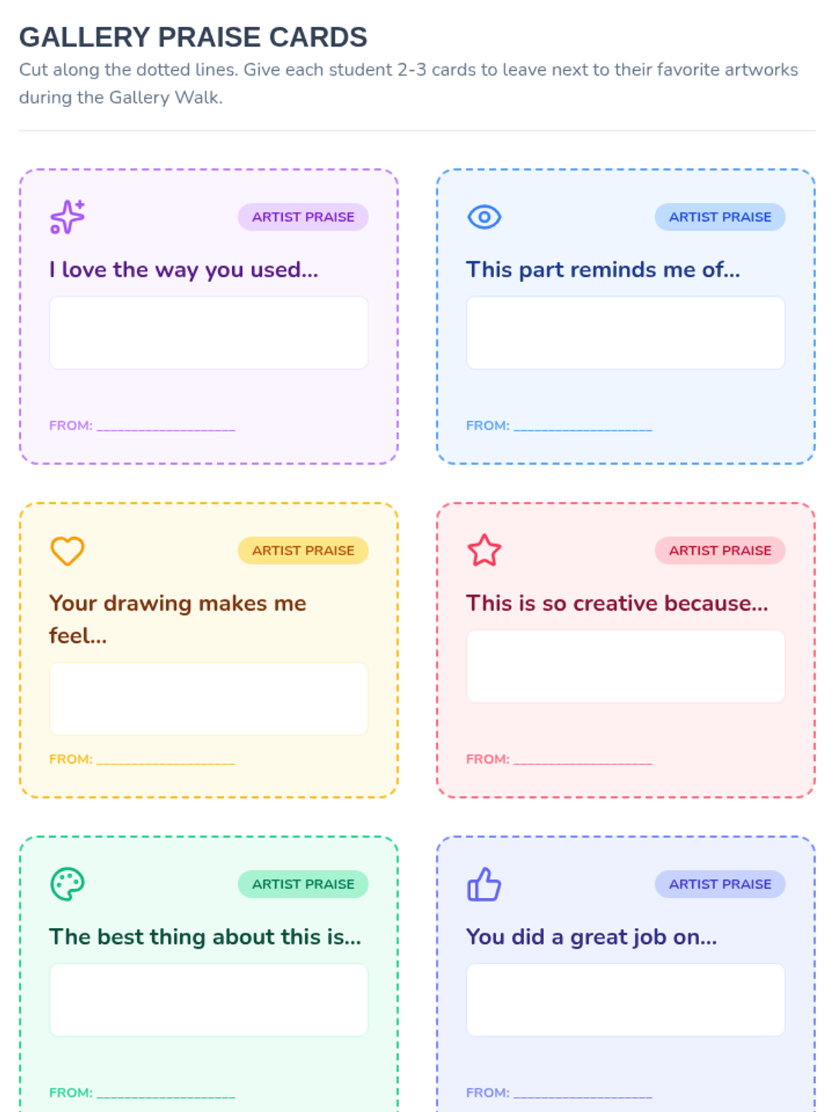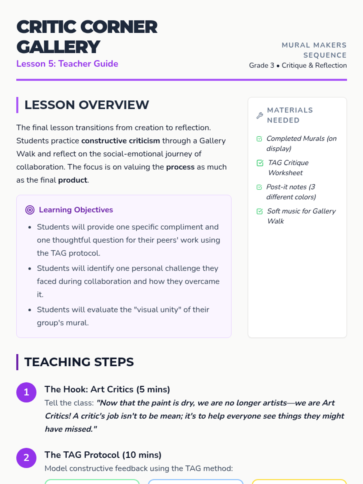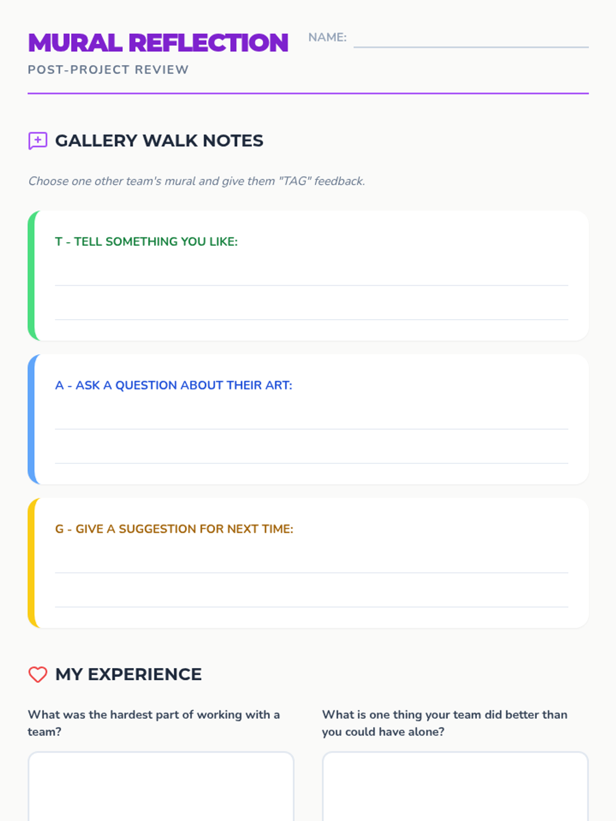 Students reflect on their collaborative process and participate in a gallery walk to provide constructive feedback on their peers' work.