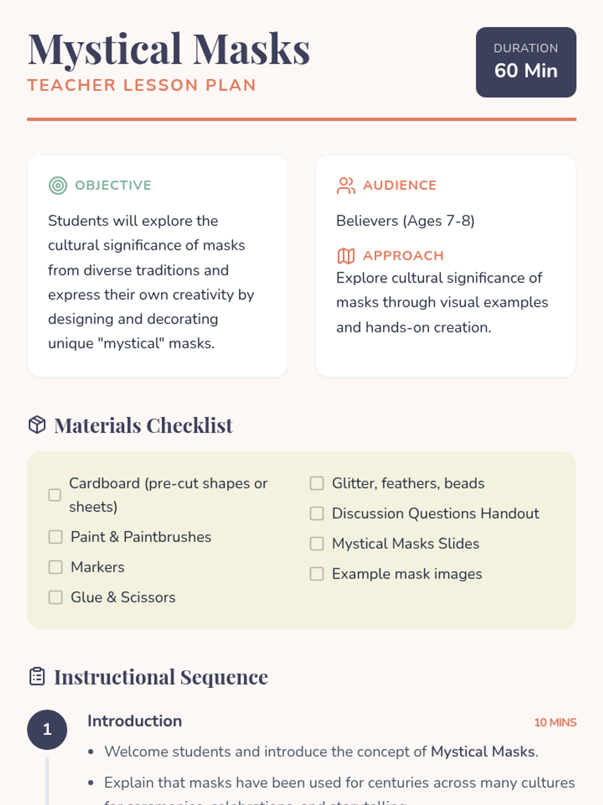 Students explore the cultural significance of masks from around the world and design their own mystical masks using cardboard and craft supplies. This lesson encourages creative expression and appreciation for global traditions.