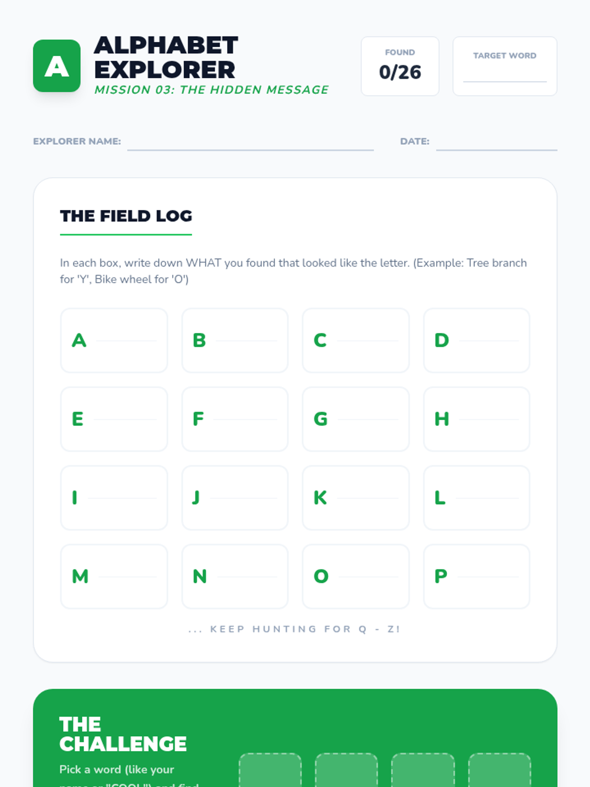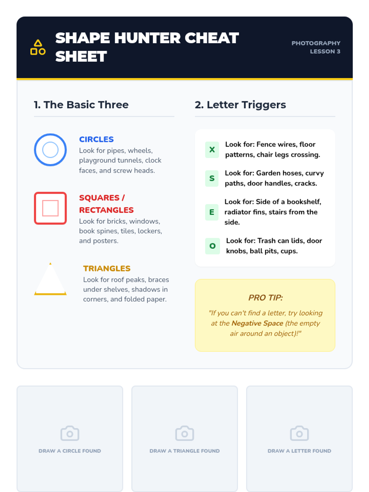 Students search for accidental alphabets and geometric shapes in their surroundings to improve framing and compositional awareness.