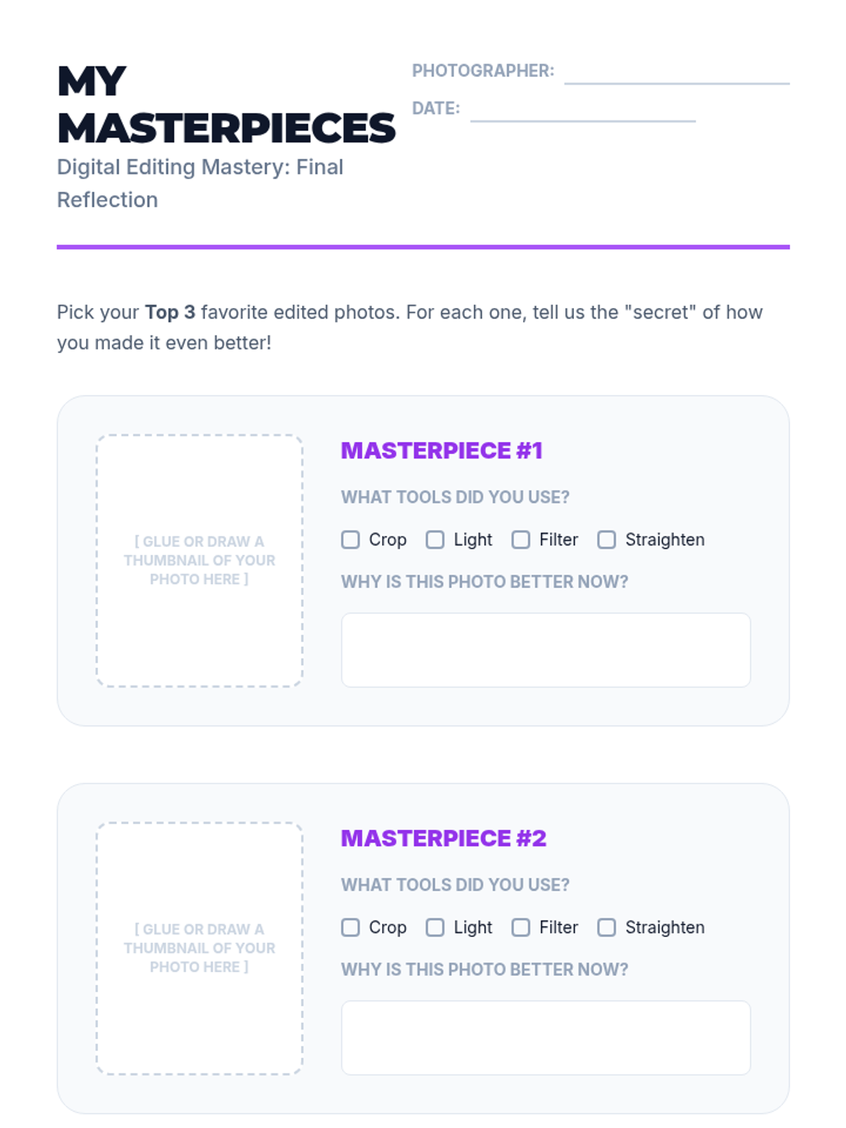 Students select their top 3 edited images for a final digital portfolio, reflecting on their changes and celebrating their work in a class showcase.