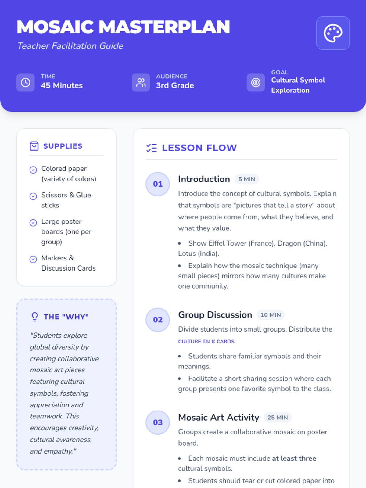 Students explore global diversity by creating collaborative mosaic art pieces featuring cultural symbols, fostering appreciation and teamwork.