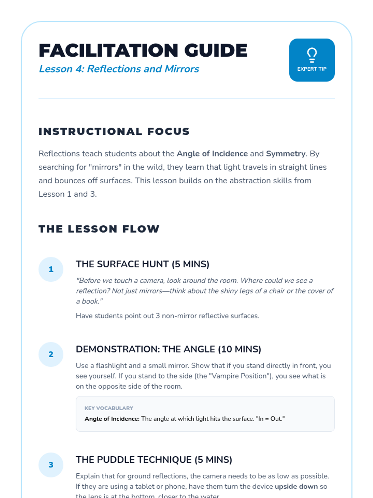 The class explores reflective surfaces like puddles and windows to practice creative composition and understand the angle of incidence.