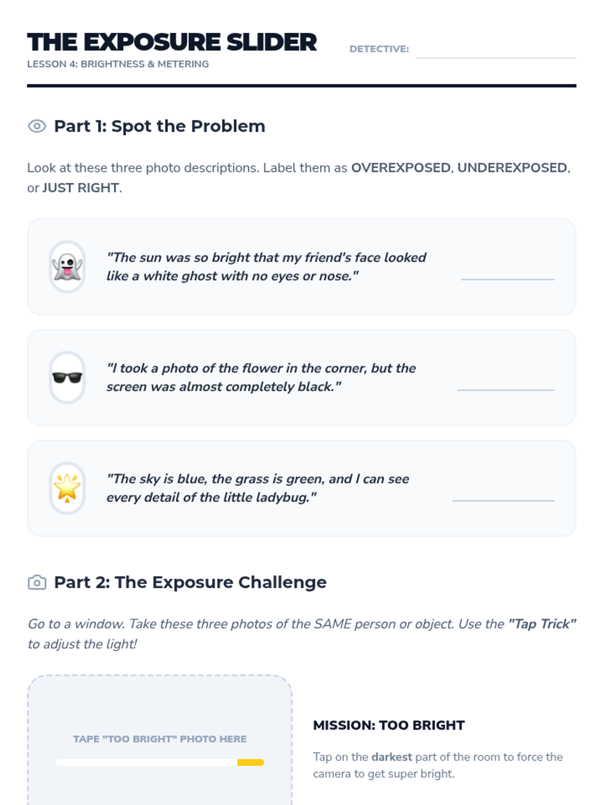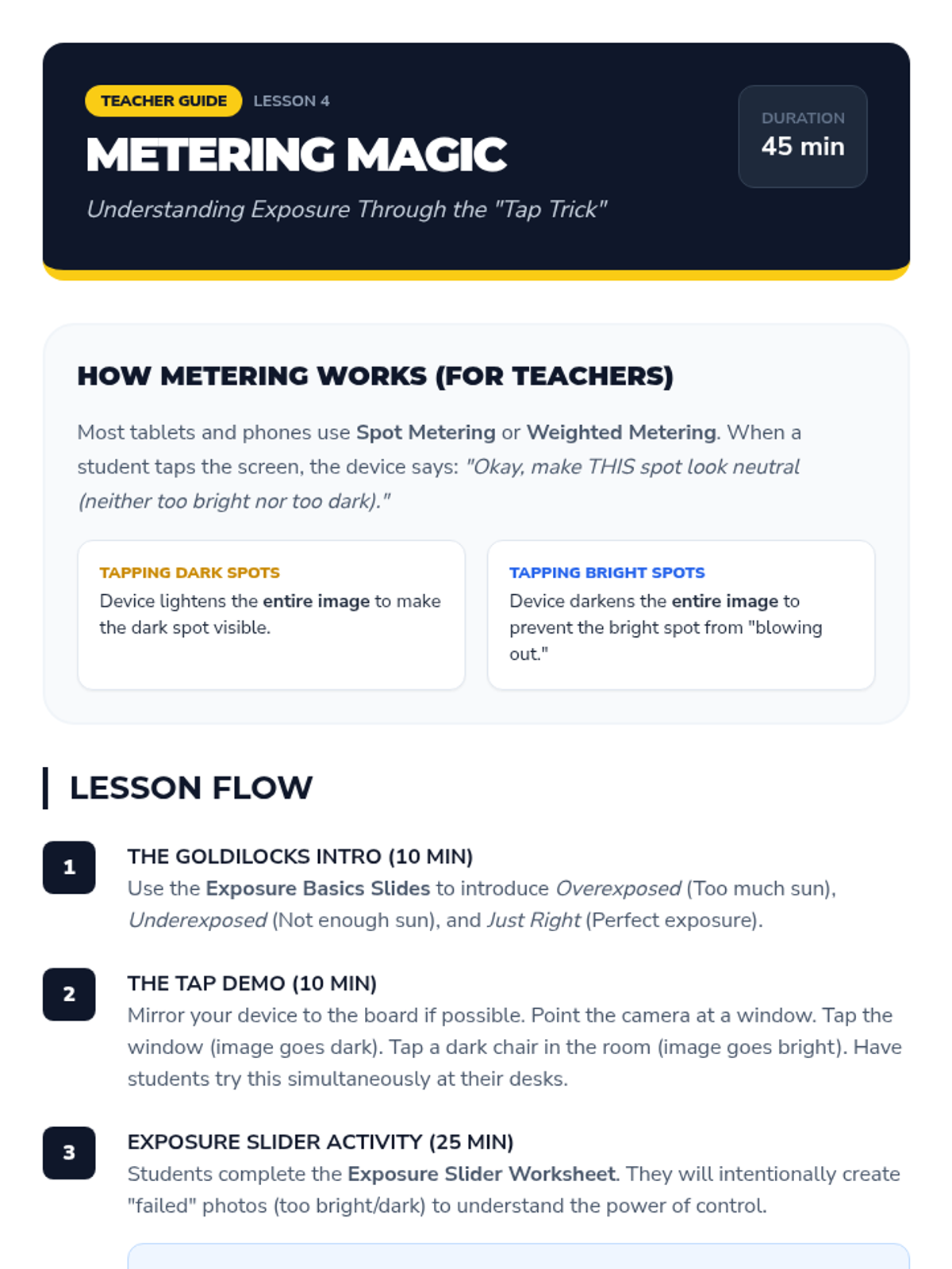 A simplified introduction to exposure, teaching students to identify overexposed and underexposed images and how to adjust brightness on their devices.