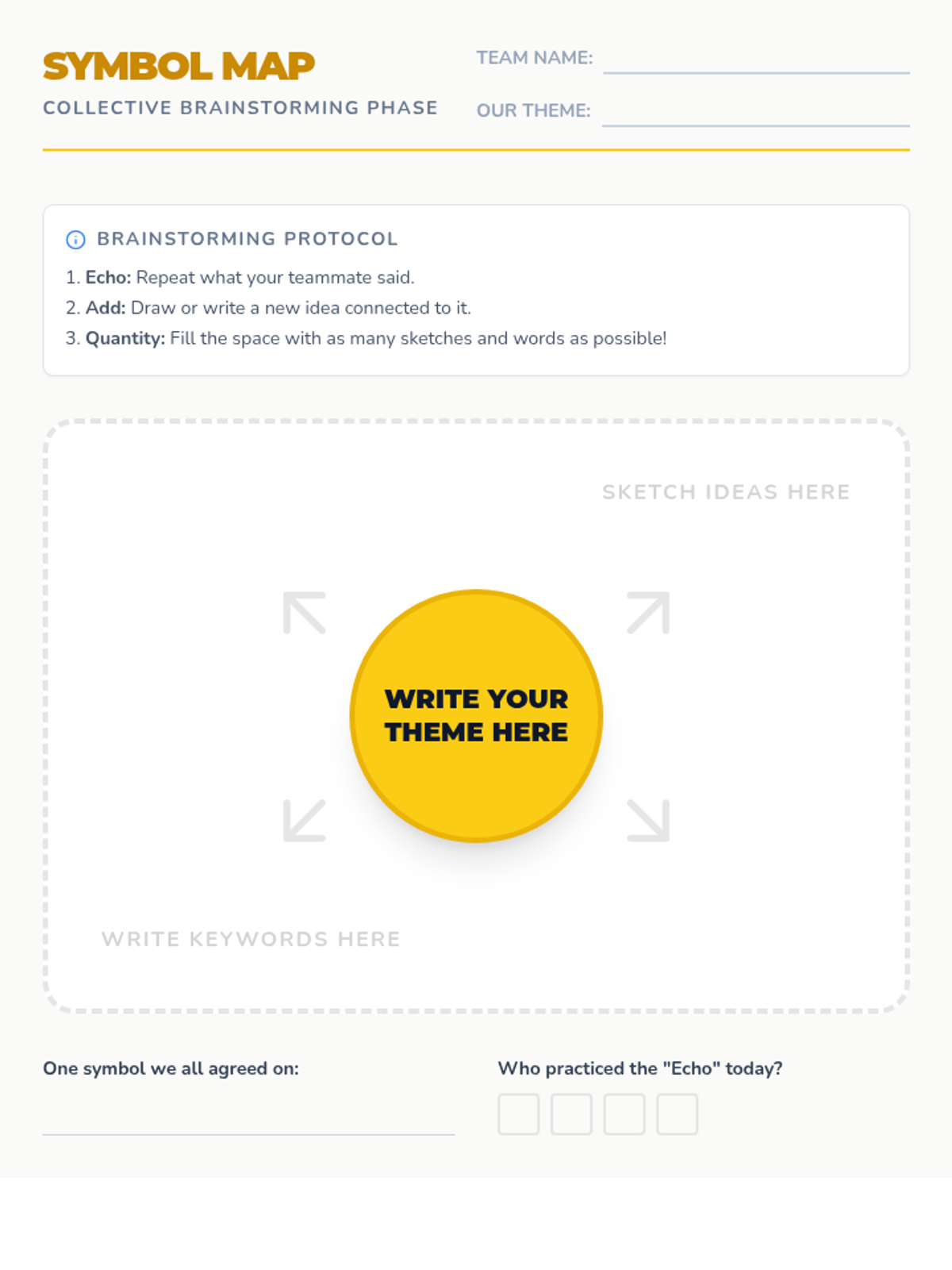 Small groups practice brainstorming and mind mapping visual symbols for a theme, focusing on active listening and generating a high volume of ideas.