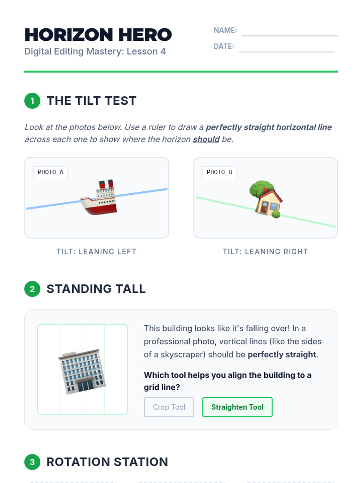 Learners practice straightening crooked horizon lines and rotating images, understanding how geometric alignment creates a professional look.