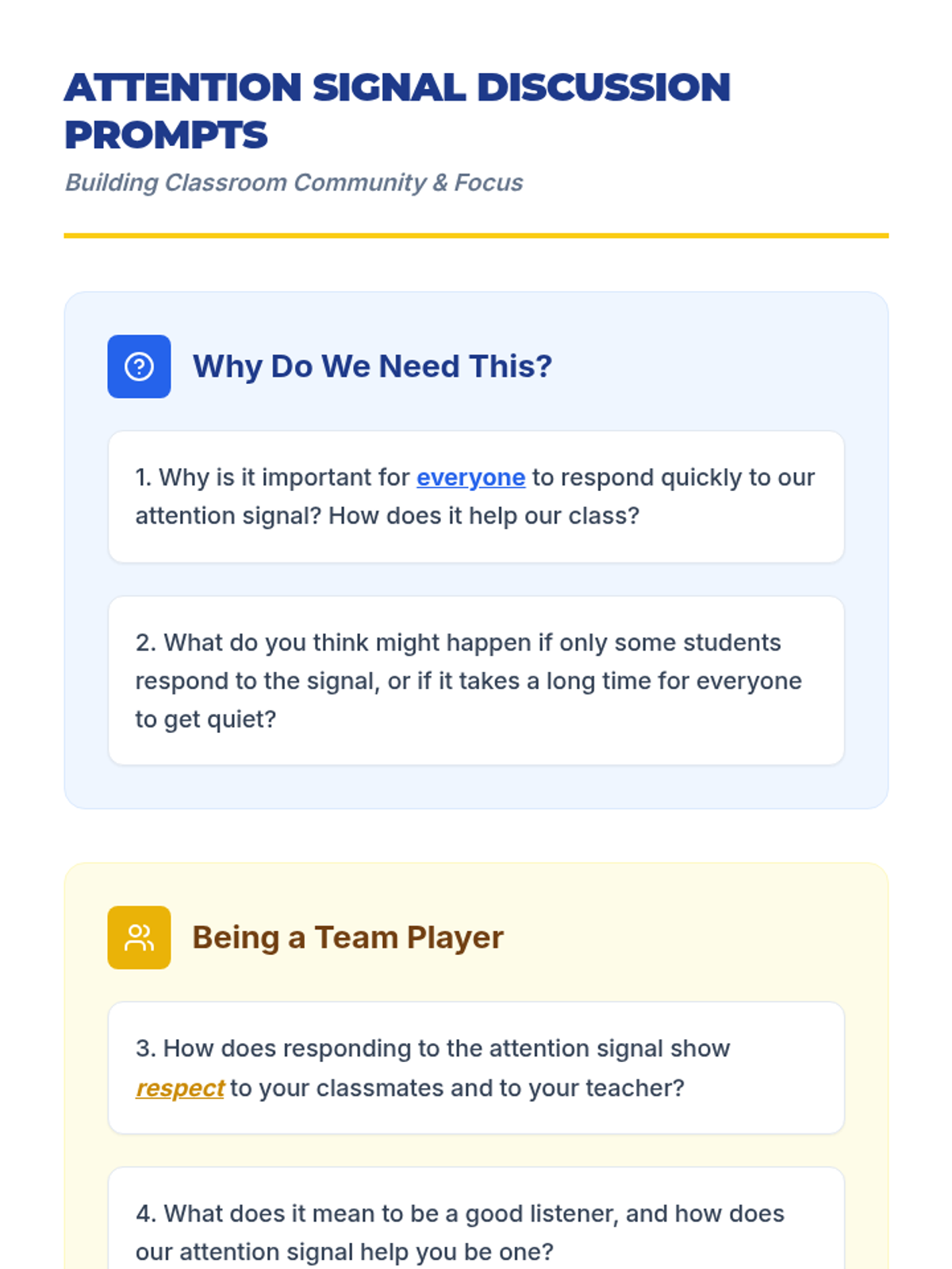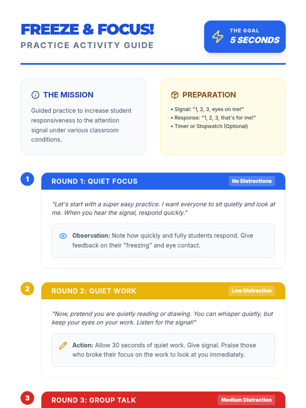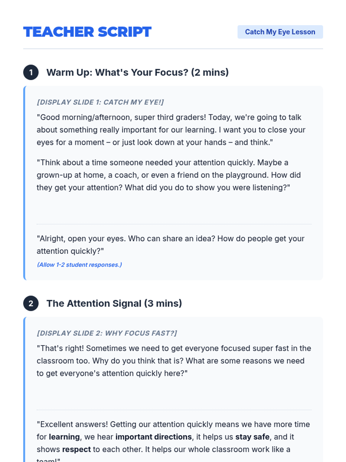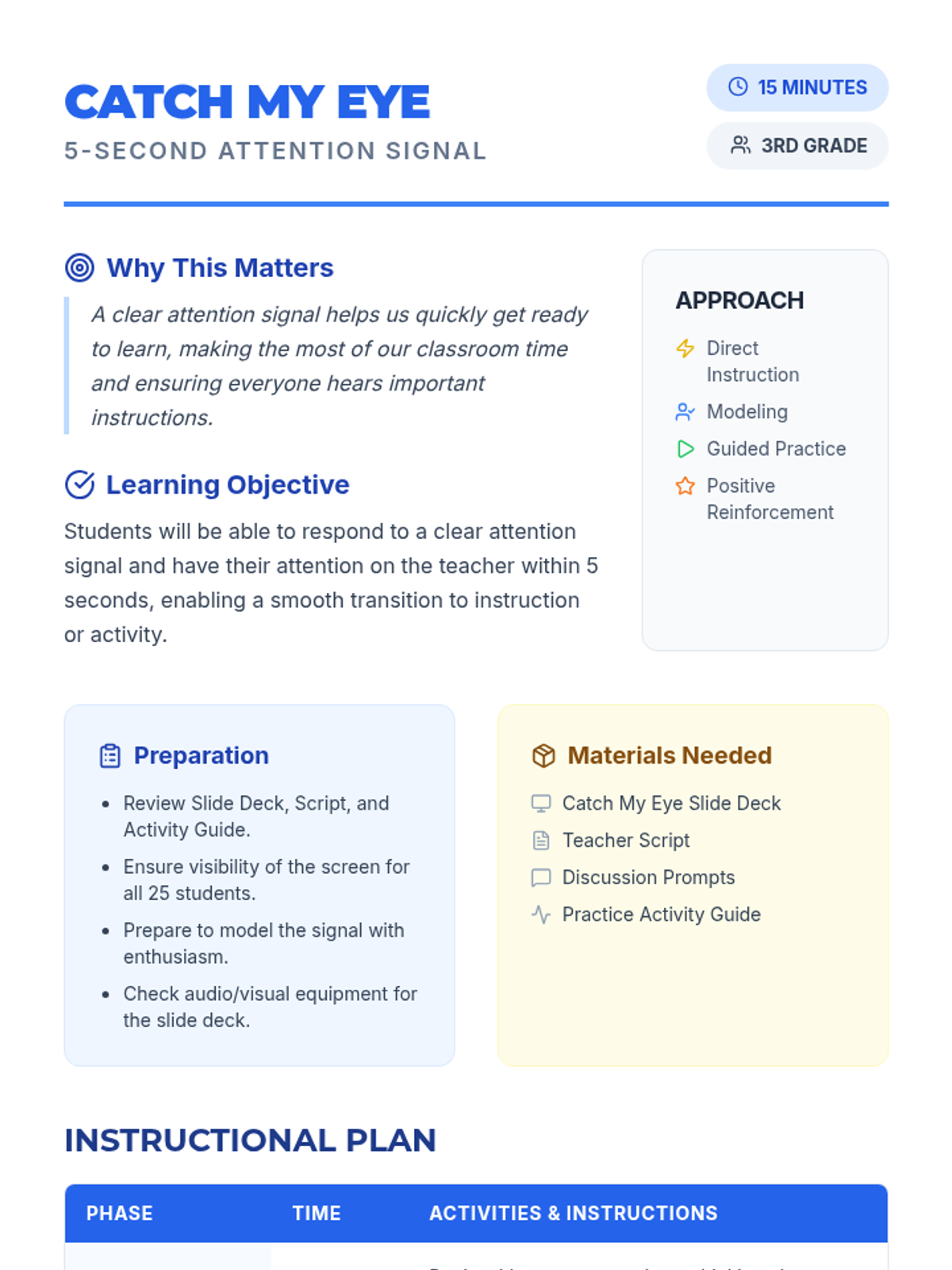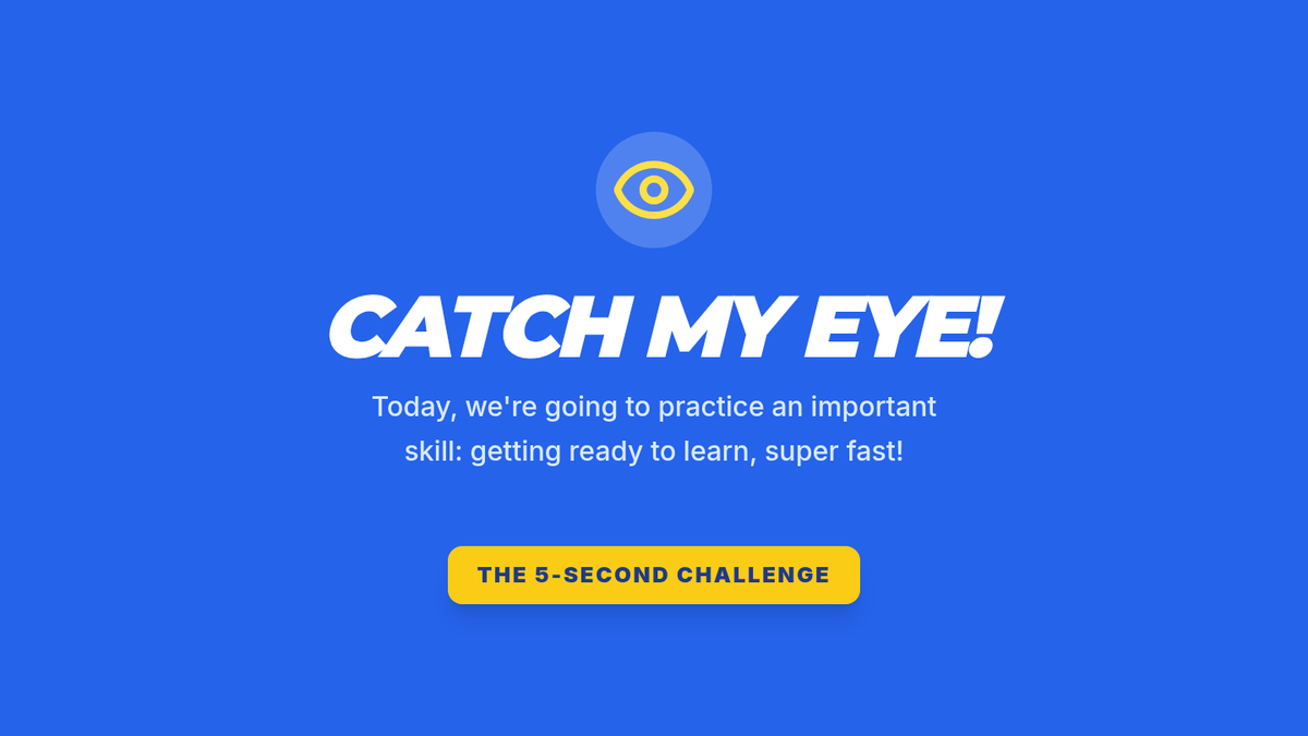 A 15-minute lesson for 3rd graders to master a 5-second attention signal ('1, 2, 3, eyes on me!'), improving classroom efficiency and learning time.