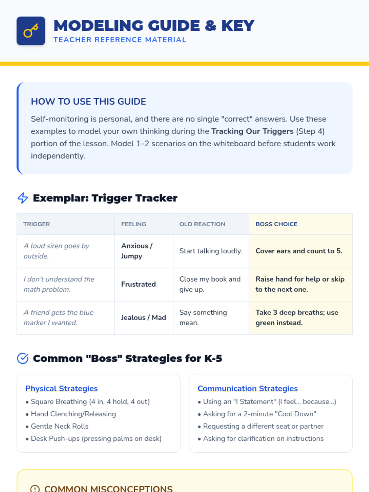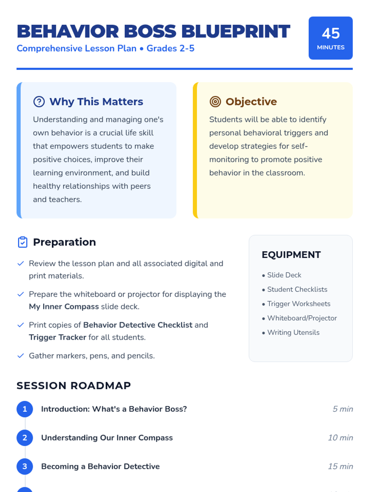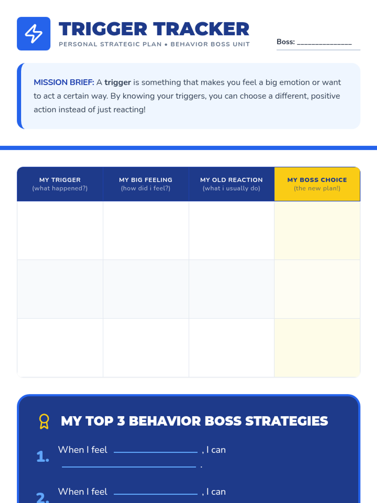 This lesson empowers elementary students to self-monitor their actions by identifying personal triggers and developing positive behavior strategies through a 'Behavior Boss' framework.