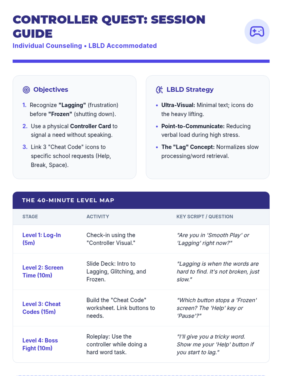 A 40-minute individual counseling session designed for a 10-year-old with language-based learning disabilities, focusing on visual tools to communicate needs without yelling or shutting down. Uses a gaming theme where emotional states are compared to 'Lagging' or 'Frozen' screens.
