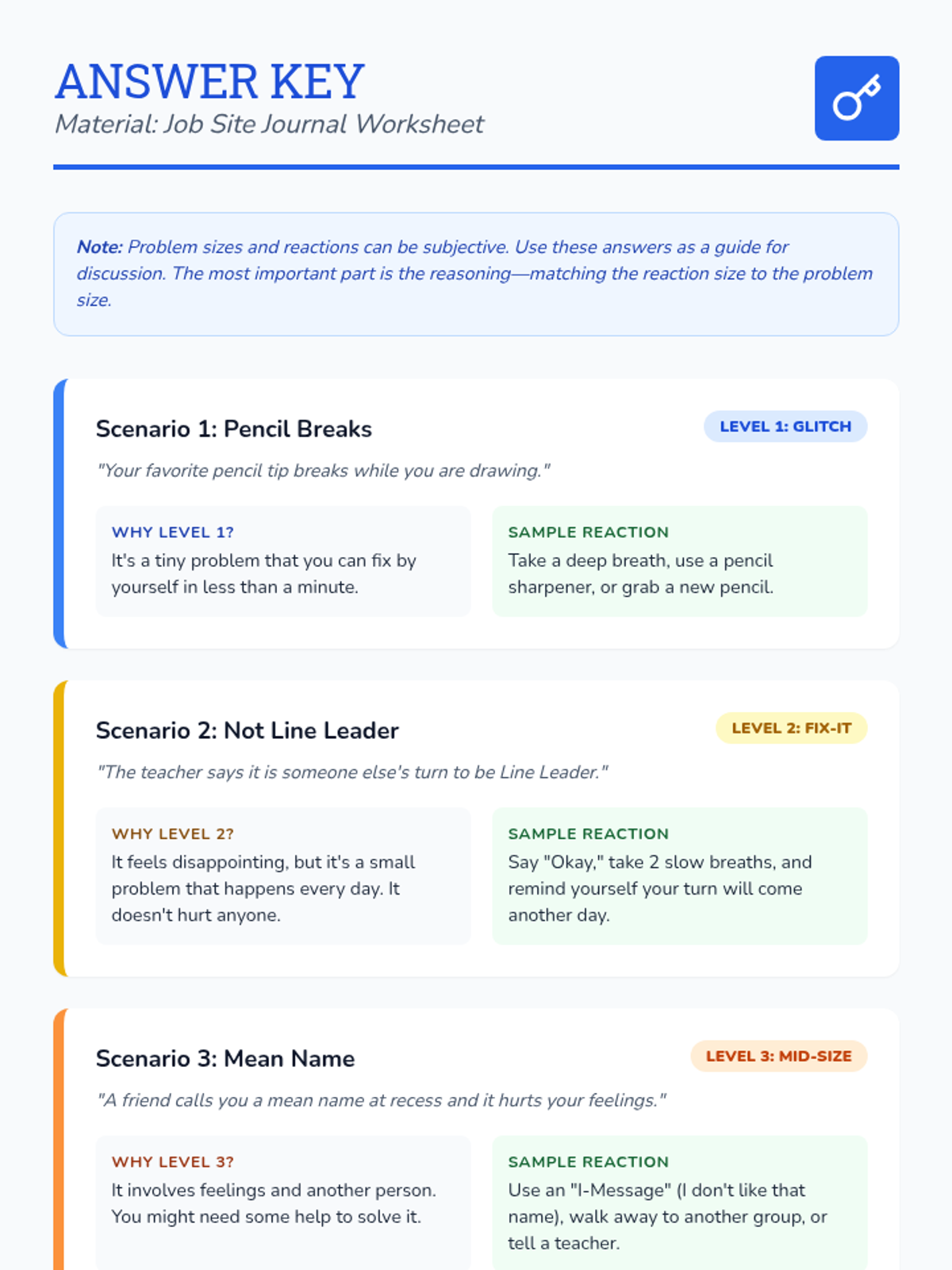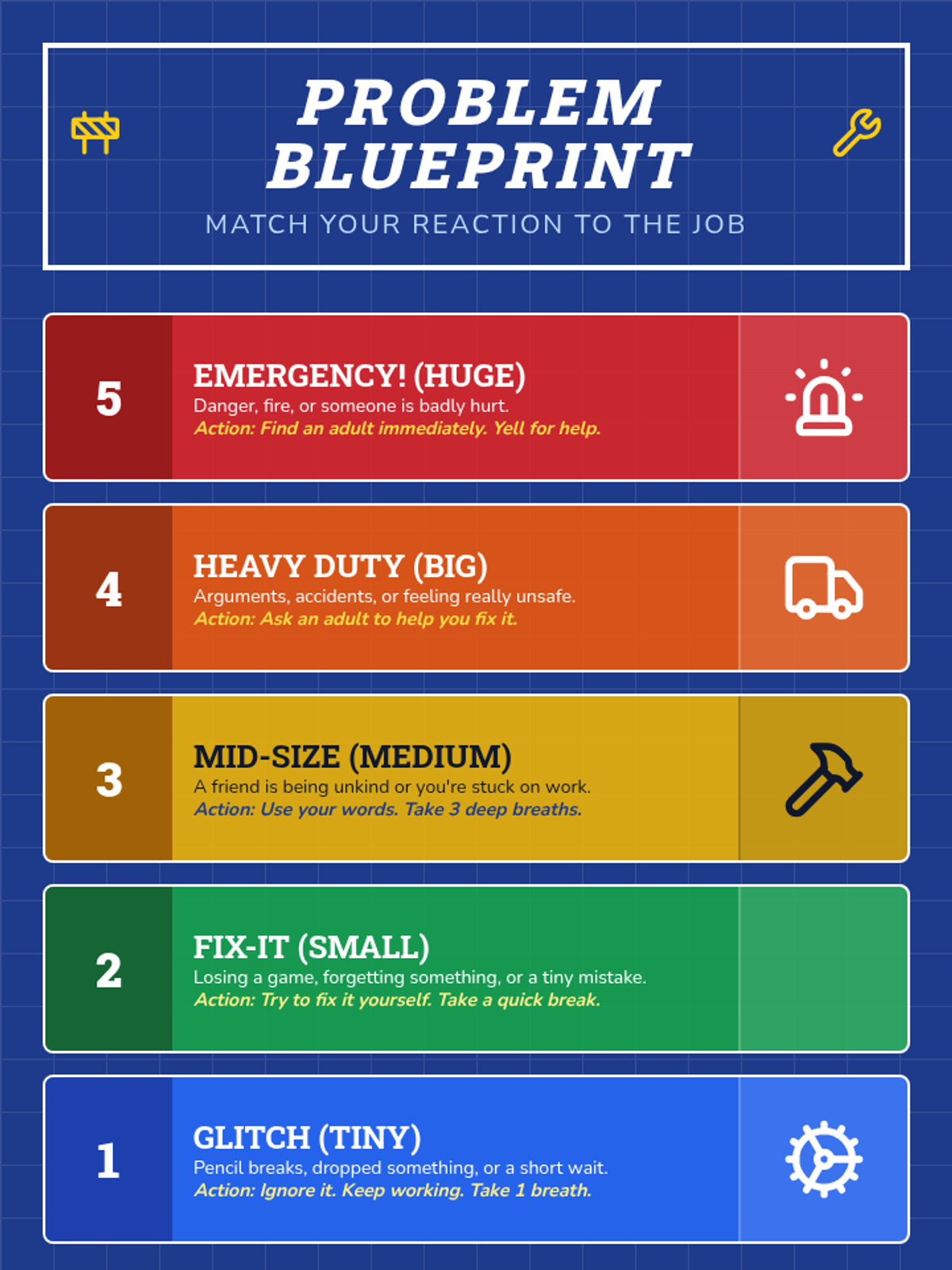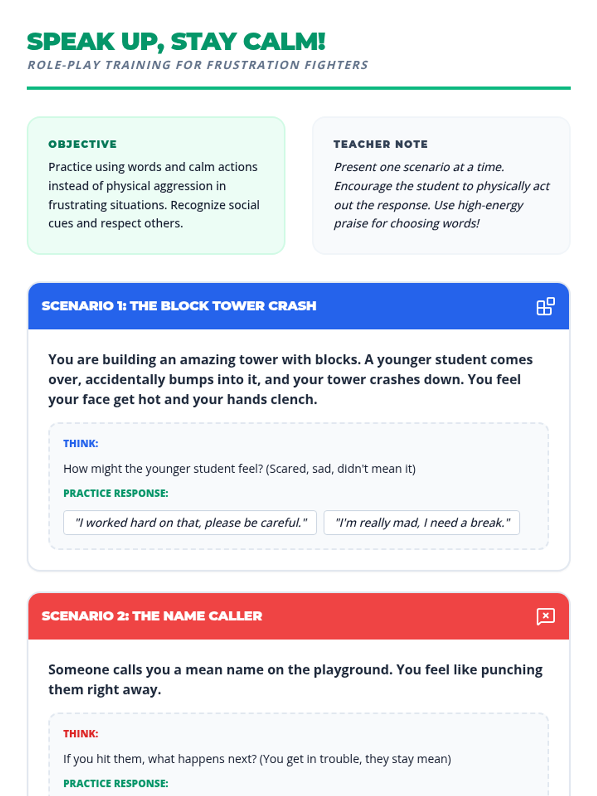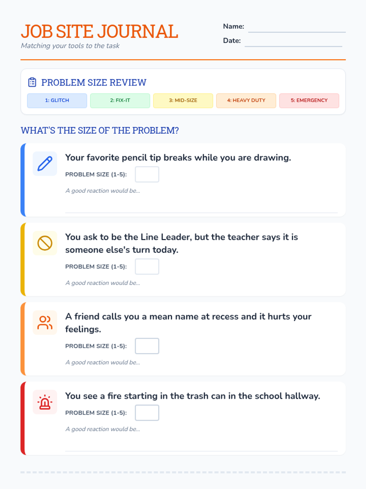 A lesson designed to help students distinguish between Small and Big Problems and choose safe regulation strategies instead of physical reactions. It includes a social story, practice worksheet, and strategy reference guide.