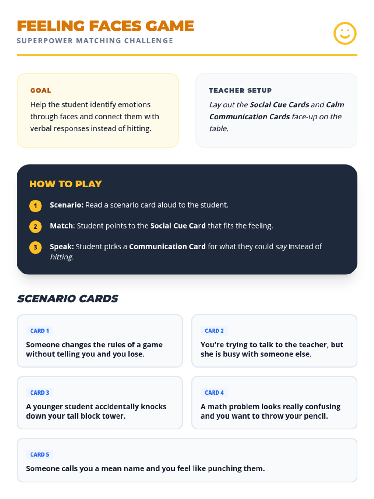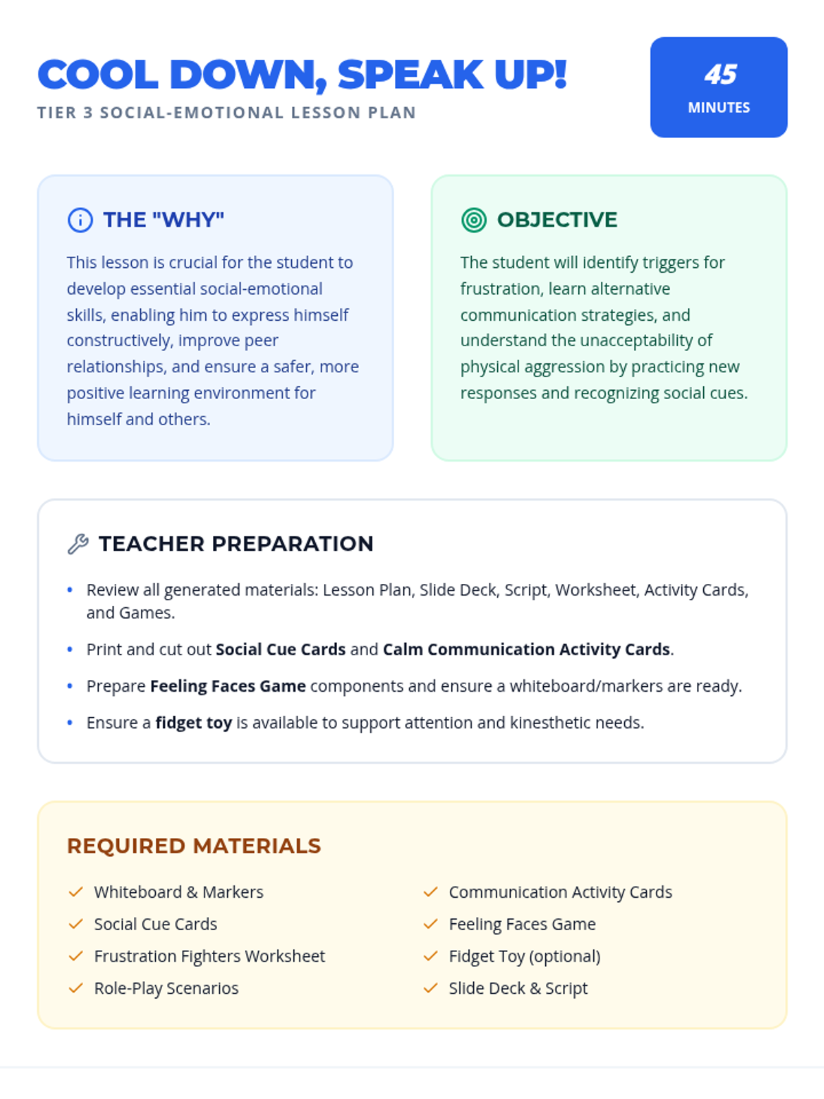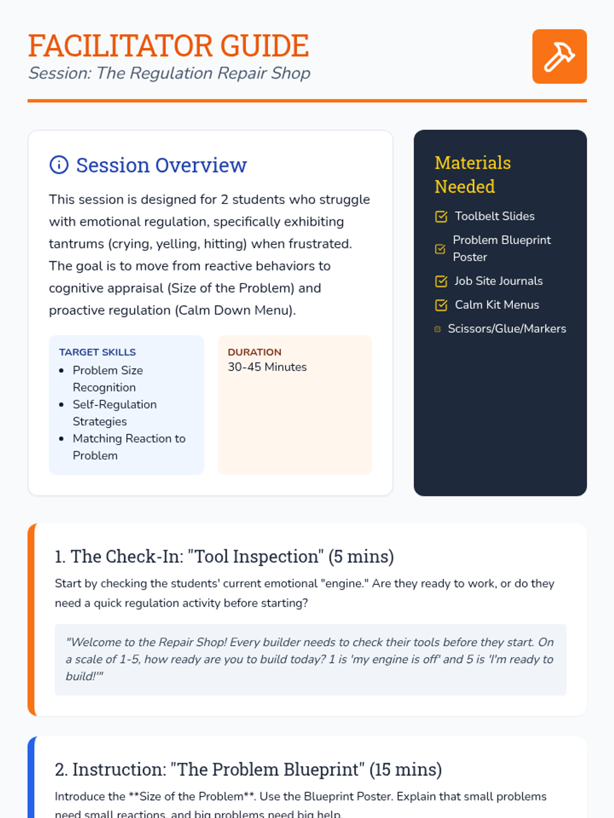 A lesson designed to help students distinguish between Small and Big Problems and choose safe regulation strategies instead of physical reactions. It includes a social story, practice worksheet, and strategy reference guide.