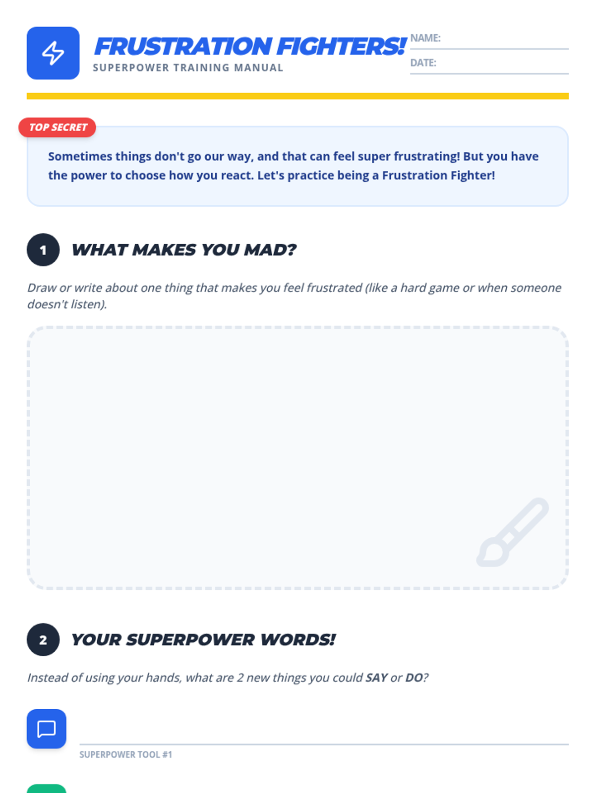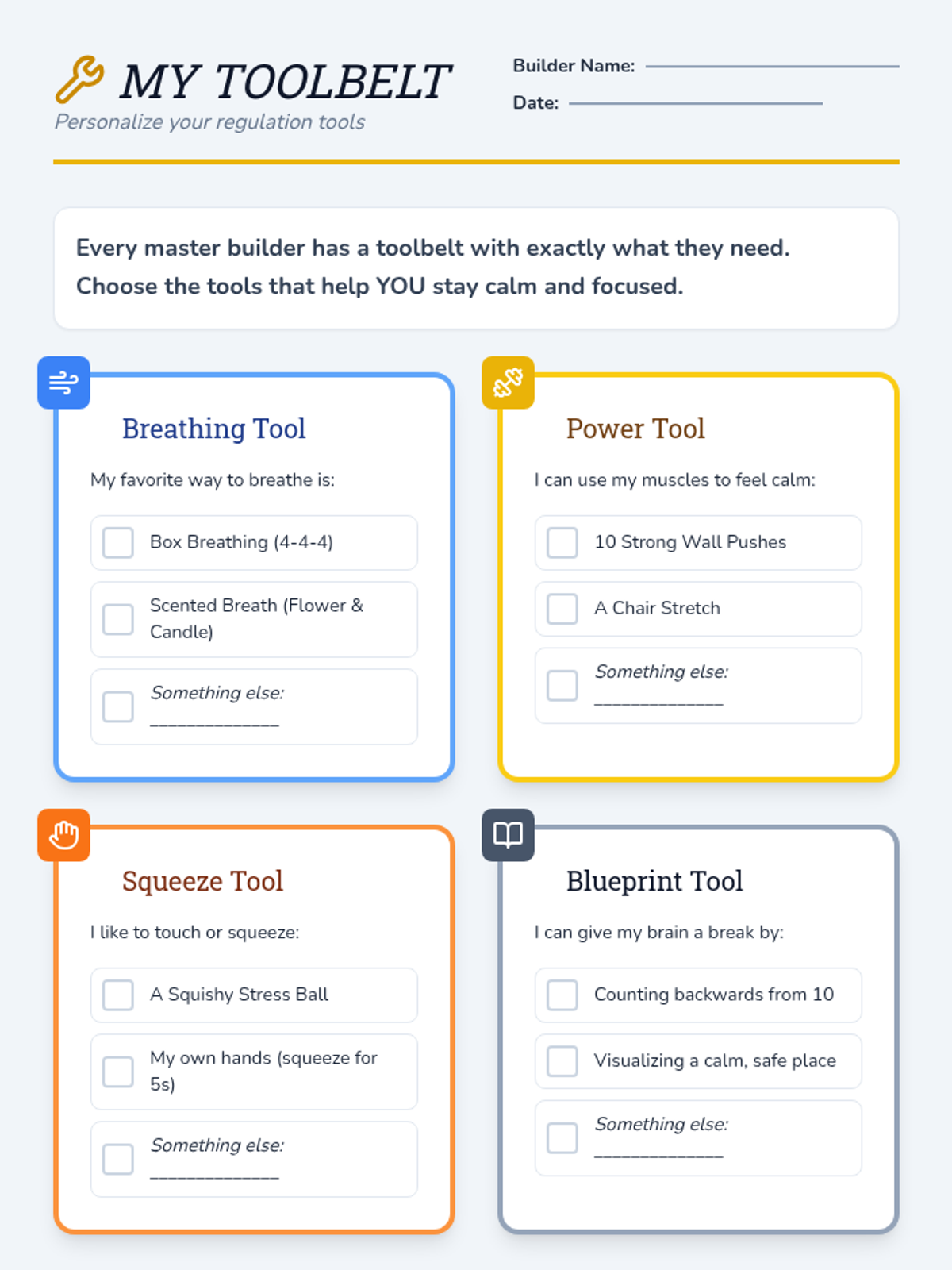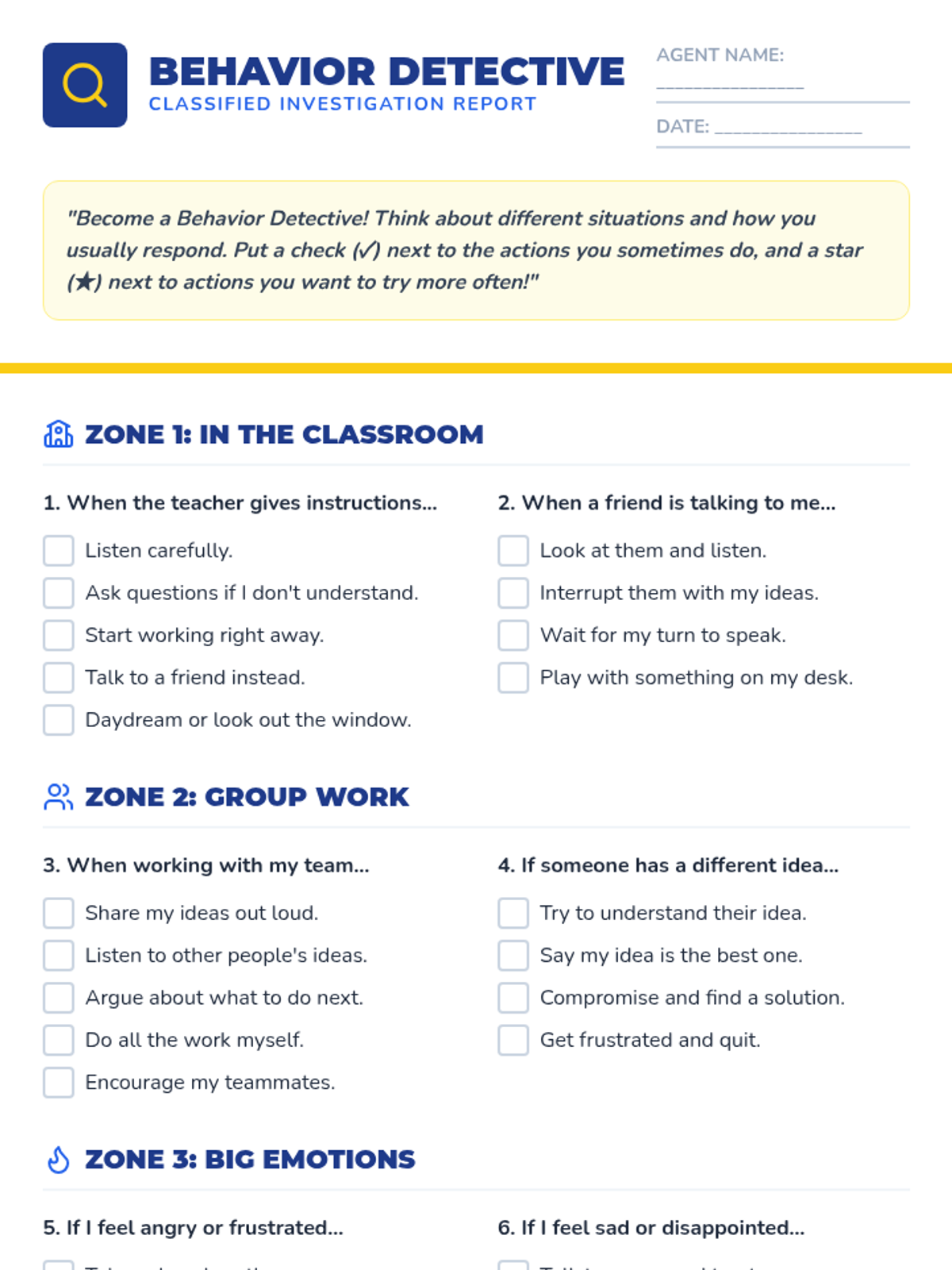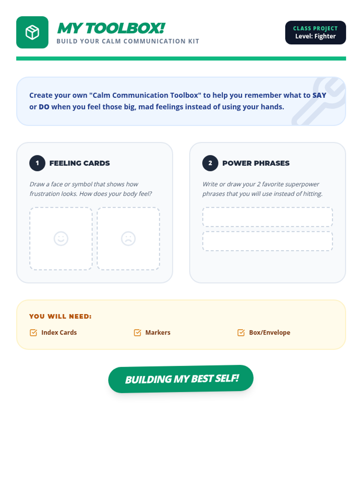 A lesson designed to help students distinguish between Small and Big Problems and choose safe regulation strategies instead of physical reactions. It includes a social story, practice worksheet, and strategy reference guide.