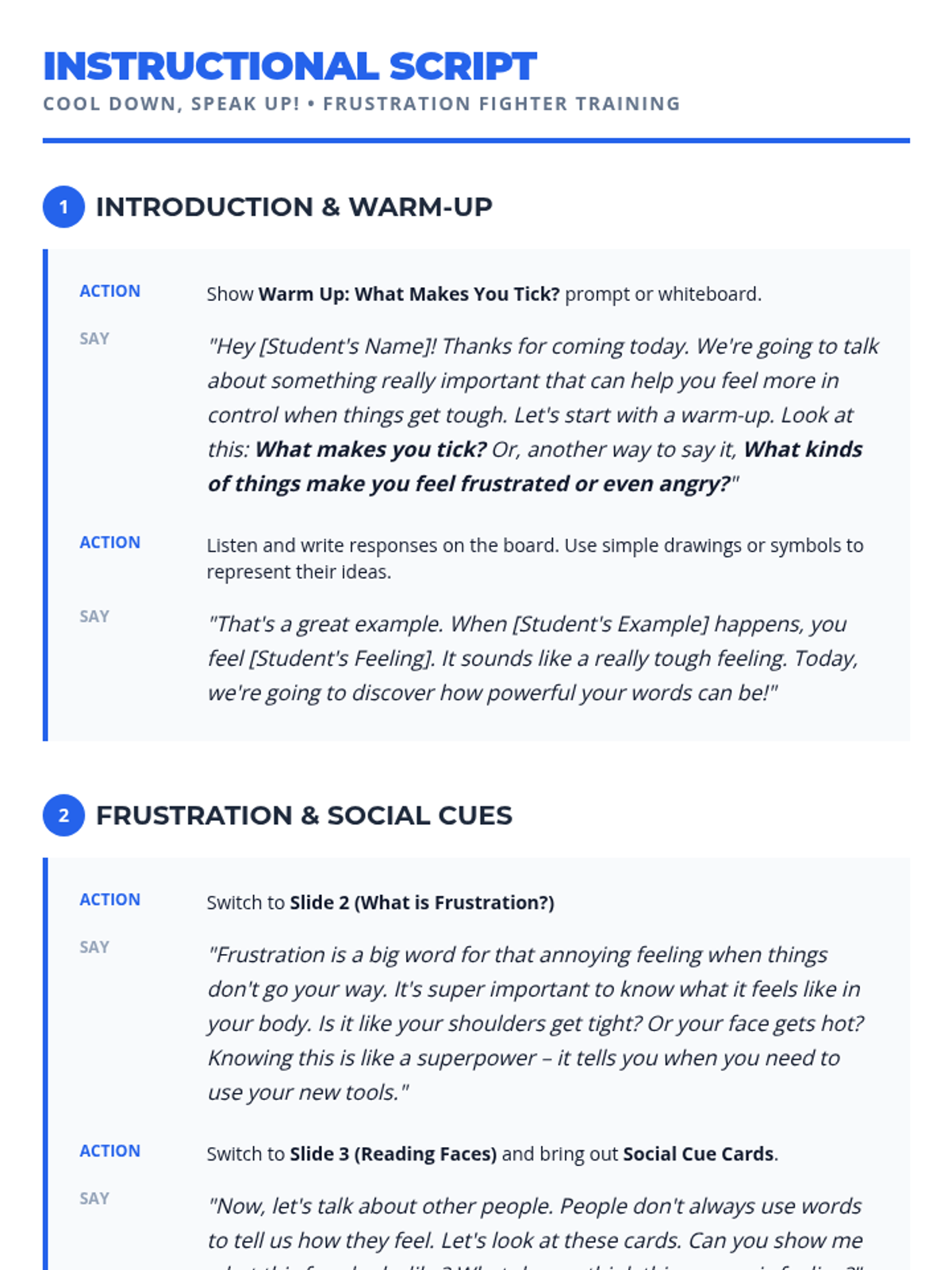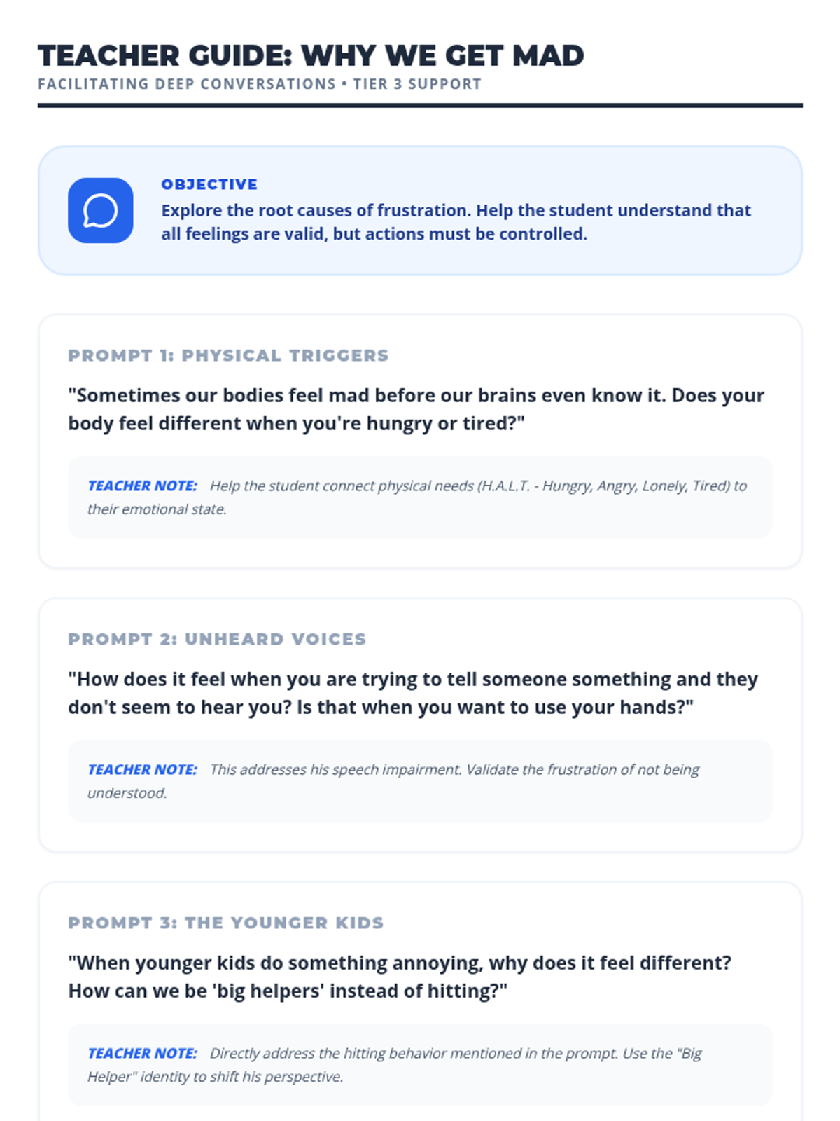 A social-emotional learning lesson designed to help students identify 'big feelings' and practice safe replacement behaviors for physical aggression. Includes a narrative story, situational practice, and a personalized reflection plan.
