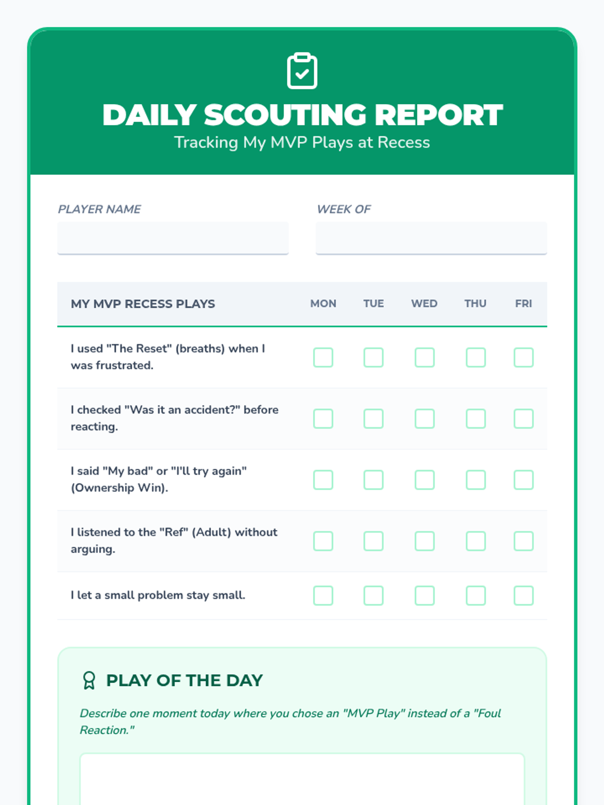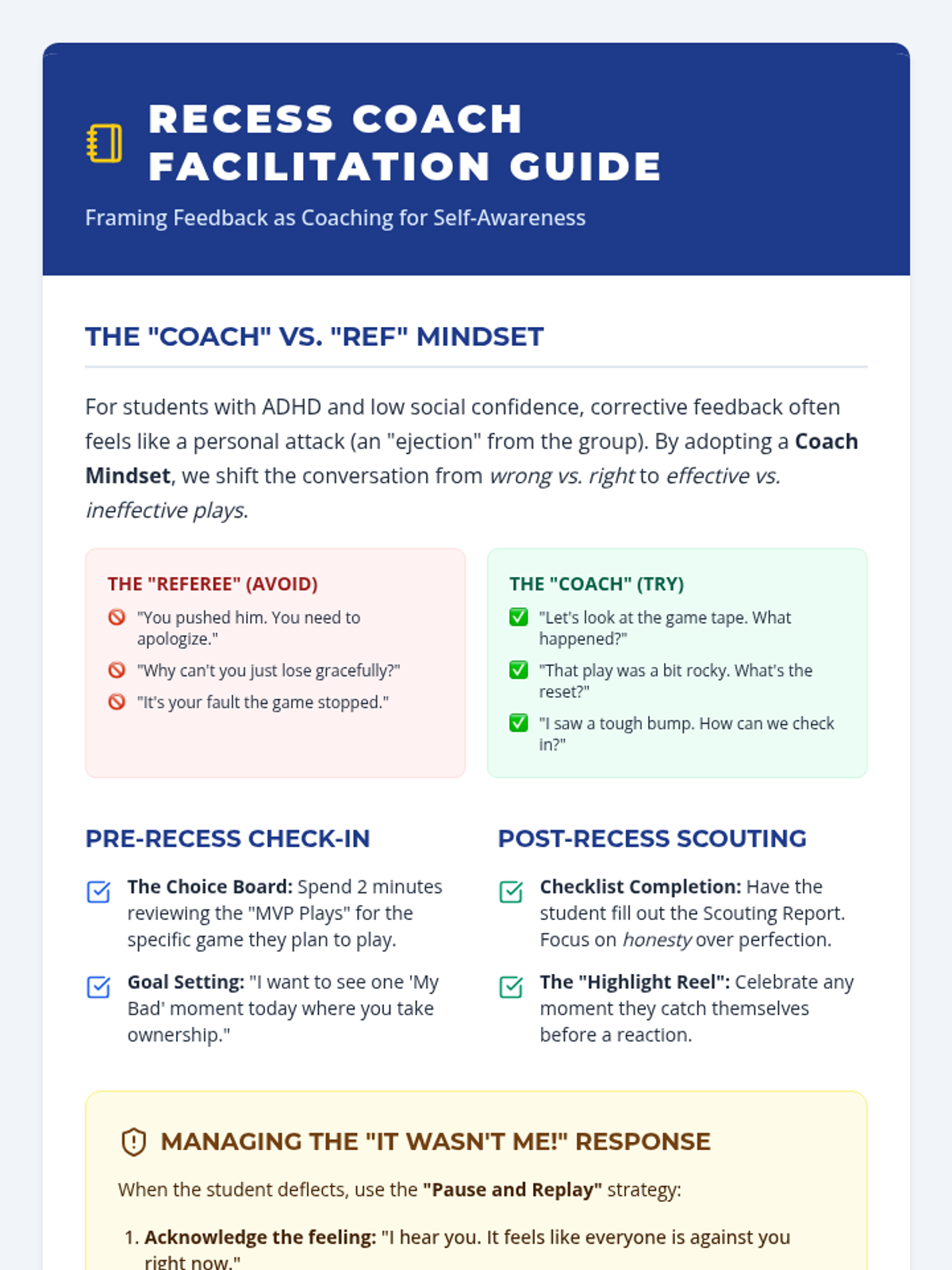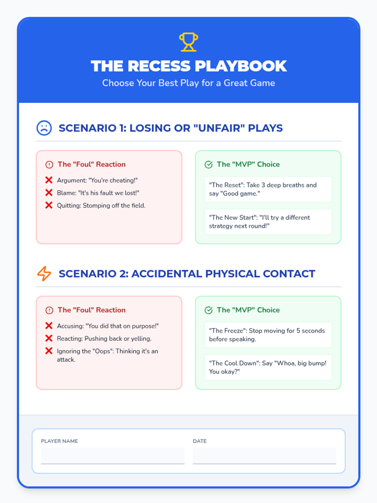 A targeted intervention lesson designed for a 3rd-grade student to build self-awareness during recess. Using a 'Recess Playbook' sports theme, it frames social interactions as 'plays' to help manage reactions to losing, perceived unfairness, and accidental contact.