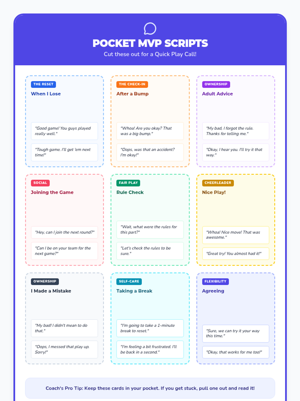 Students are introduced to the concept of the 'Brain Coach'—the part of the mind that directs action. They classify statements as either 'Coach' talk (directive, encouraging) or 'Spectator' talk (passive, observational).