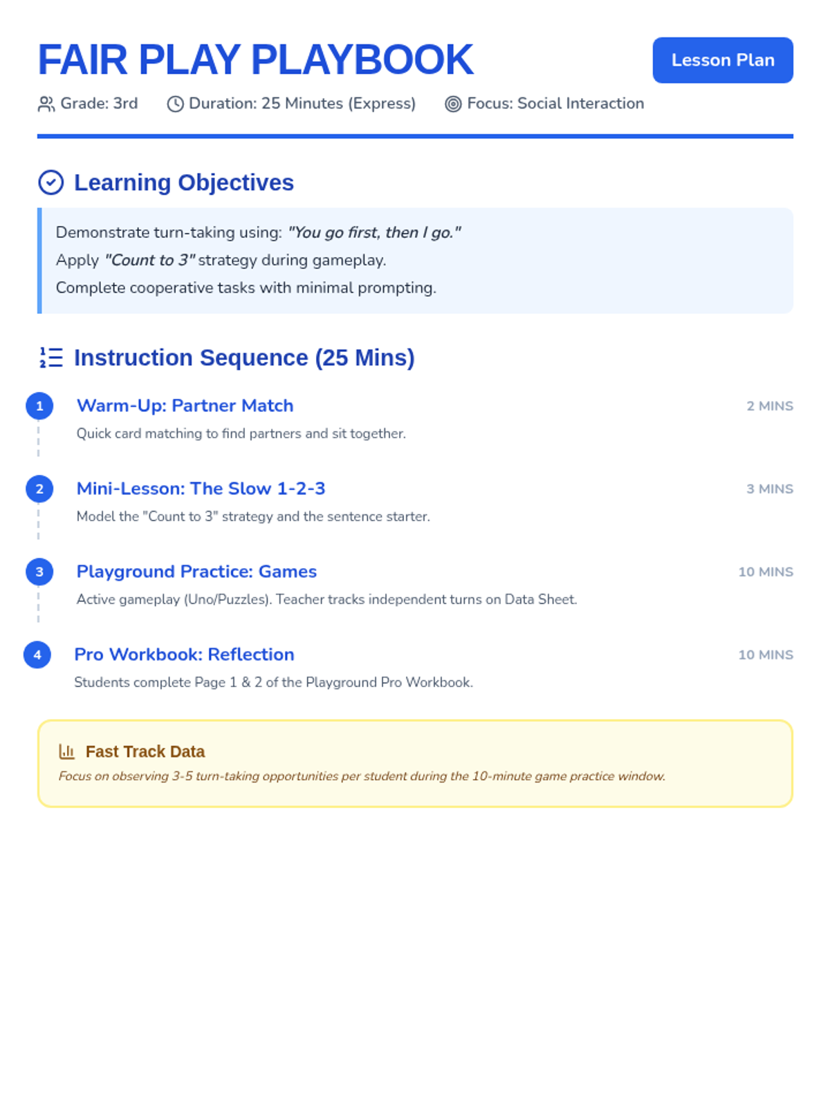 A comprehensive social skills lesson for 3rd graders focused on sharing, turn-taking, and cooperative play during recess-style activities. Includes strategies for waiting and fair play dialogue.