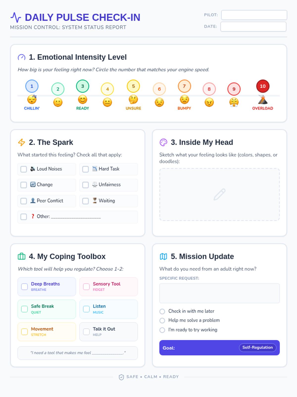 A targeted intervention for a fast-paced student to manage impulsivity, recognize triggers, and maintain 'safe mode' through a pilot-themed self-regulation framework.