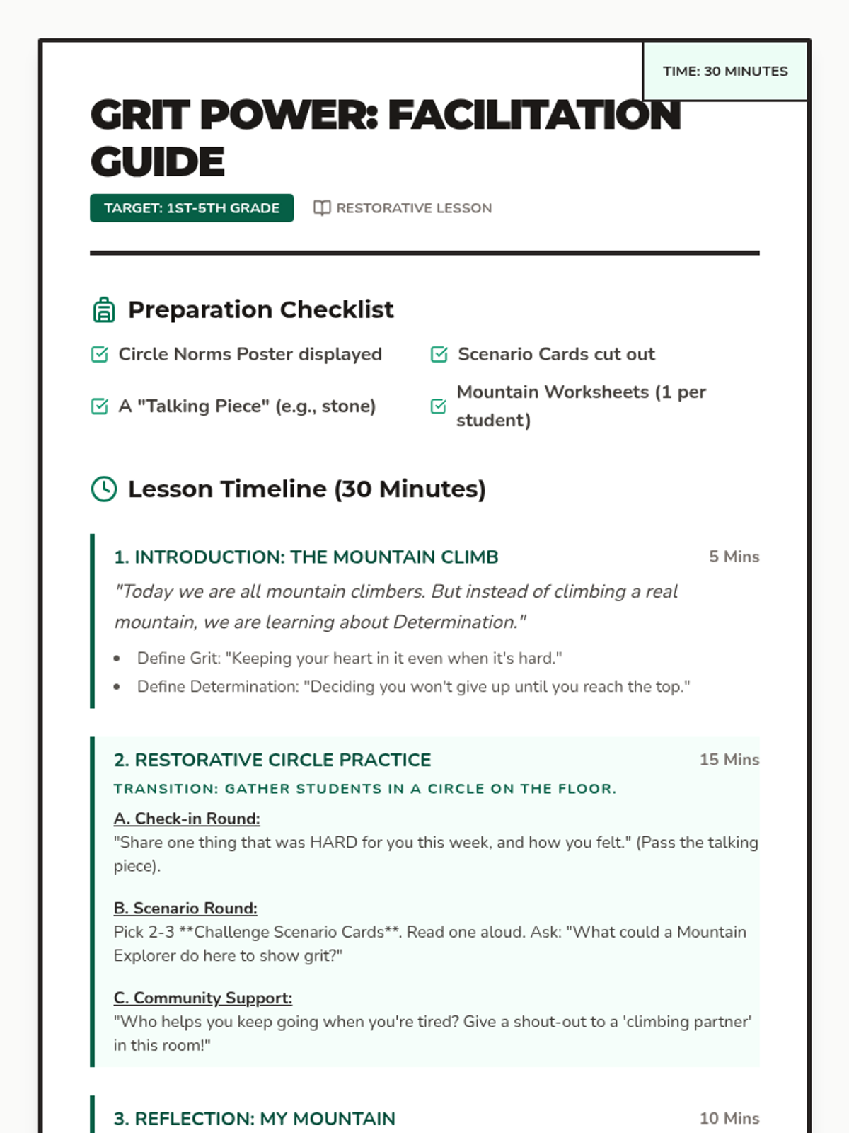 A 30-minute restorative lesson on determination for elementary students, focusing on persistence, goal-setting, and community support through a restorative circle.