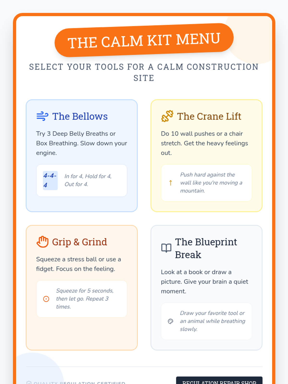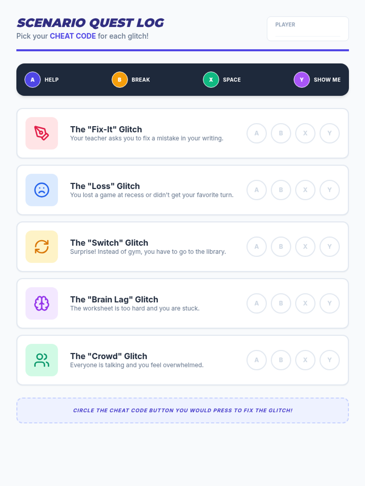 A social-emotional lesson focused on identifying internal signals of anxiety and selecting appropriate self-regulation tools. Students will learn to recognize 'glitches' in their system and deploy 'countermeasures' to stay on track.