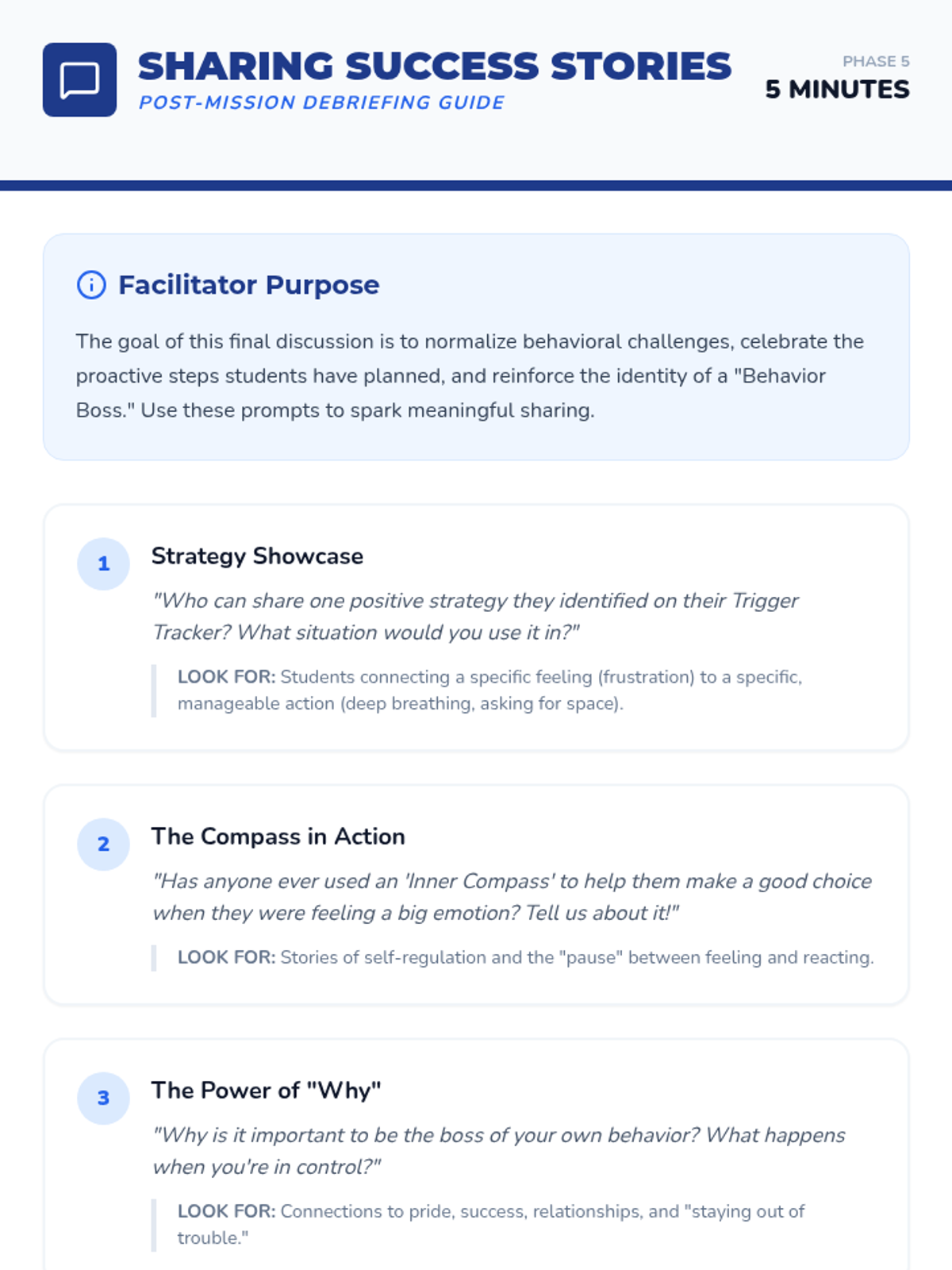 Students master a 2-minute 'Re-entry Interview' protocol to formalize the end of a dysregulation cycle and communicate their readiness to teachers and peers.