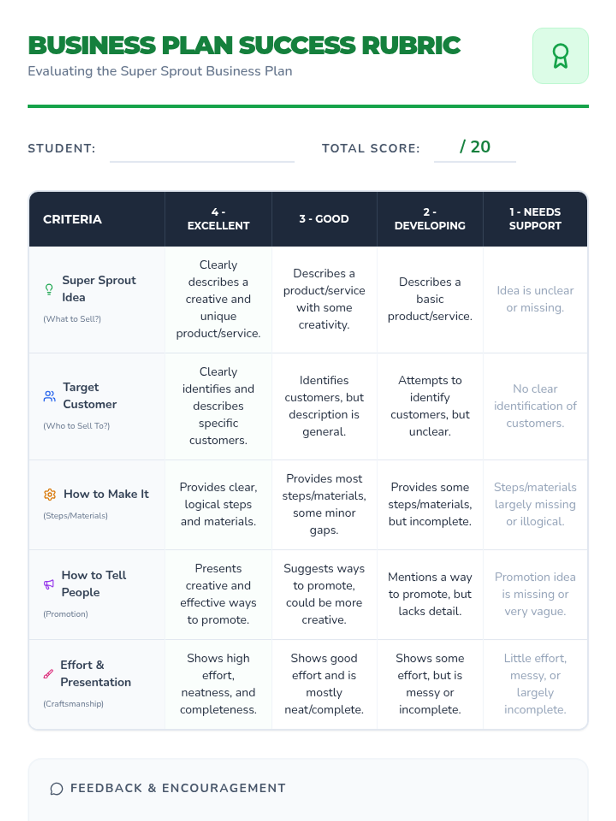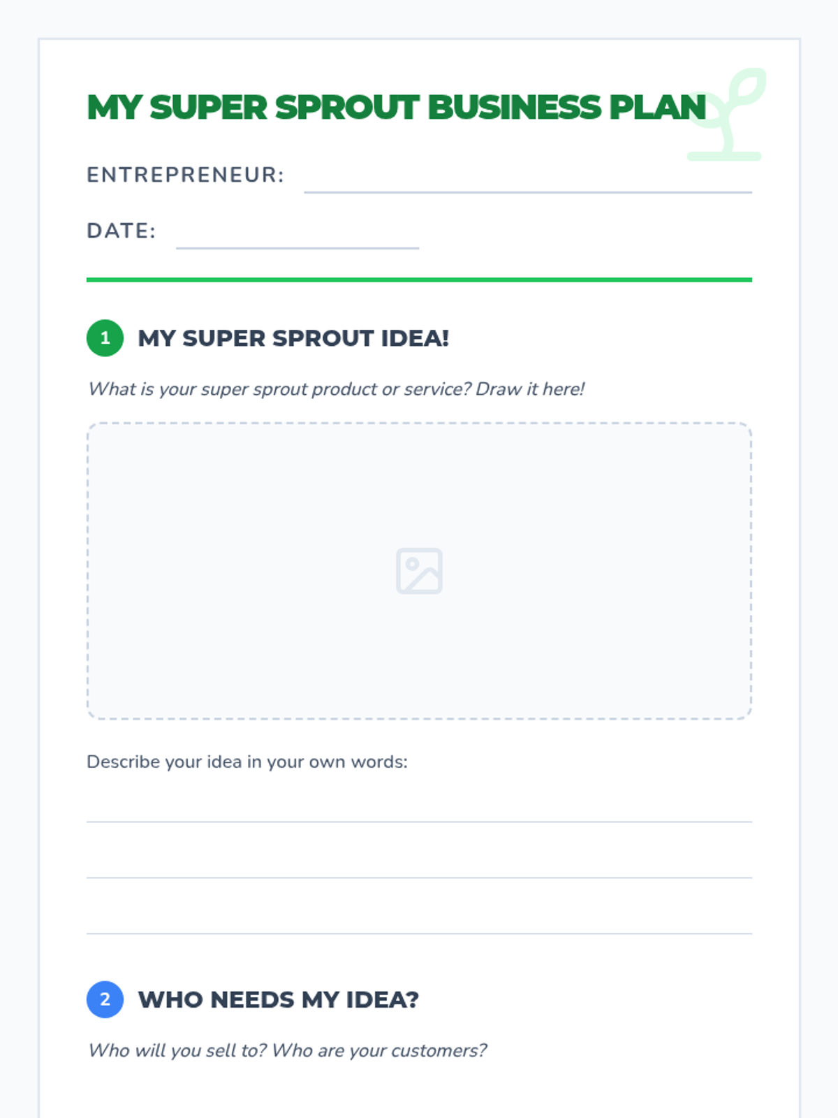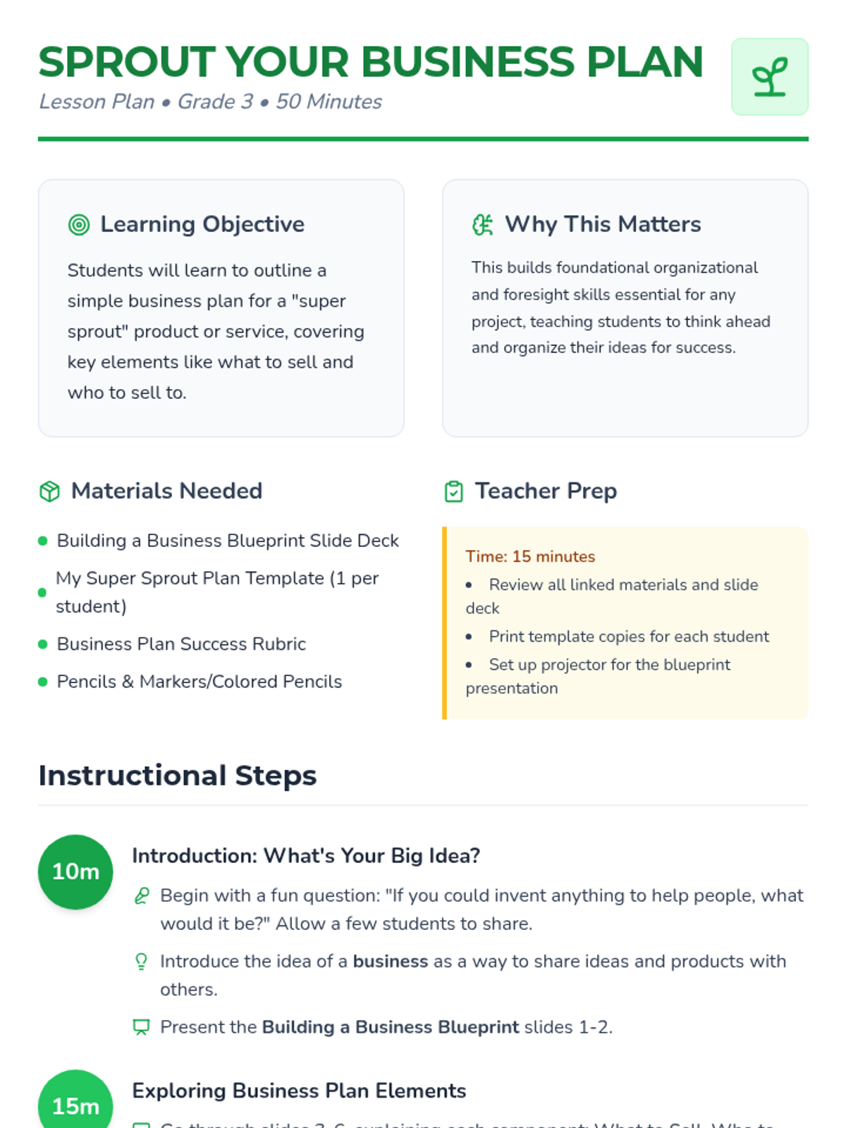 Students will learn to outline a simple business plan for a 'super sprout' product or service, covering key elements like what to sell and who to sell to. This builds foundational organizational and foresight skills essential for any project.