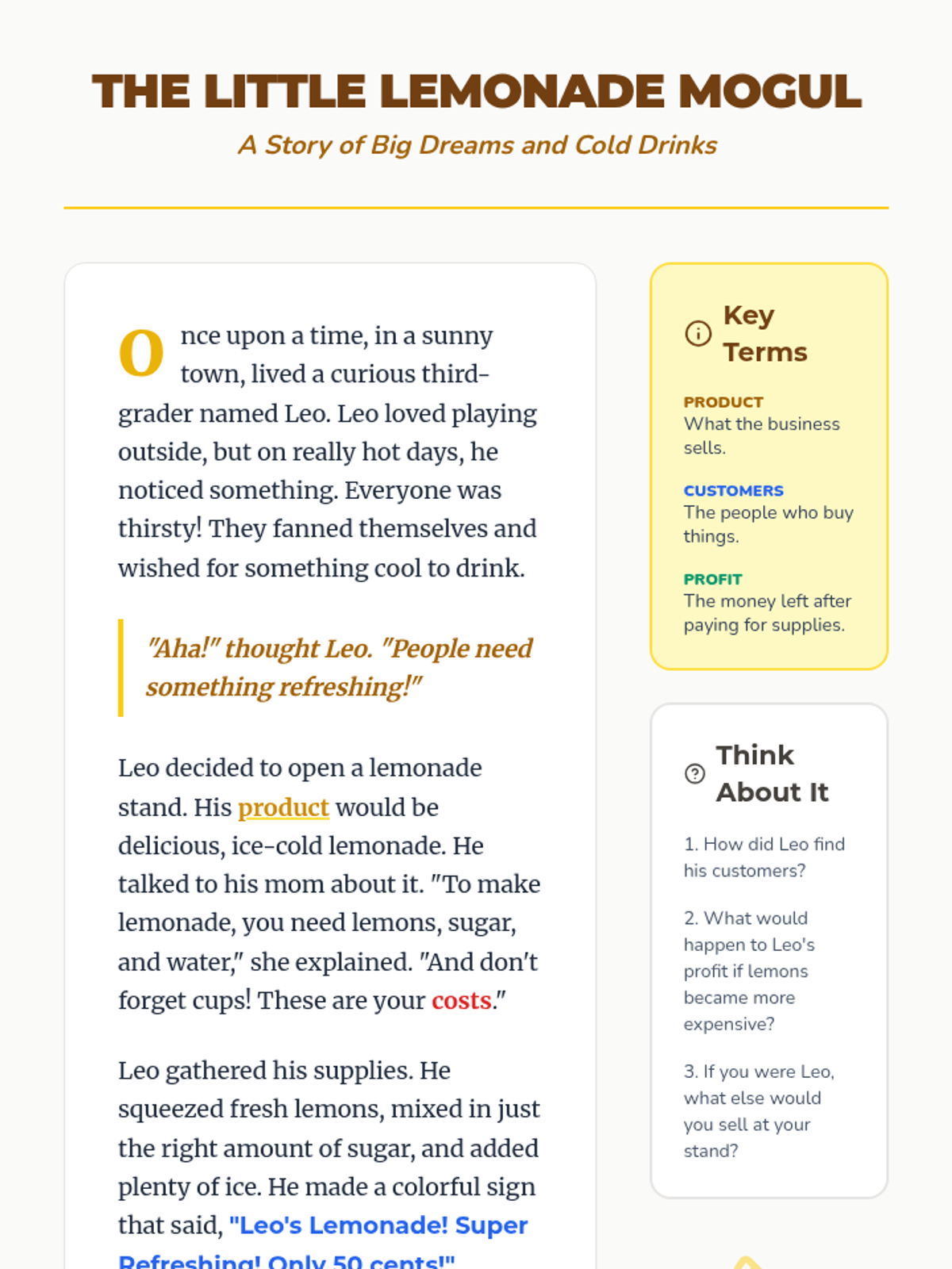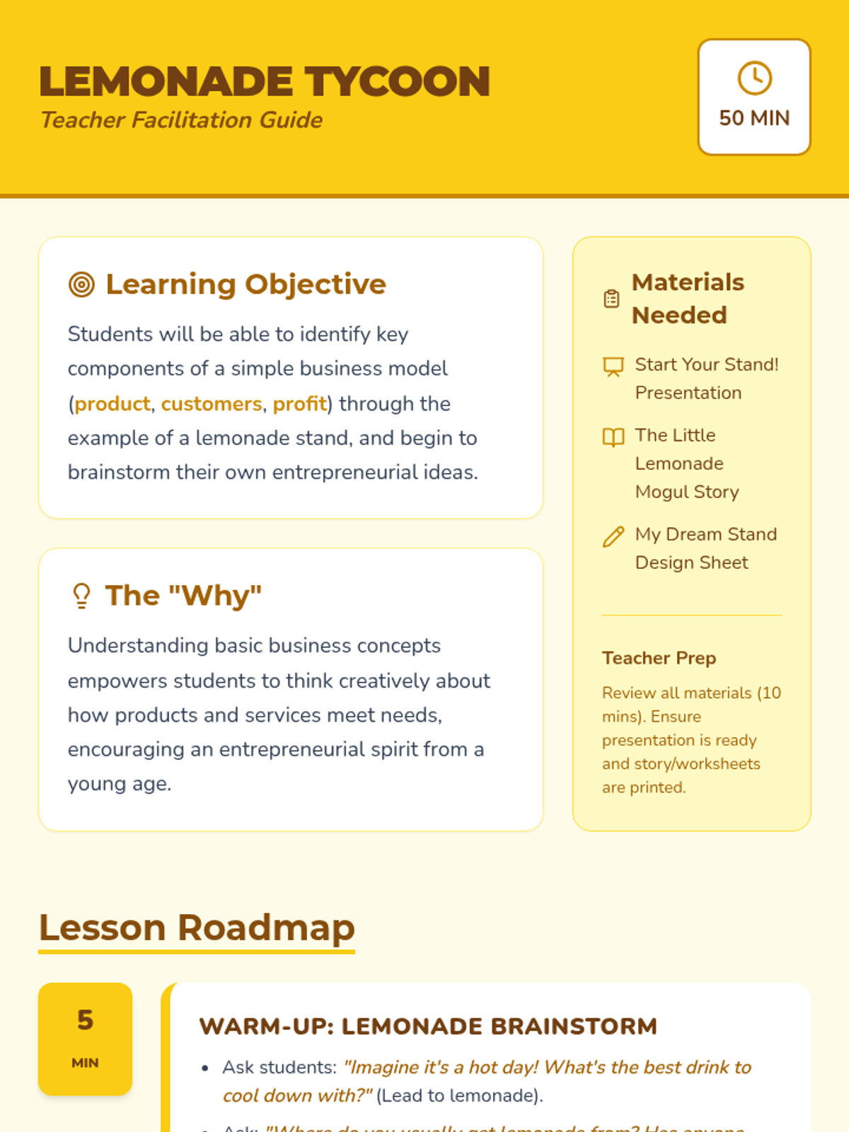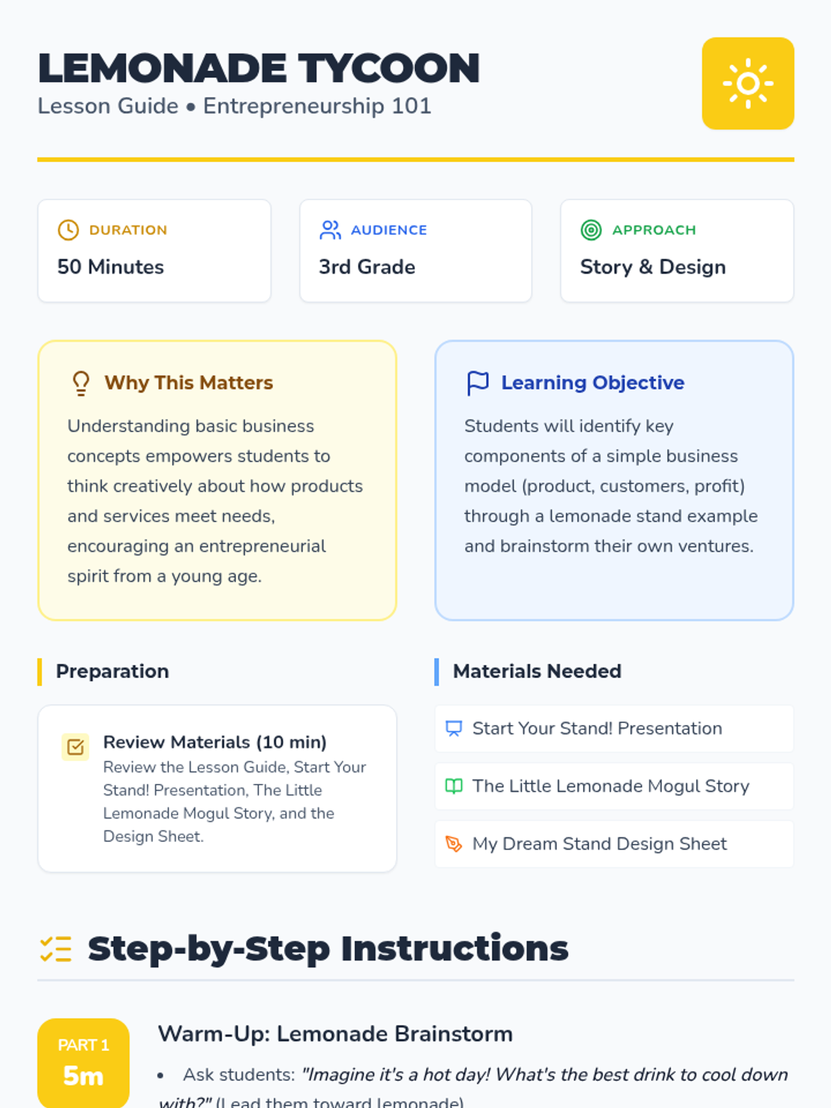 A 50-minute introductory lesson for 3rd graders on basic business concepts (product, customers, profit) using the classic lemonade stand model. Students explore these ideas through a story, a presentation, and a creative design activity.
