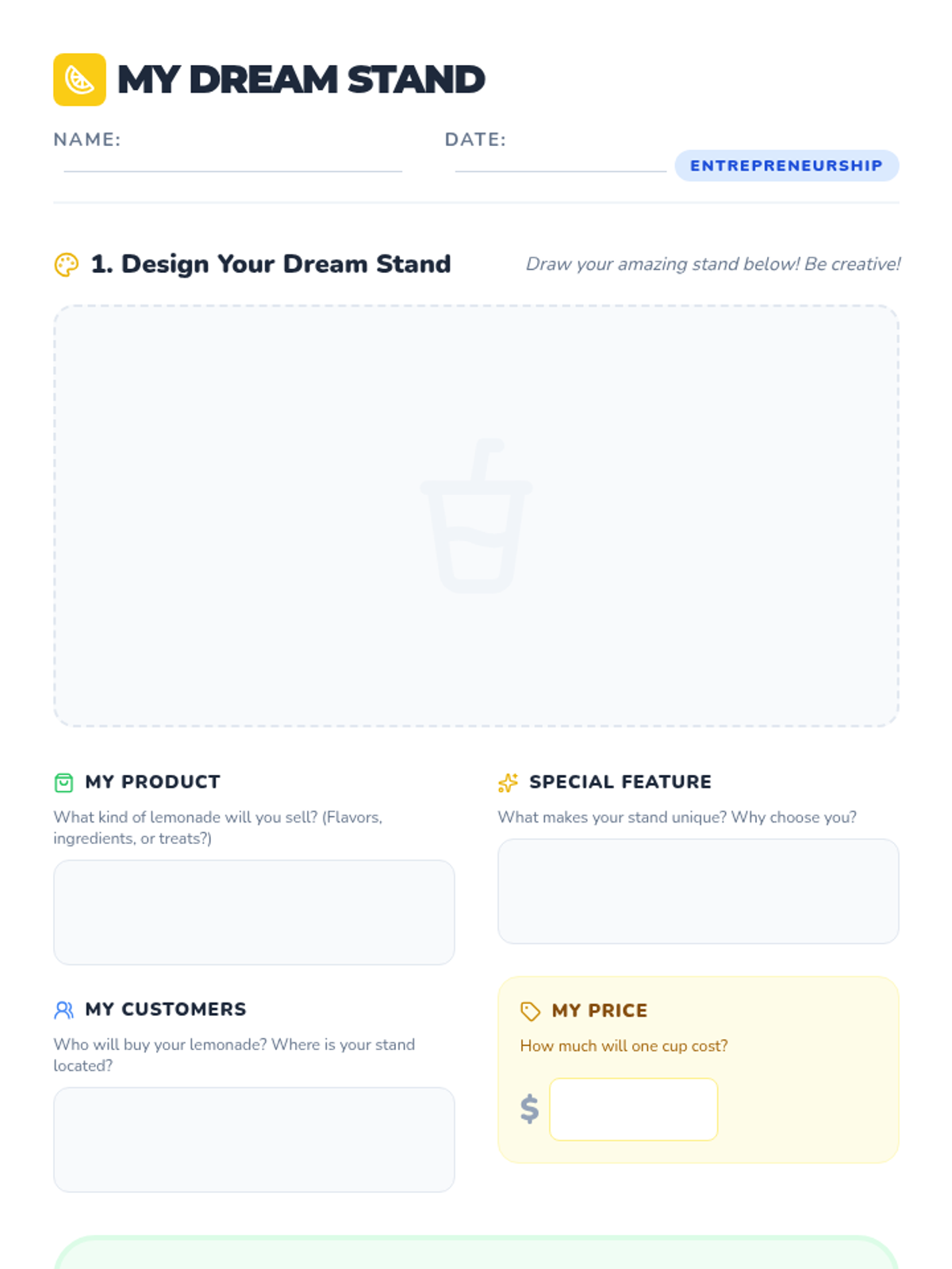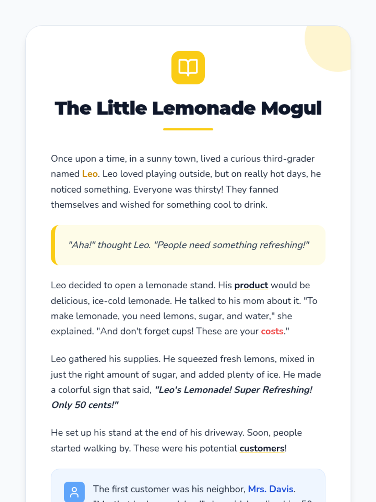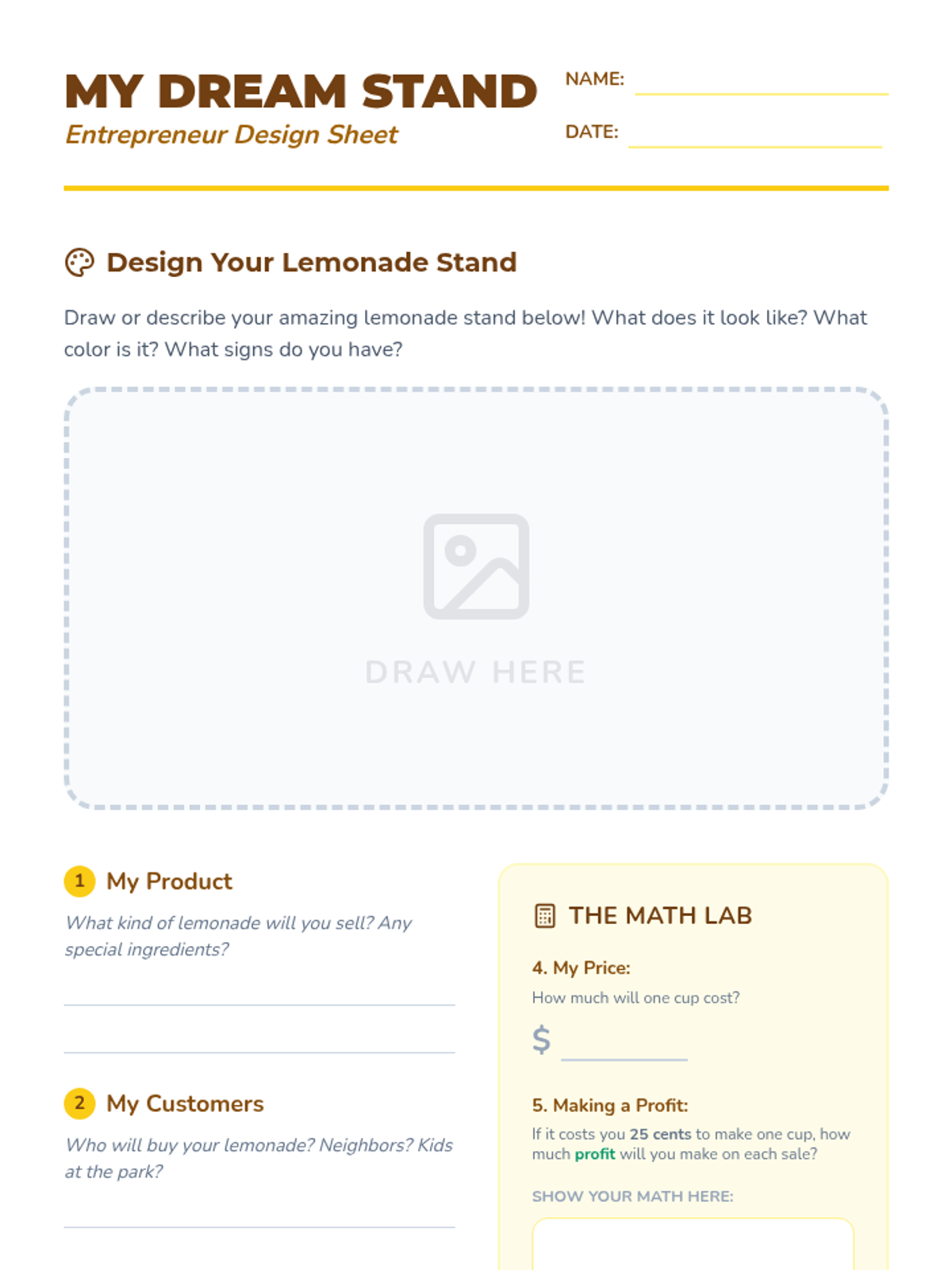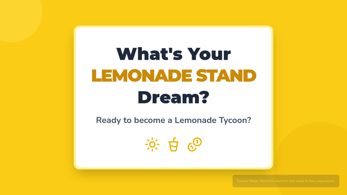 A 50-minute introductory lesson for 3rd graders on basic business concepts (product, customers, profit) using the classic lemonade stand model. Students explore these ideas through a story, a presentation, and a creative design activity.