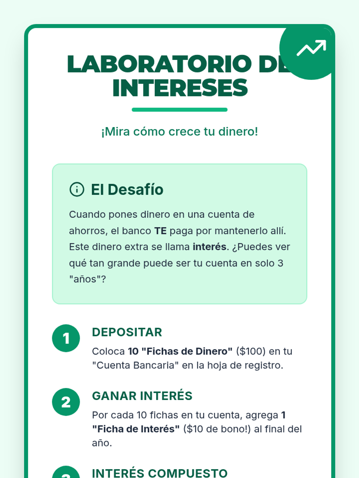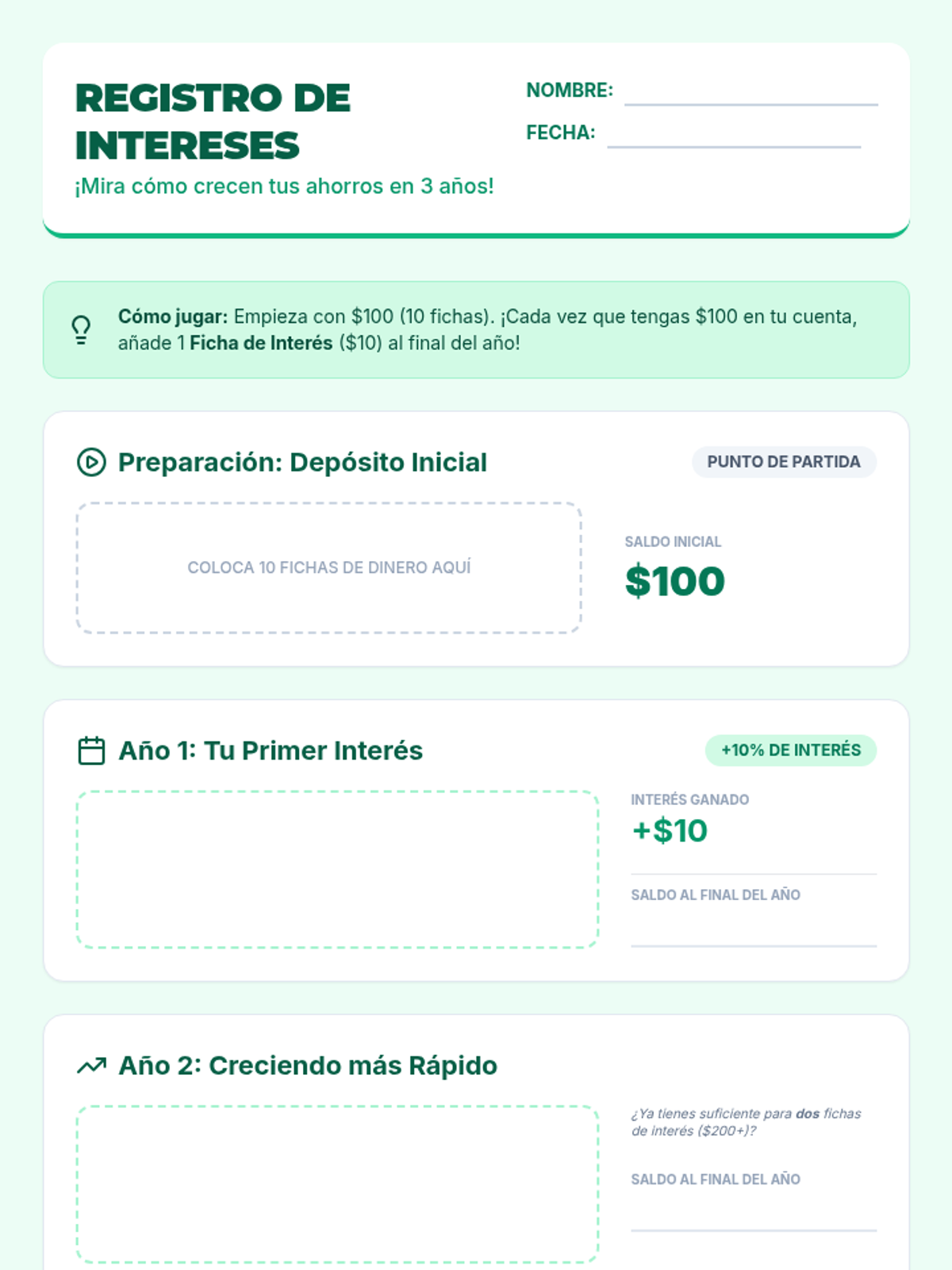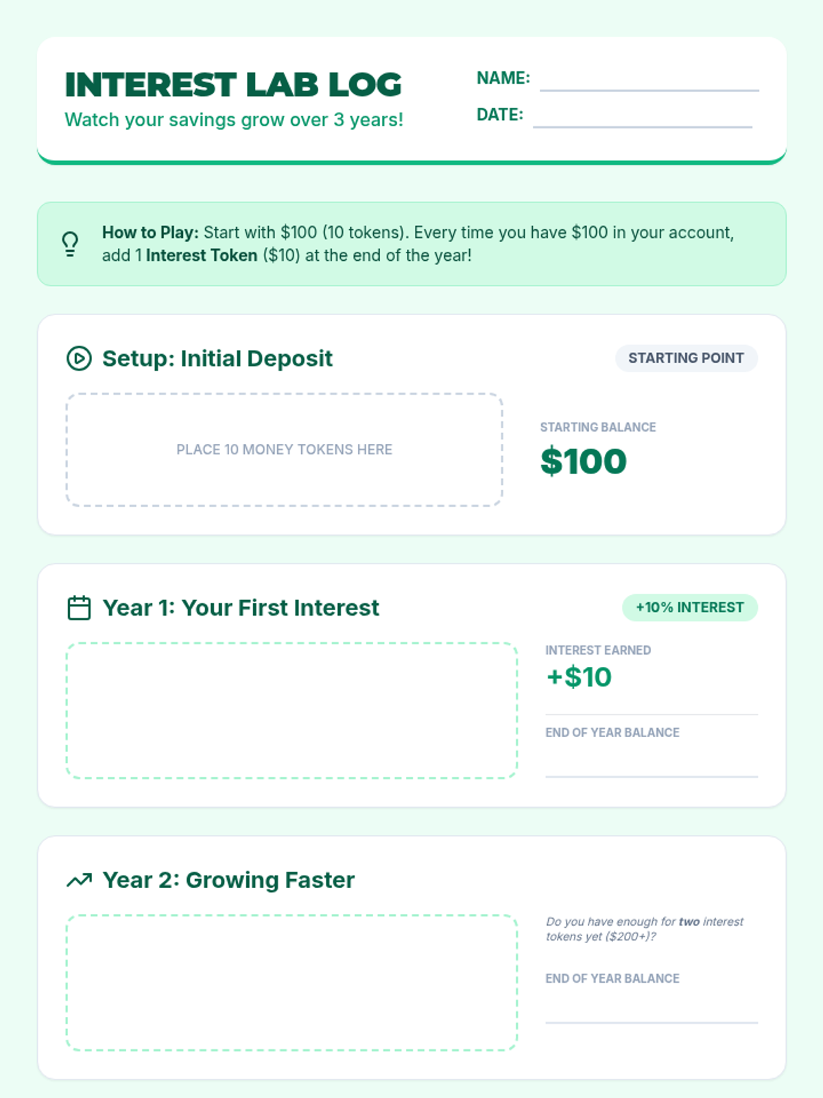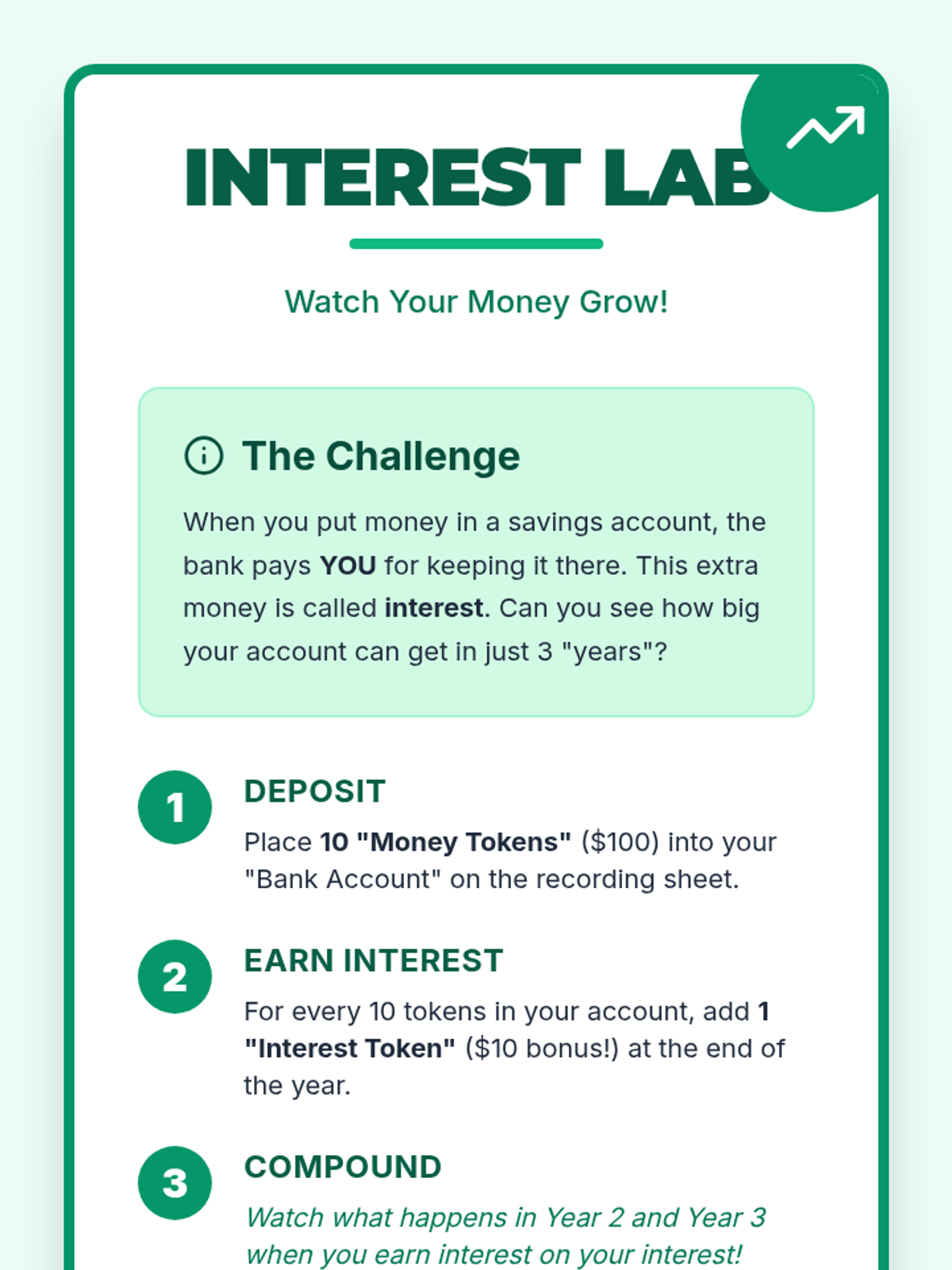 A hands-on workshop where students simulate interest growth using counters. They track their 'money' as it increases every few minutes.