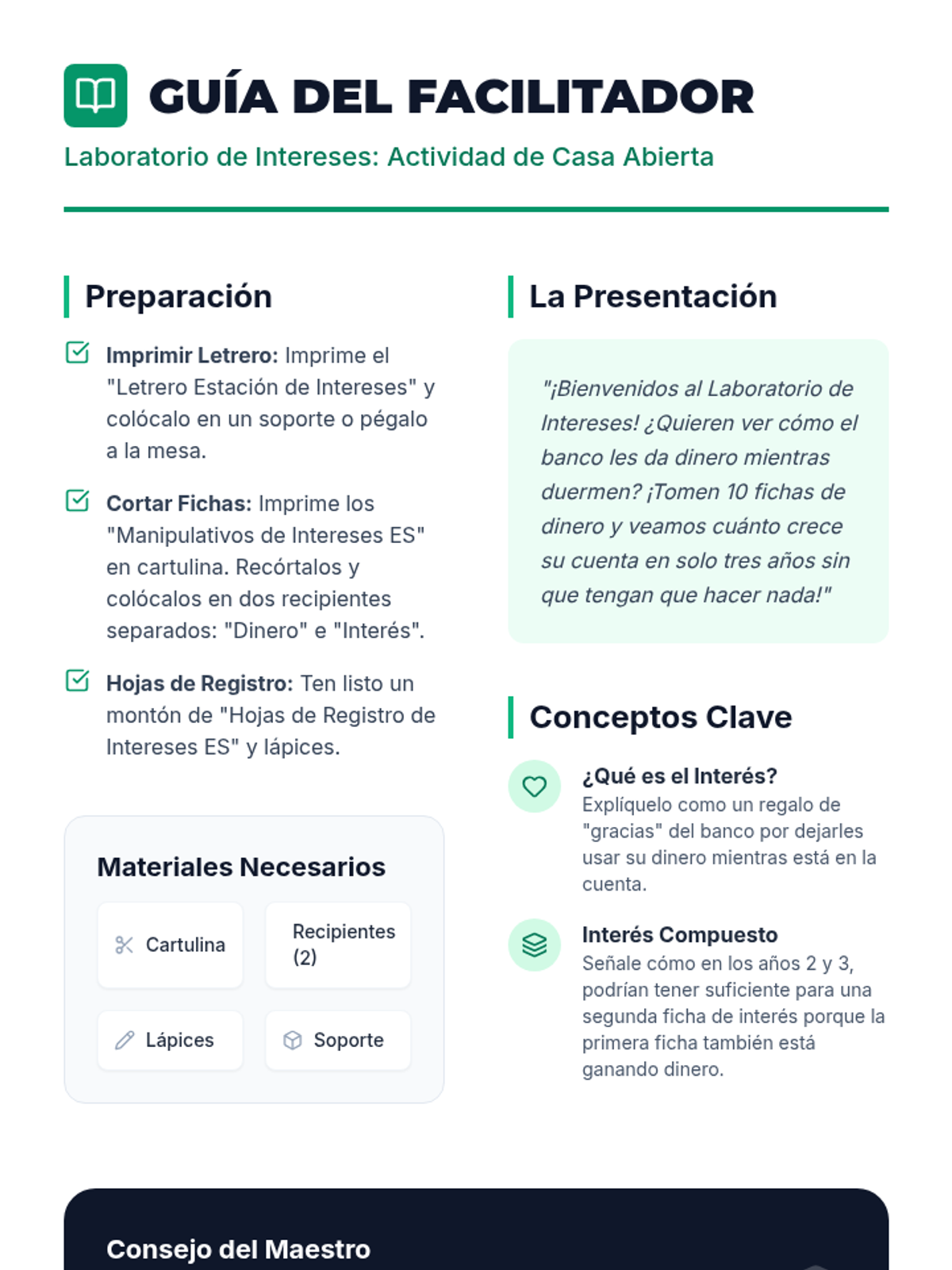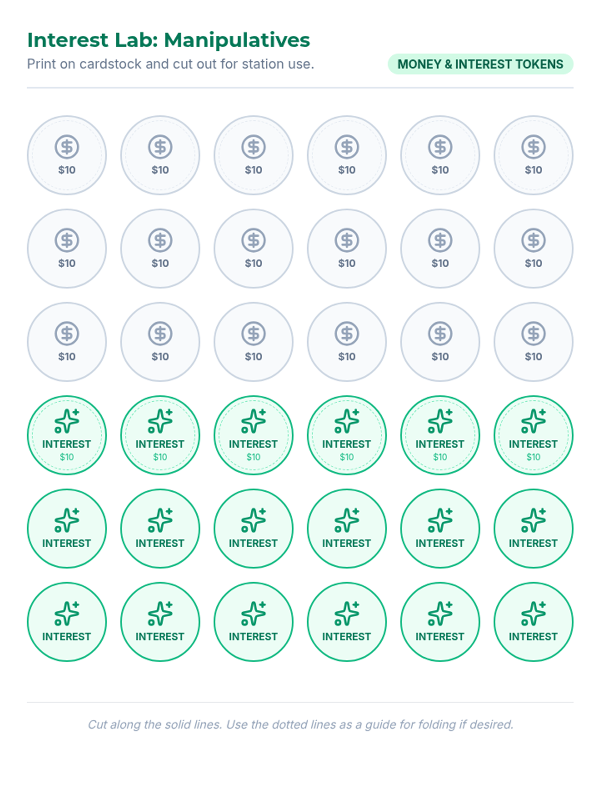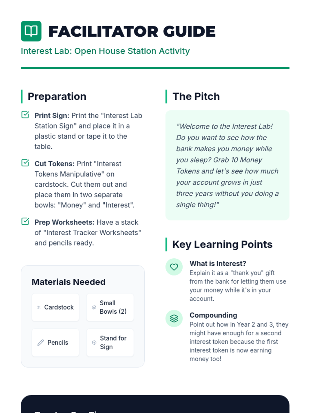 A hands-on station activity designed for an Open House where students and parents explore how bank interest helps money grow over time using printable manipulatives.